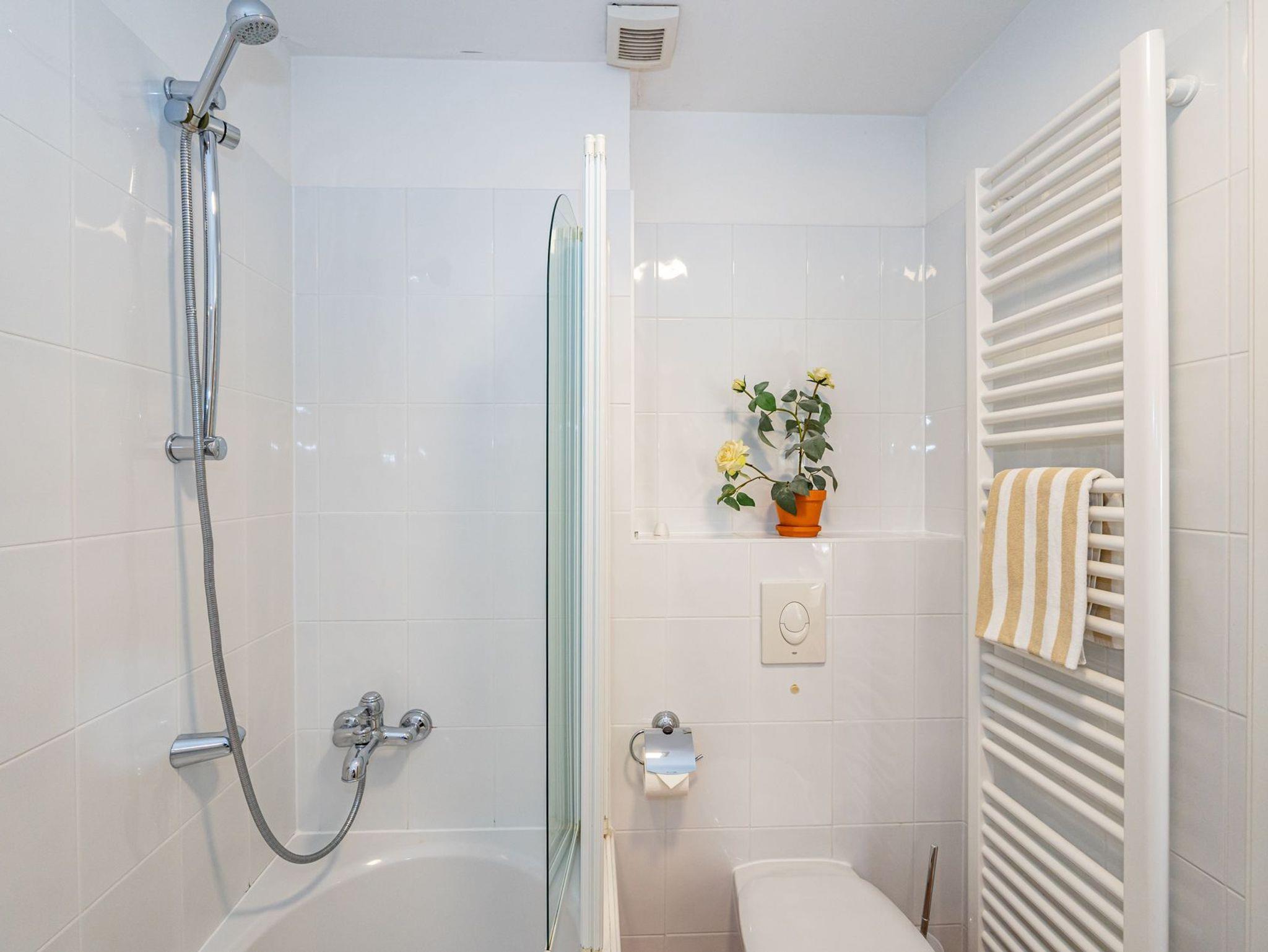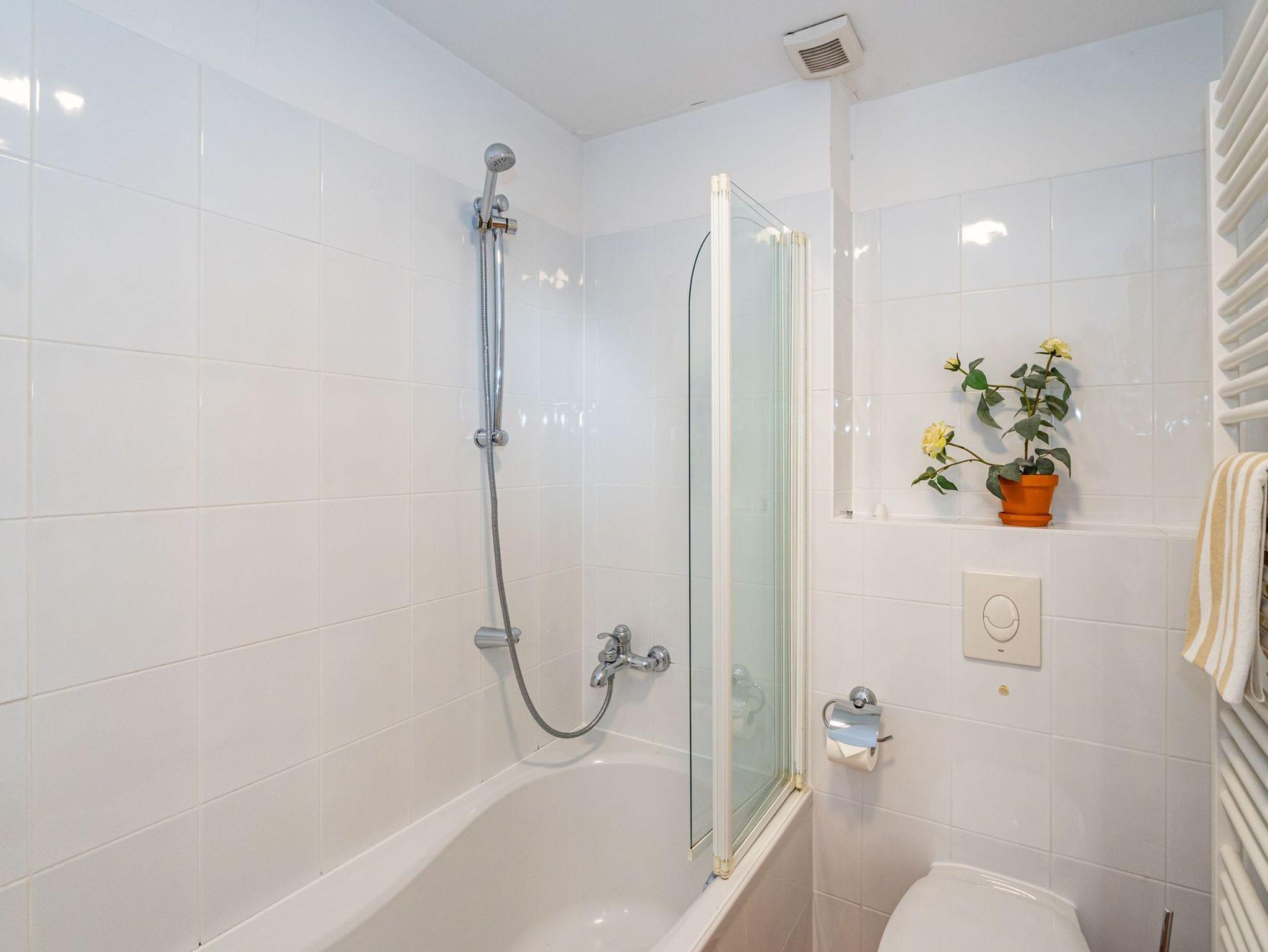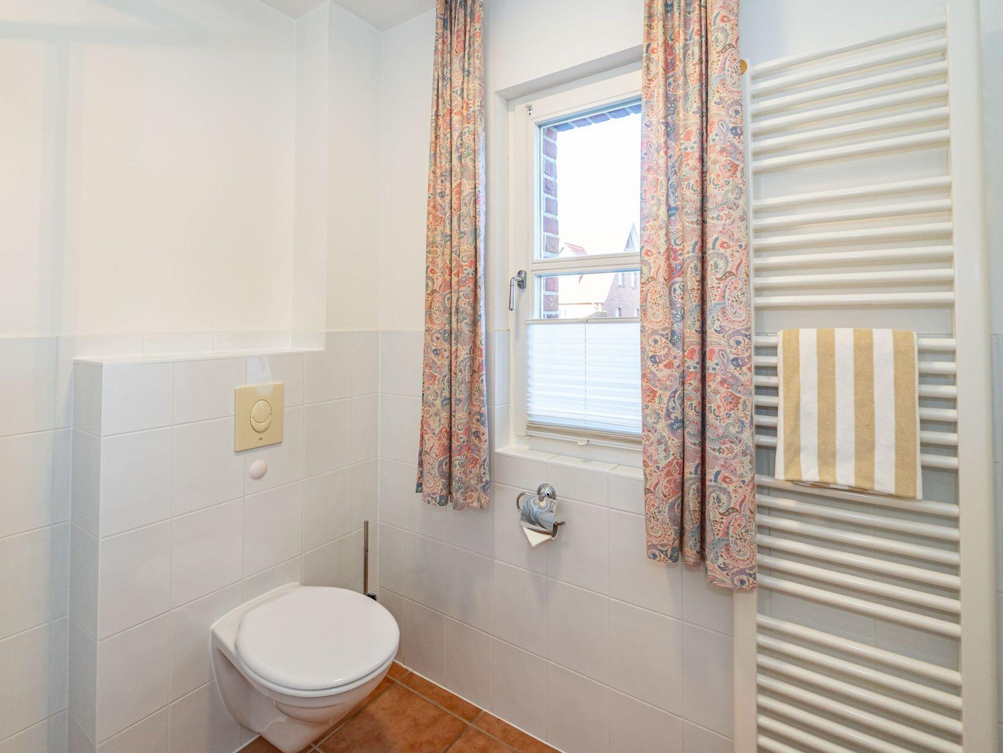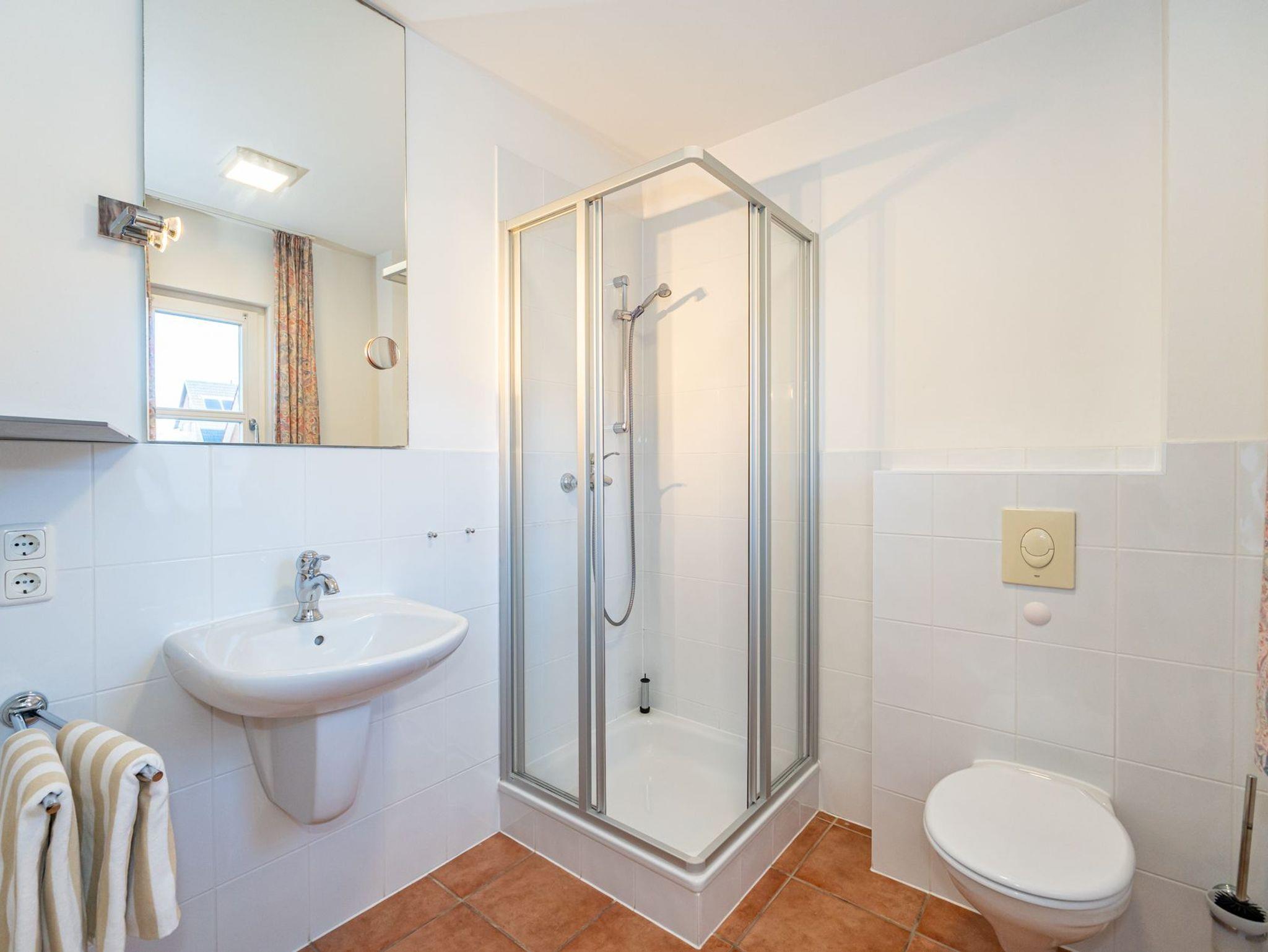 Das helle Duschbad mit Fenster ist mit Dusche, Waschtisch, Handtuchtrockner, WC und Fön ausgestattet.
