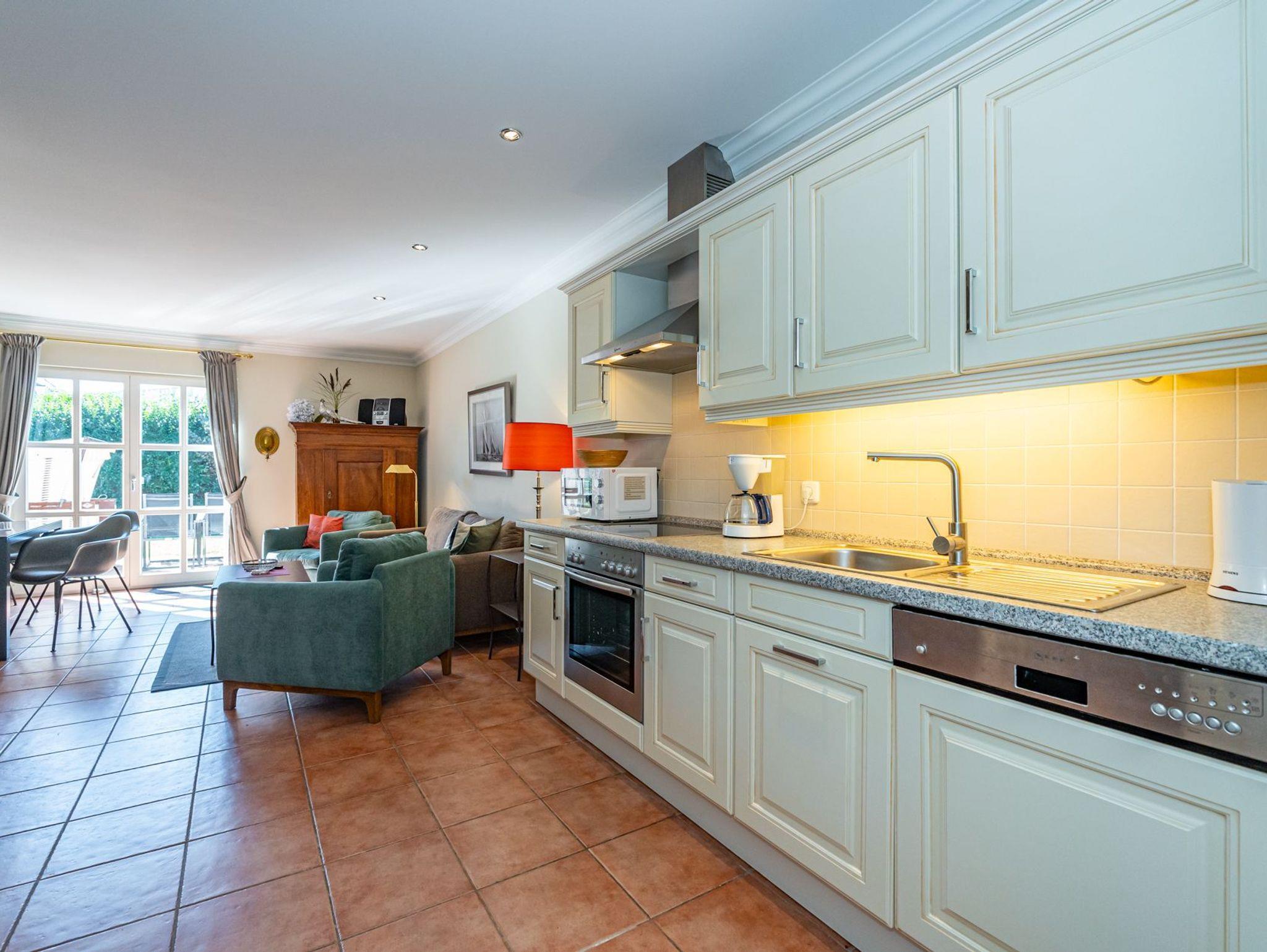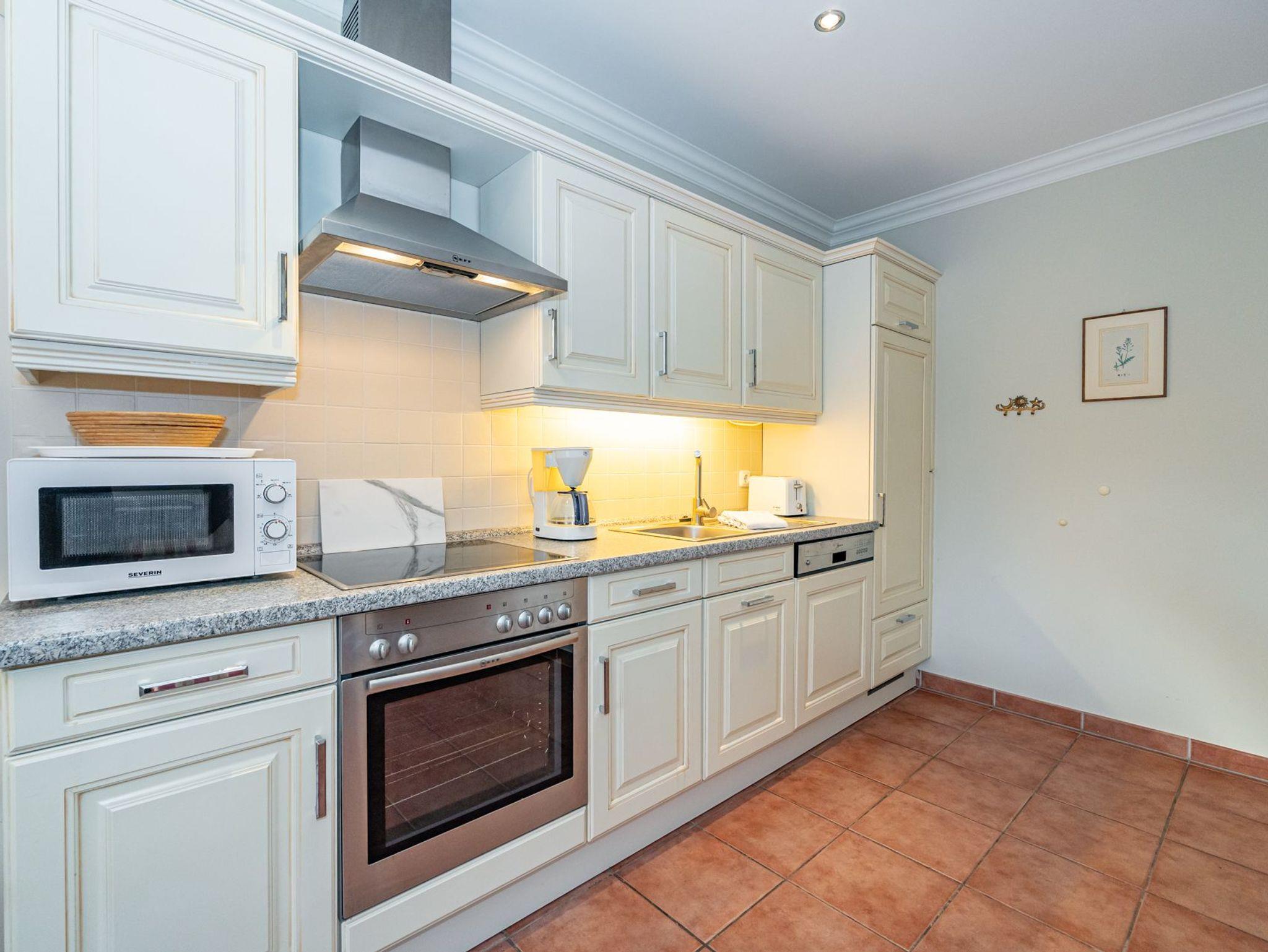 Die offene, vollausgestattete Einbauküche hat einen Geschirrspüler, einen Herd mit Backofen, 4-Platten-Ceranfeld, Mikrowelle sowie einen Kühlschrank mit 3-Sterne-Gefrierfach.