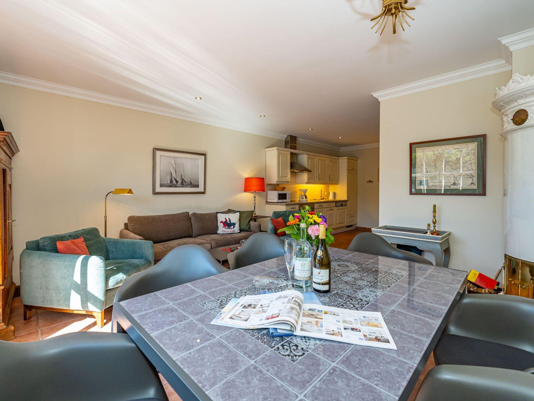 Das Wohnzimmer ist mit einer gemütlichen Couchgarnitur (Zweisitzer-Couch und zwei urgemütliche Ohrensessel), Essplatz für 6 Personen, weißem antiken Kachelofen, großem Kabel-Flachbild-TV, Radio/CD-Player und einer cremefarbenen Küche im Landhausstil ausgestattet. Kostenlose Internetnutzung per W-Lan (ohne Gewähr).