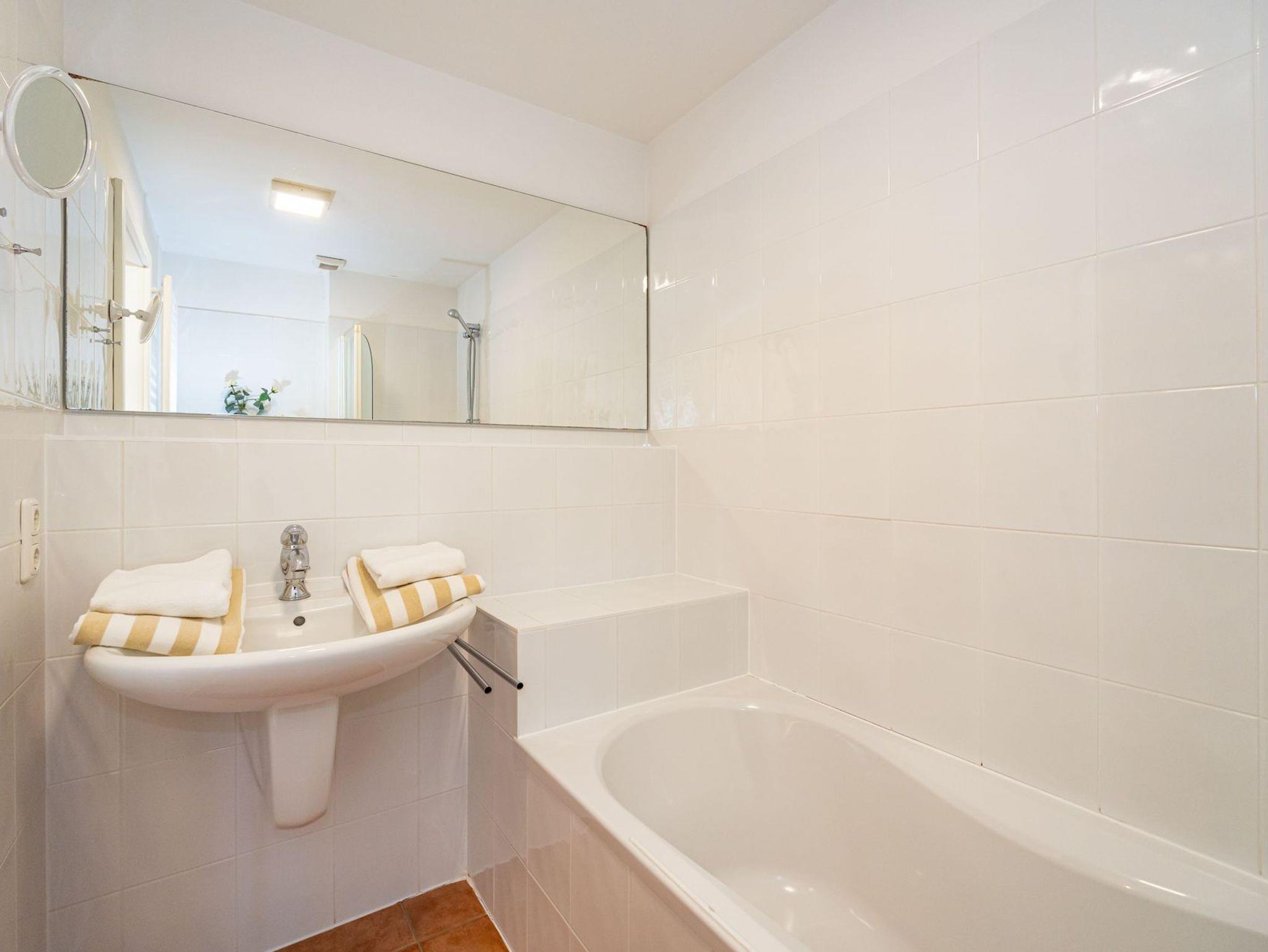 Das zweite Badezimmer besitzt eine Badewanne mit Duschvorrichtung, Waschtisch, Handtuchtrockner, WC und Fön.