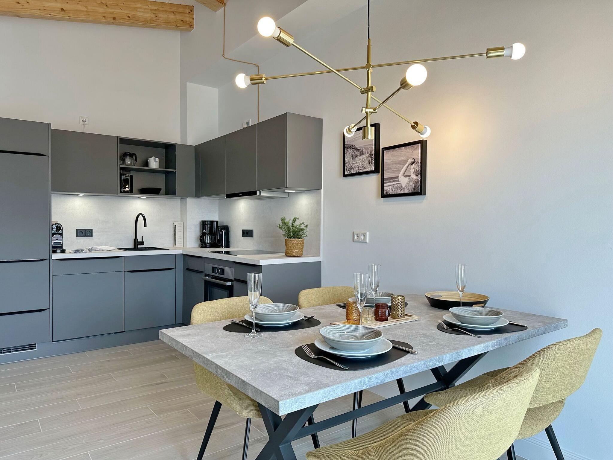 Die hochwertige 3-Zimmer-Wohnung im 3. OG mit ca. 79 qm ist für maximal 4 Personen. Vom geräumigen Flur mit Garderobe gelangen Sie in das Wohnzimmer mit offener Küche und möblierten Westbalkon. Die hochwertige Küche bietet neben Induktionsherd auch Geschirrspüler, Kühlschrank mit Gefrierfach und Backofen mit integrierter Mikrowelle. Beide Schlafräume bieten mit Boxspringbetten (160x200) der Marke FBF hochwertigen Schlafkomfort und verfügen über Einbauschrank und TV (1 Kinderbett im beigen Schlafzimmer zubuchbar). Die Wohnung verfügt über 2 moderne Duschbäder mit Haar- und Handtuchtrockner. Die Wohnung ist mit großformatigen Fliesen ausgelegt und verfügt über Fußbodenheizung. Lediglich die Schlafräume sind mit Teppichware versehen. Internet (ohne Gewähr) und Smart-TV sind vorhanden.