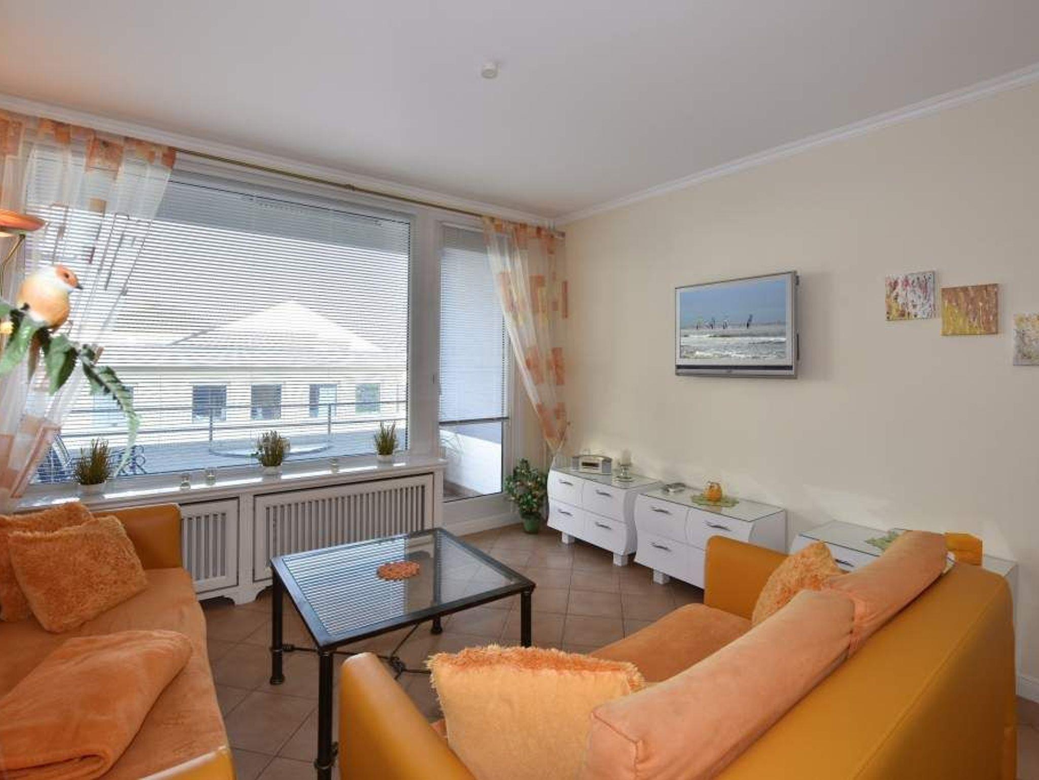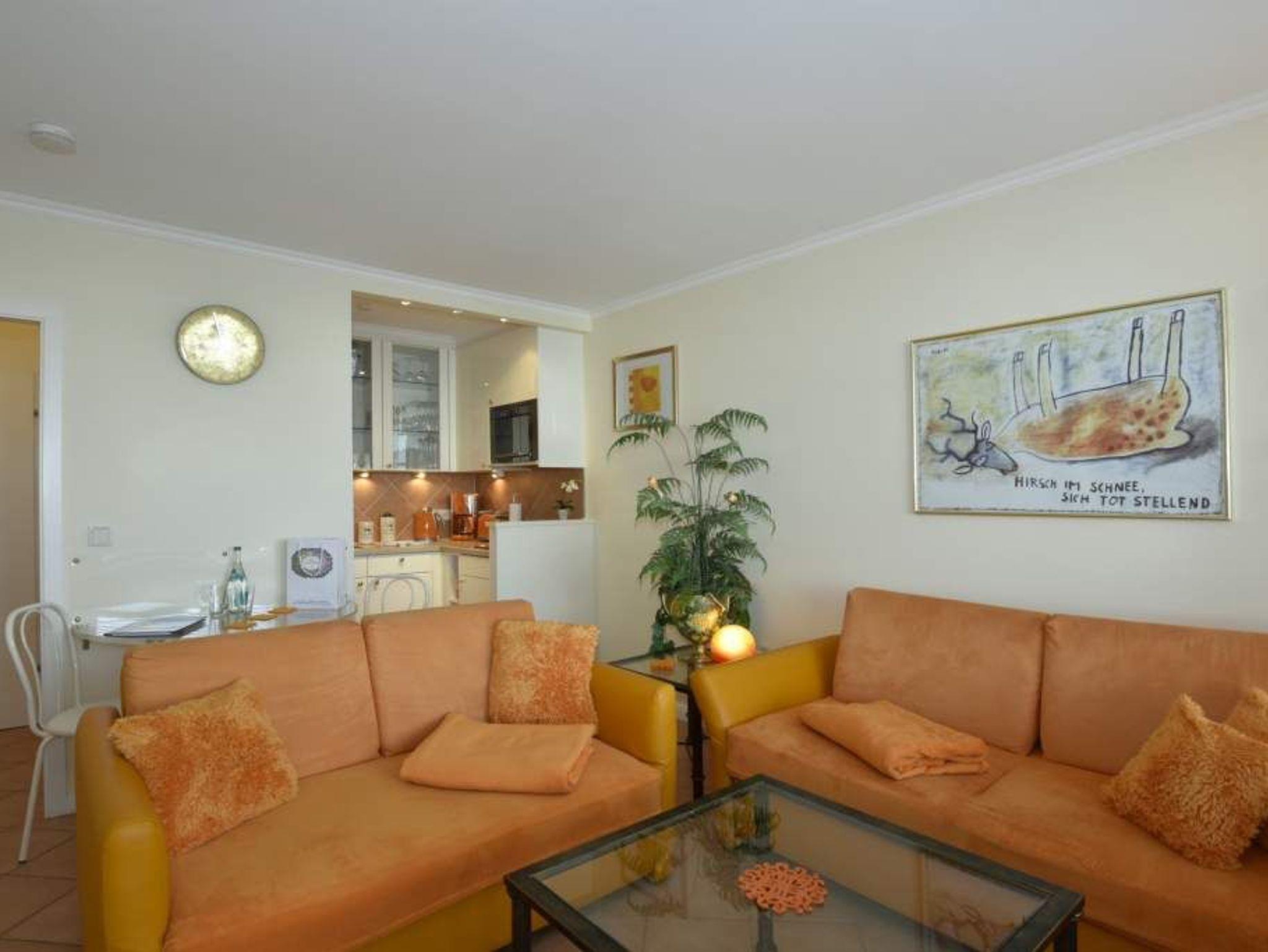 Im Wohnzimmer befinden sich zwei 2-Sitzer-Couchen, eine Essecke, Kabel-Flachbild-TV, iPod-Docking-Station, DSL-Anschluss mit W-Lan, Nordbalkon mit Heizstrahler (0,50 €/30 Min.).