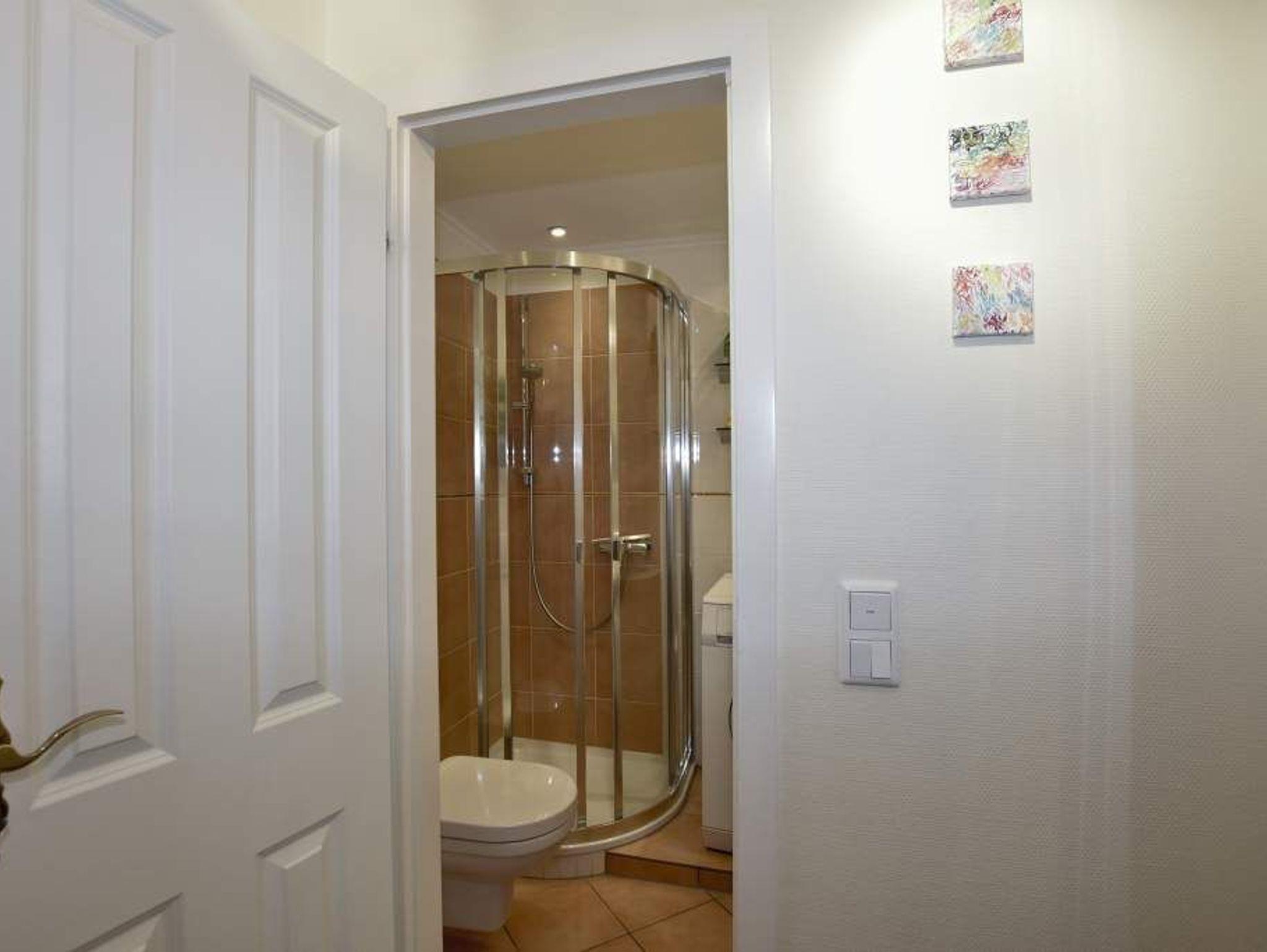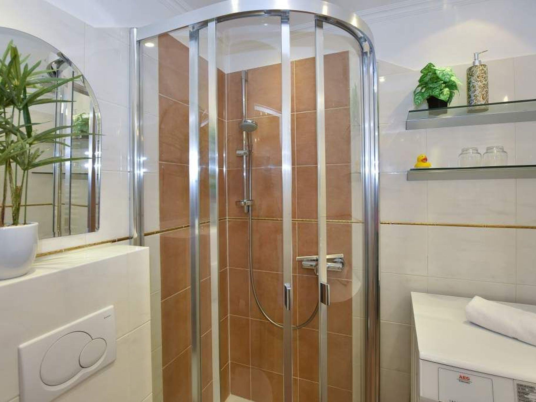 Im Duschbad befinden sich eine Dusche, ein WC, ein Waschtisch und ein Waschtrockner.