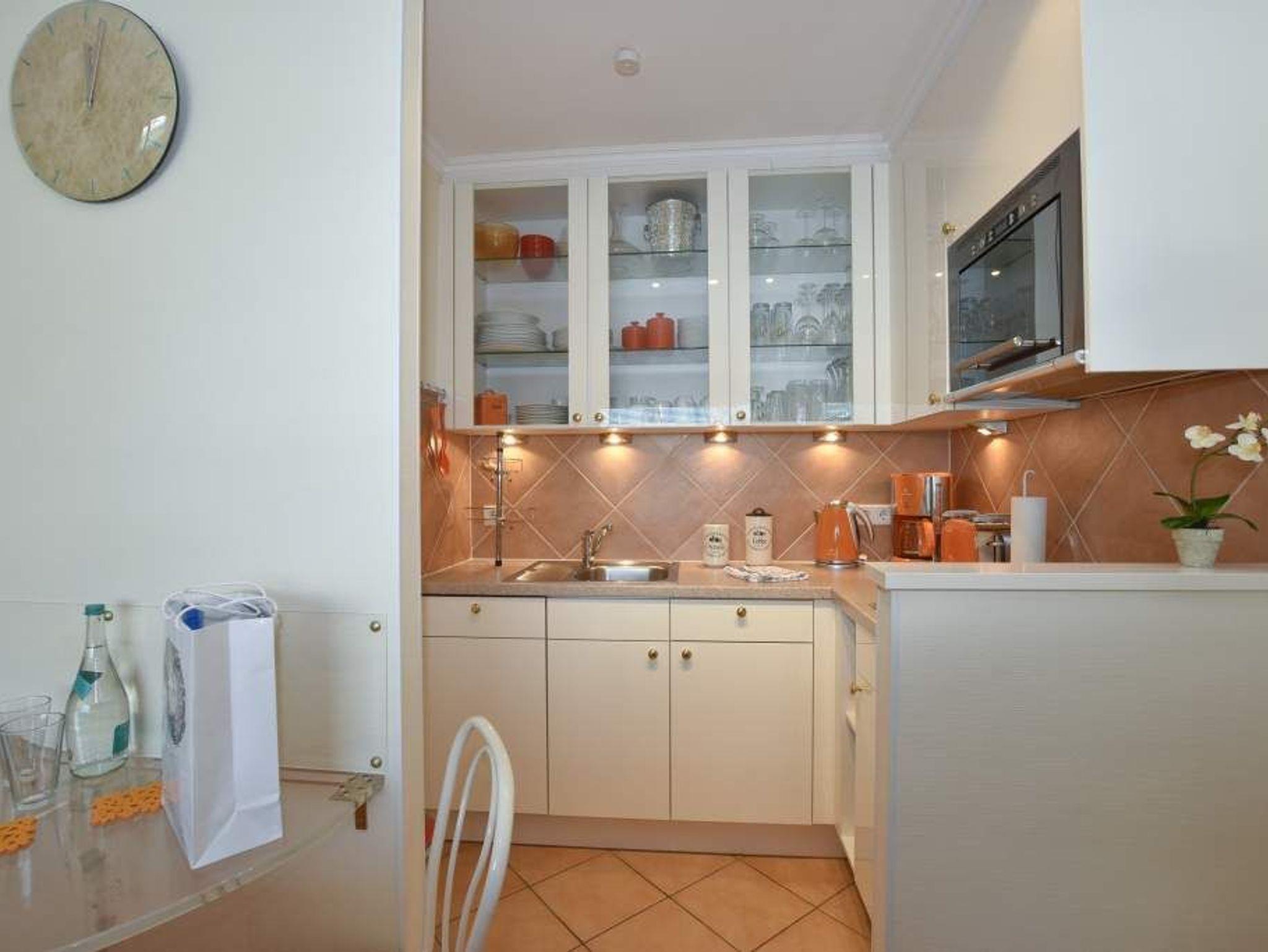 Die Küche hat einen Geschirrspüler, eine Mikrowelle mit Grillfunktion, ein Cerankochfeld und einen Kühlschrank. Kaffeemaschine, Wasserkocher und Toaster gehören zur Grundausstattung.