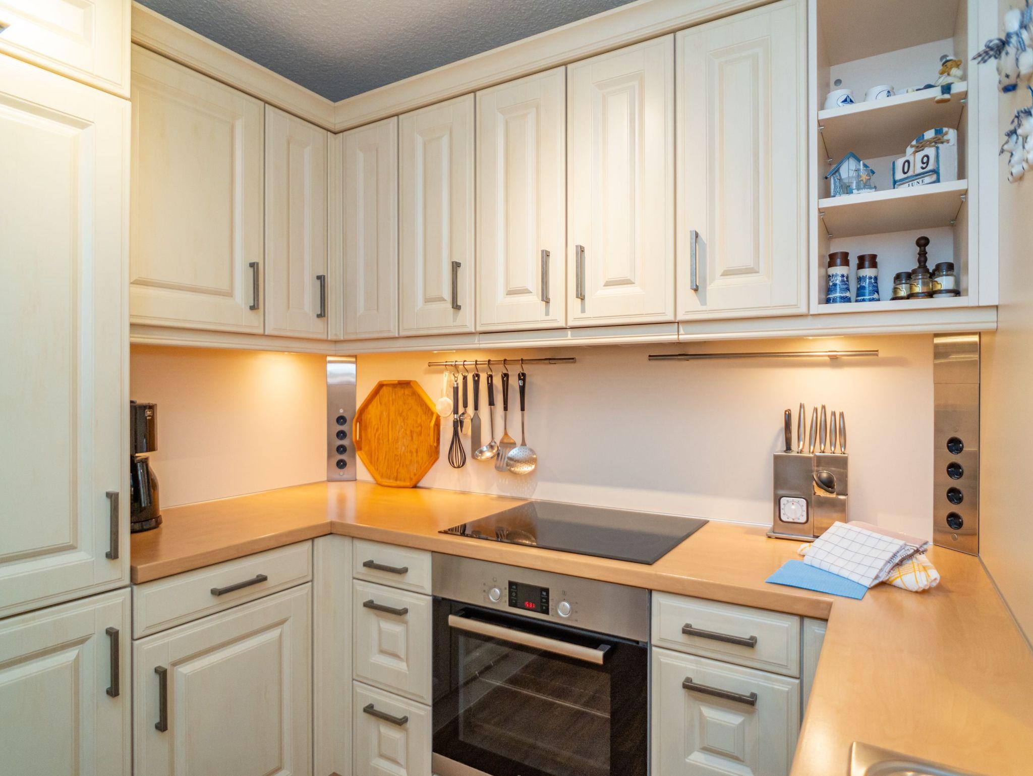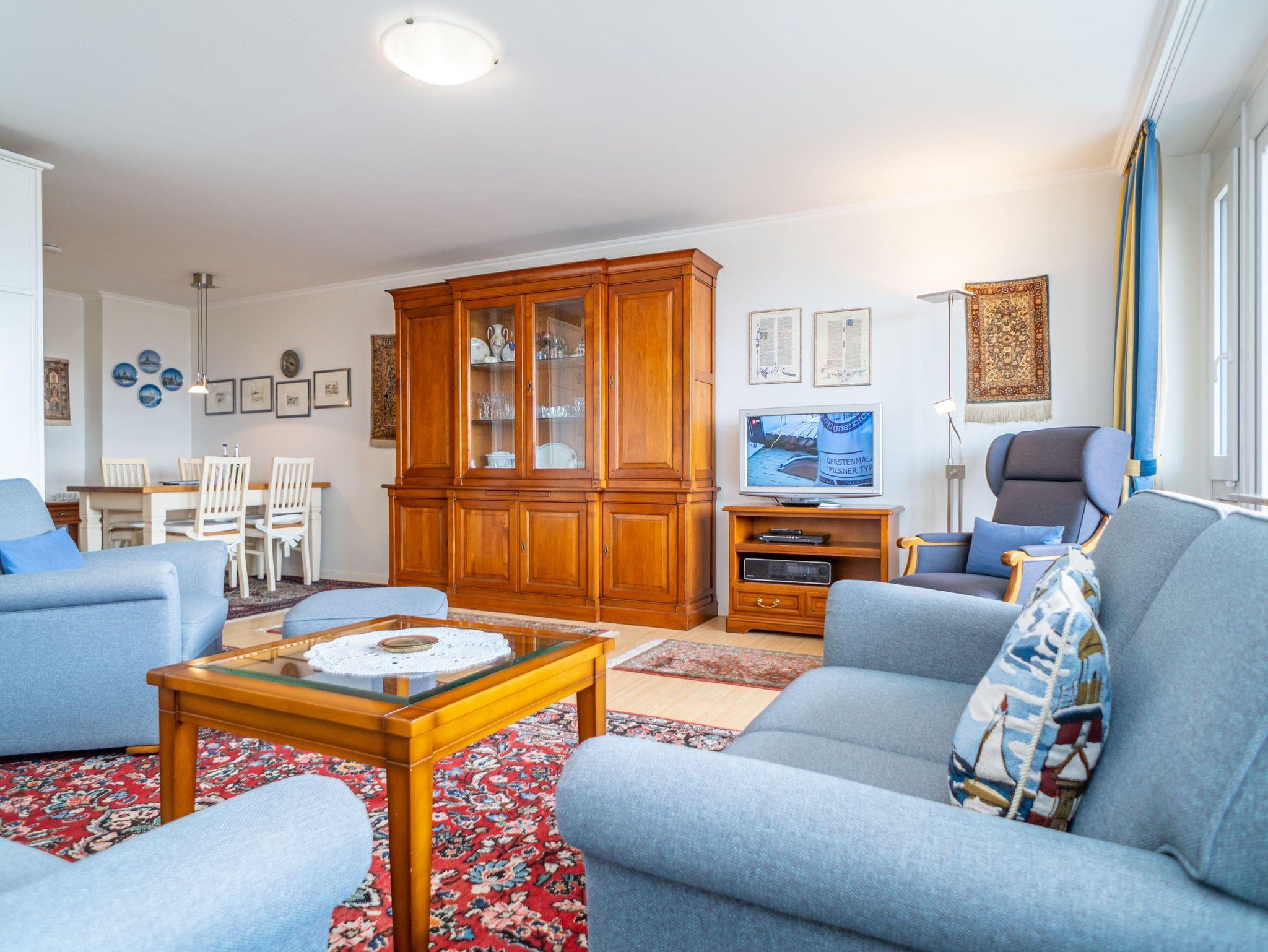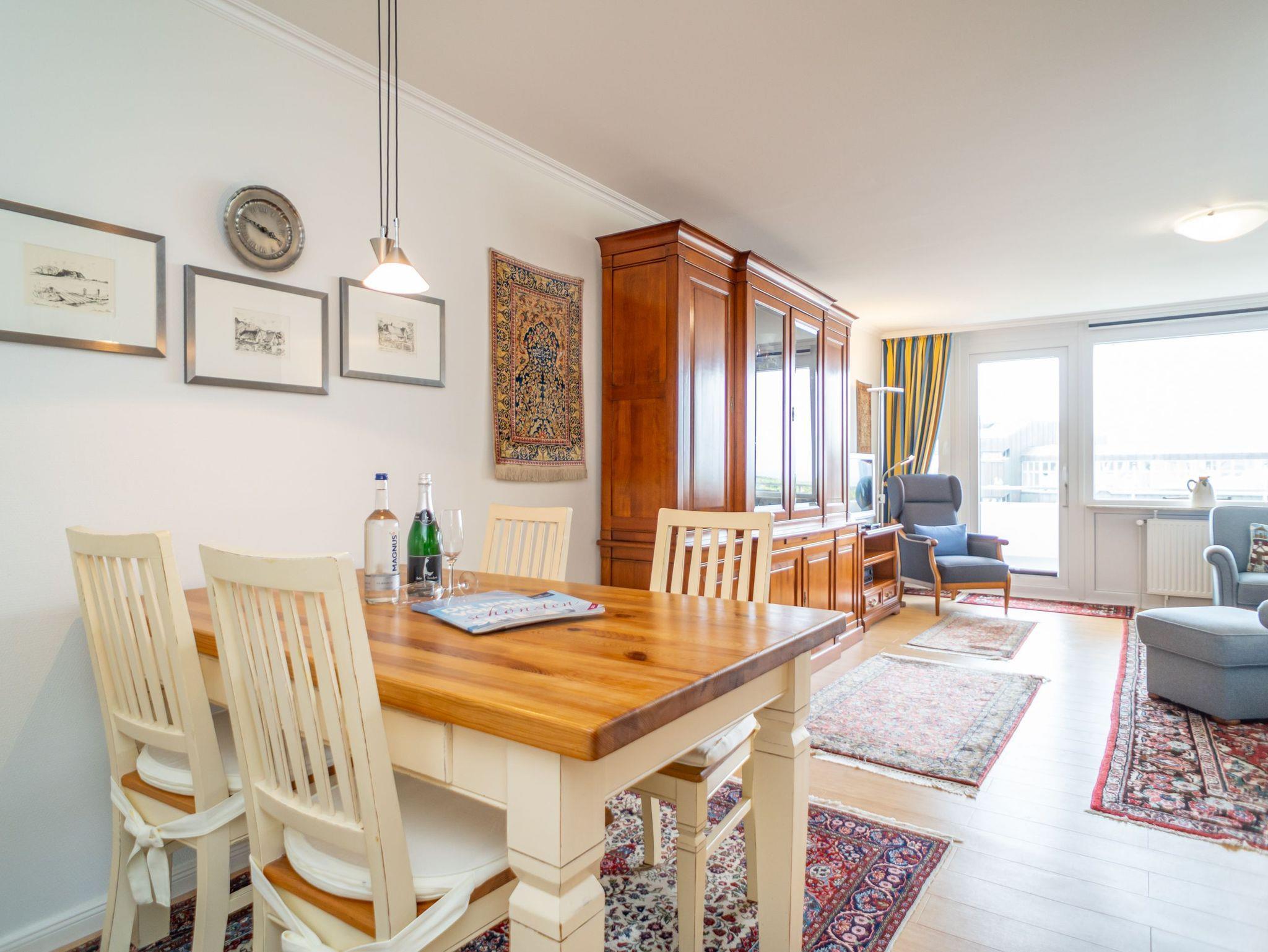 Komfortable 2-Zimmer-Nichtraucher-Ferienwohnung (ca. 76 qm) in der 3. Etage zur See- und Landseite mit Westloggia (Nachmittagssonne, mit Balkonmöbeln und Auflagen) und Ostloggia (Morgensonne, mit Balkonmöbeln und Auflagen) für max. 4 Personen.