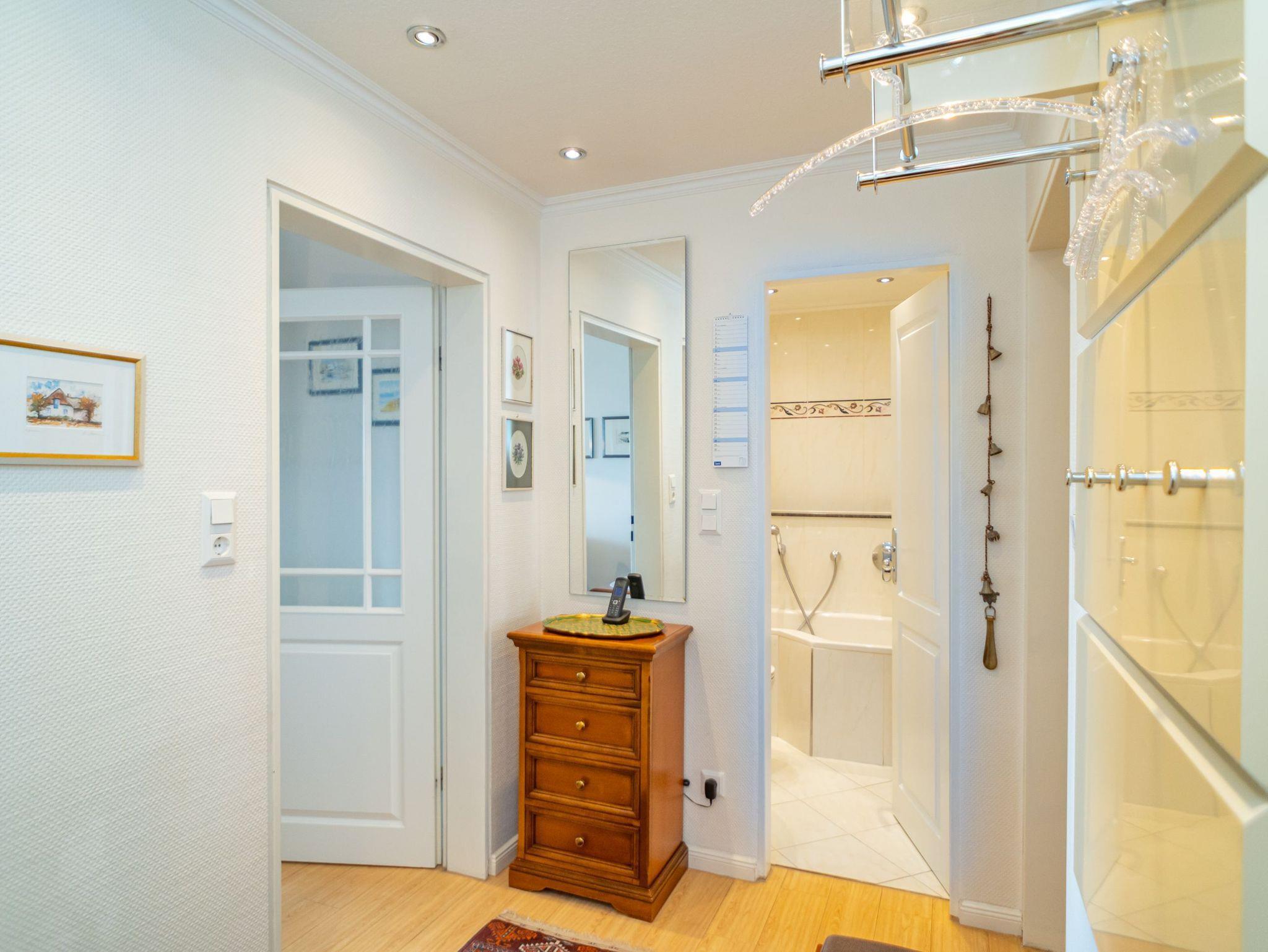 Vom Vorflur mit Garderobe gelangt man in das großzügige Wohnzimmer, in das neue Wannenbad/WC und in den Zwischenflur mit Zugang zum neuen Duschbad/WC und Schlafzimmer.