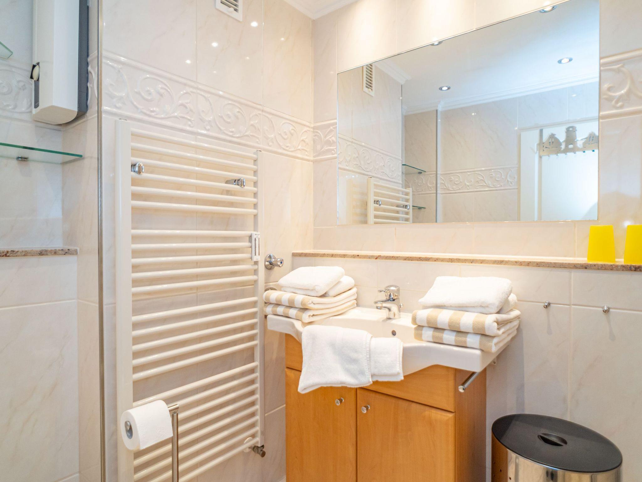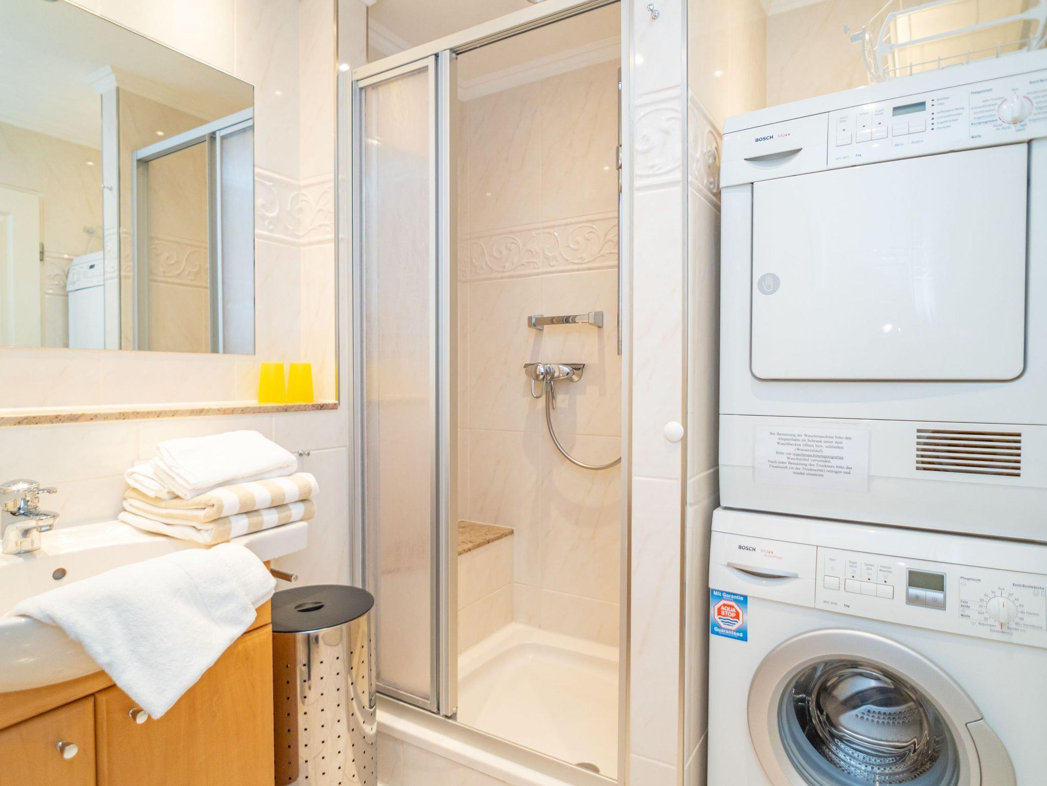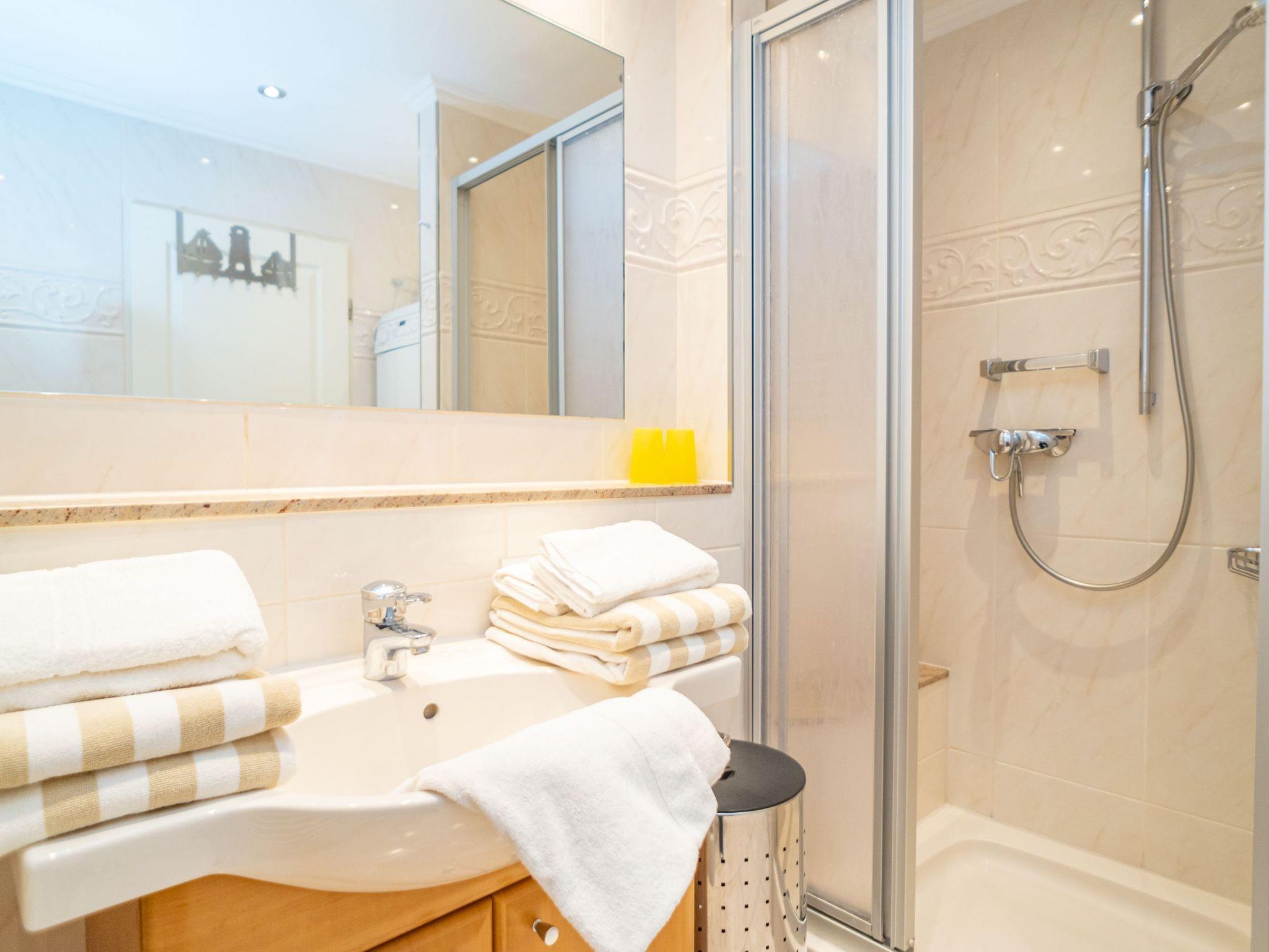 Das Wohnzimmer mit Austritt zur Westloggia hat eine Couchgarnitur mit zwei 2-Sitzer-Sofas, 2 Sesseln, einem Essplatz, einem Doppelschrankbett mit 1-türigem Kleiderschrank, Kabel-Flachbild-TV mit digitalem Empfang, Radio. Vom Wohnzimmer gelangt man in die neue, vollausgestattete, großzügige Küche mit Geschirrspüler, Backofen, Ceranfeld und mit Kühl- und separatem Gefrierschrank (mit 3 Gefrierfächern). Kaffeemaschine, Toaster, Wasser- und Eierkocher gehören zur Grundausstattung. Das große Schlafzimmer mit Austritt zur Ostloggia (Morgensonne) hat ein Doppelbett, viel Schrankraum und über den Zwischenflur direkten Zugang zum Badezimmer. Im 1. neuen Bad befinden sich eine Wanne, ein WC, ein Waschtisch und ein Handtuchtrockner. Im 2. neuen Bad befinden sich eine Dusche, ein WC, ein Waschtisch, ein Handtuchtrockner, eine Waschmaschine und ein Trockner (gebührenfreie Nutzung inklusive).