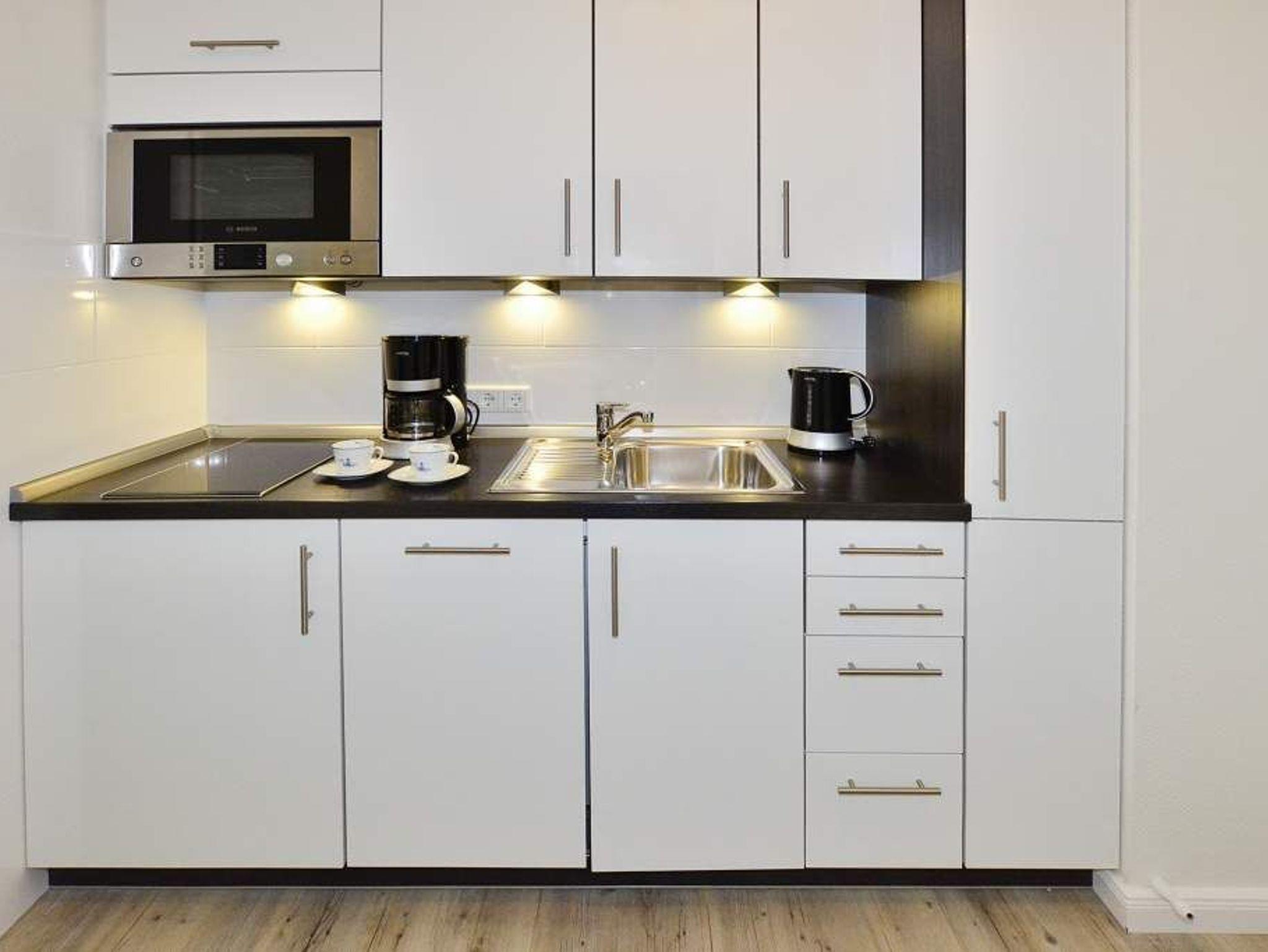 Die neue Küchenzeile hat ein Ceranfeld mit 2 Kochfeldern, eine Mikrowelle, einen Geschirrspüler und einen Kühlschrank mit 3*-Gefrierfach. Kaffeemaschine, Wasserkocher und Toaster gehören zur Grundausstattung.