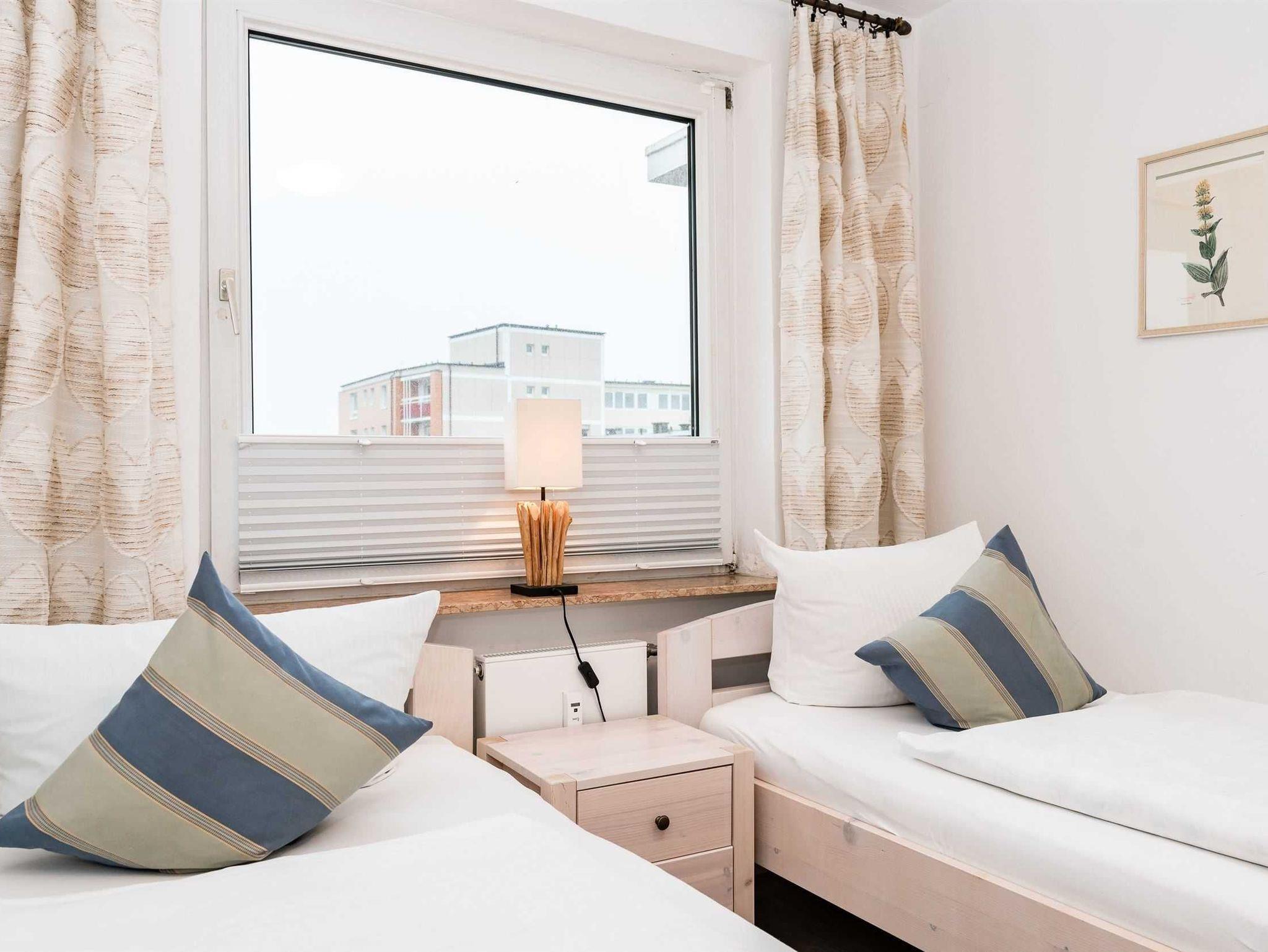 Die Wohnung liegt im 4. Obergeschoss hat einen Laminatboden und ist sehr hell eingerichtet. Im Wohnzimmer ist ein Flachbildfernseher vorhanden. Vom Wohnraum gelangen Sie auf den großzügigen nach Western ausgerichteten Balkon mit Blick auf den Brandenburger Platz und die Dünen. Die offene, neue Küchenzeile besitzt ein Ceranfeld, einen kleinen Backofen, eine Kaffeemaschine, Toaster und Wasserkocher. Des Weiteren verfügt die Wohnung über einen Schlafraum mit 2 Einzelbetten, ein WC/ Badezimmer mit Duschkabine.