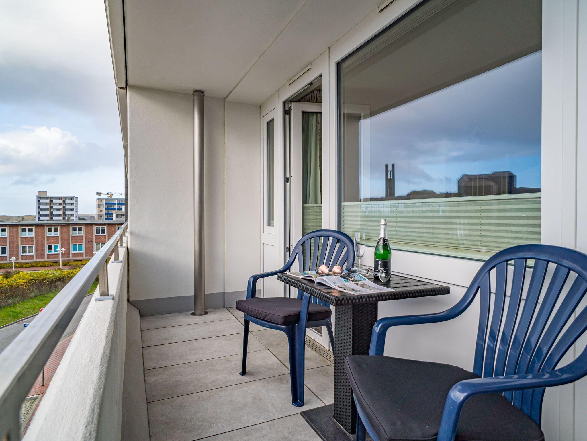 Erleben Sie exklusiven Wohnkomfort in dieser stilvollen 2-Zimmer-Nichtraucher-Ferienwohnung (ca. 51 qm) in der 2. Etage zur Seeseite ideal für maximal 4 Personen. Die Wohnung besticht durch eine Westloggia, die Sie in der Nachmittagssonne mit Balkonmöbeln und Auflagen zum Verweilen einlädt. Beim Betreten der Ferienwohnung gelangen Sie über einen großzügigen Vorflur mit Garderobe in das helle Wohnzimmer, das direkten Zugang zum Balkon bietet. Von hier aus erreichen Sie das komfortable Schlafzimmer sowie das moderne Duschbad/WC mit Fön.