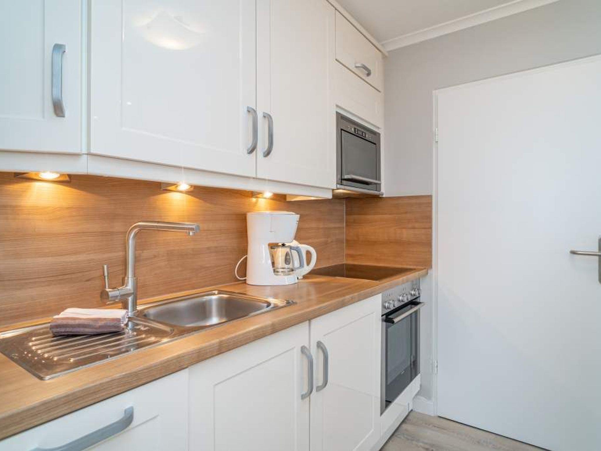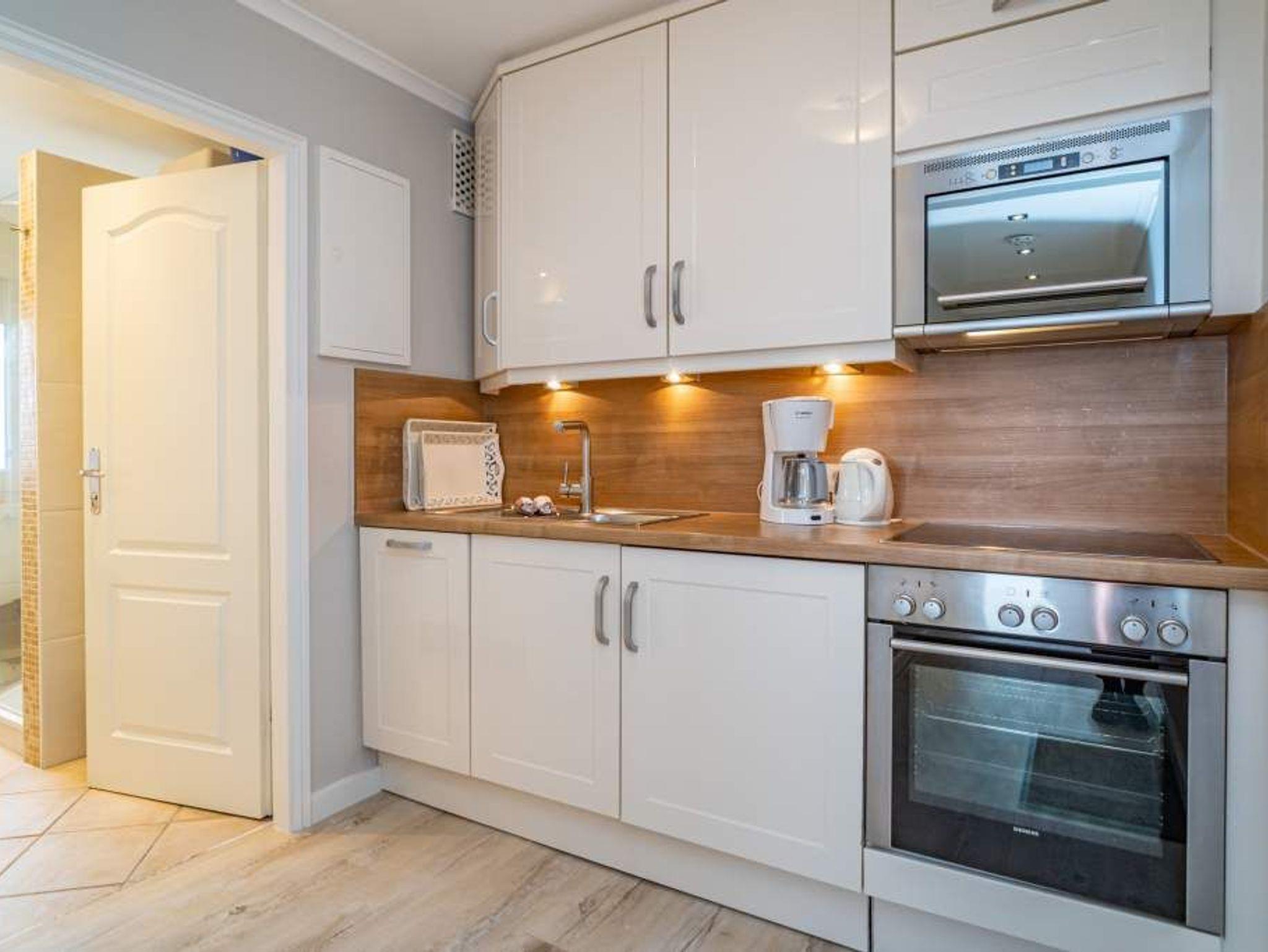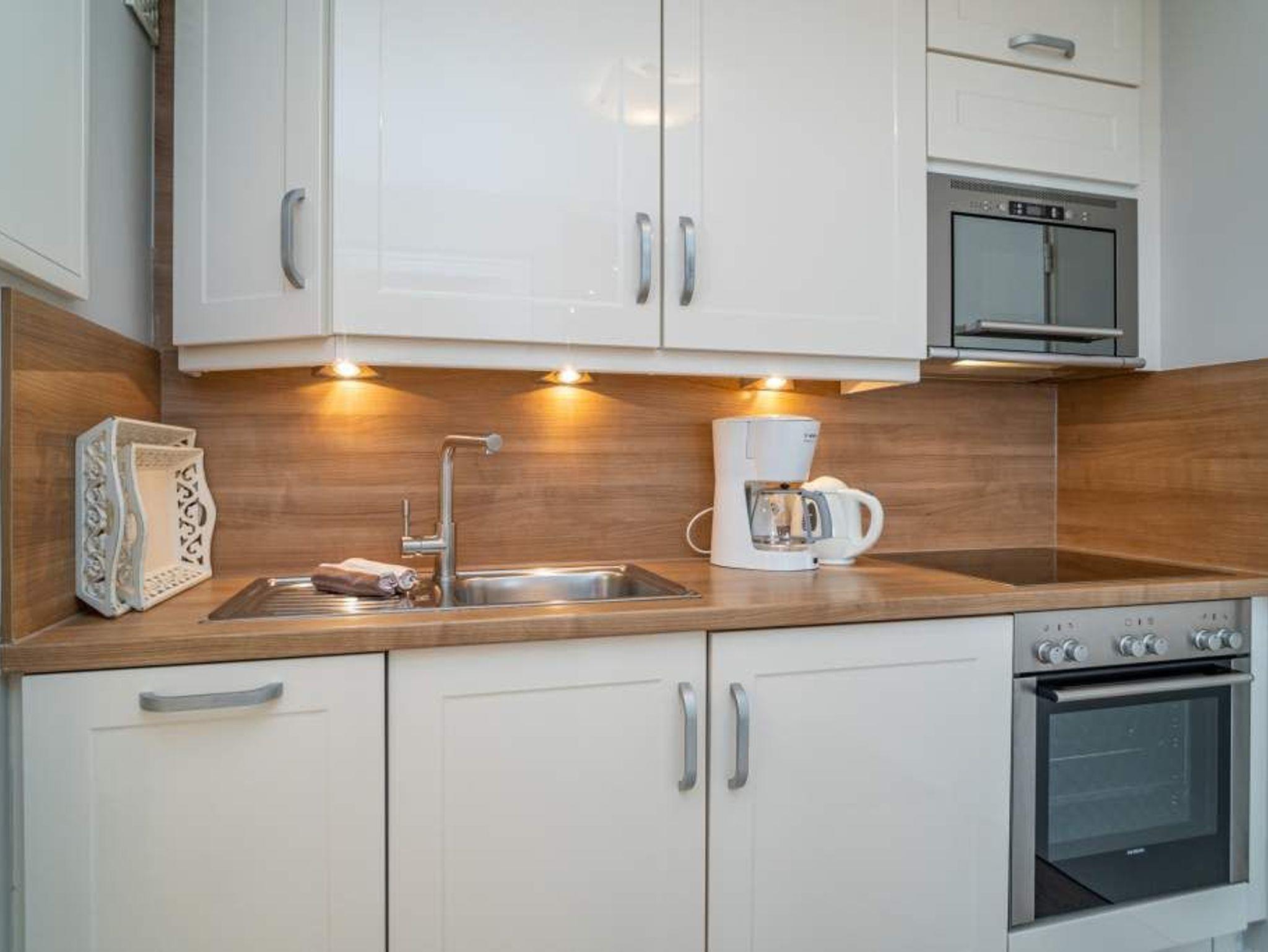 Die Küchenzeile hat einen Geschirrspüler, eine Mikrowelle, eine Nespresso-Maschine, einen Herd mit Backofen und Ceranfeld. Kaffeemaschine, Wasserkocher und Toaster gehören zur Grundausstattung.