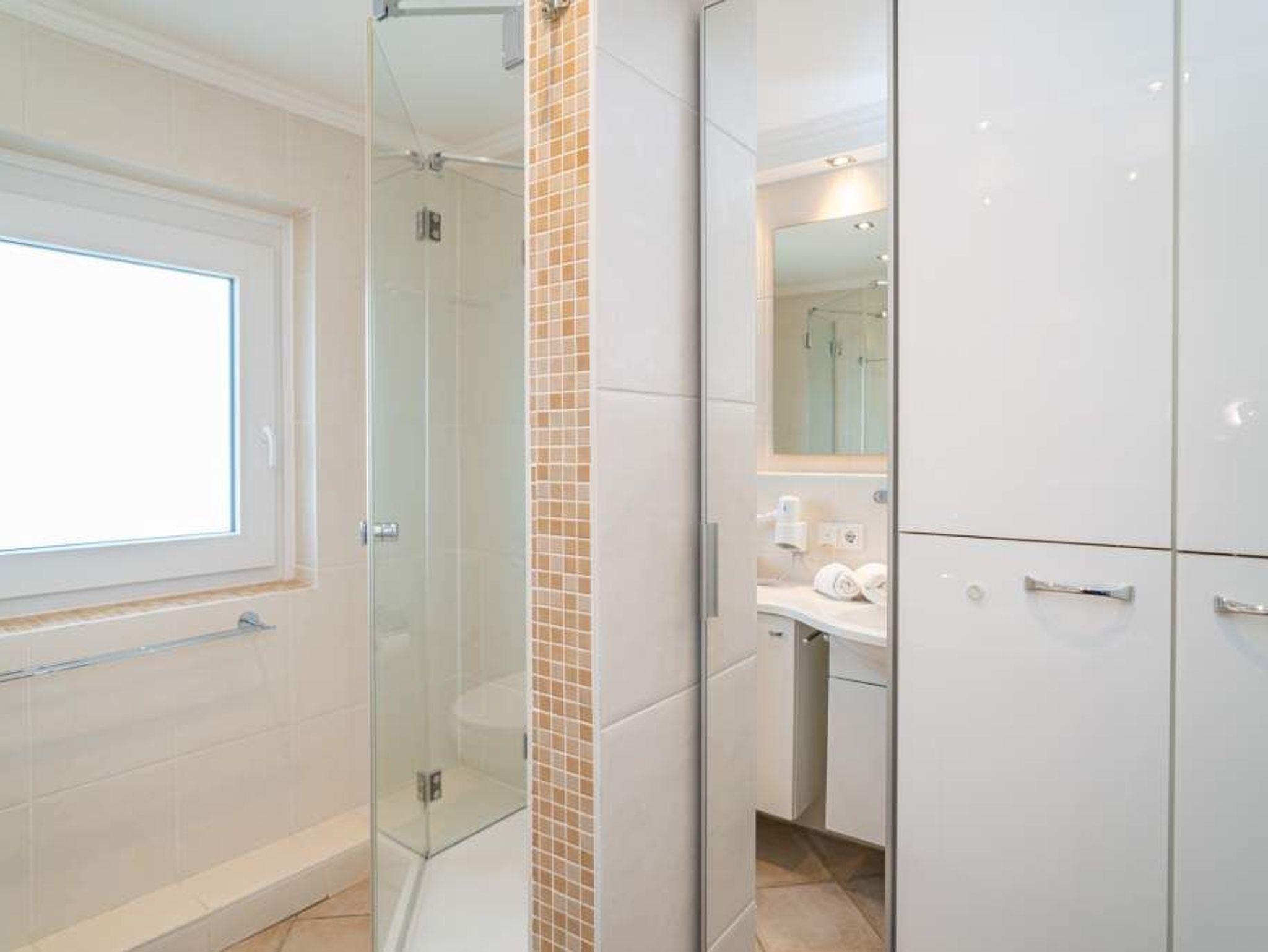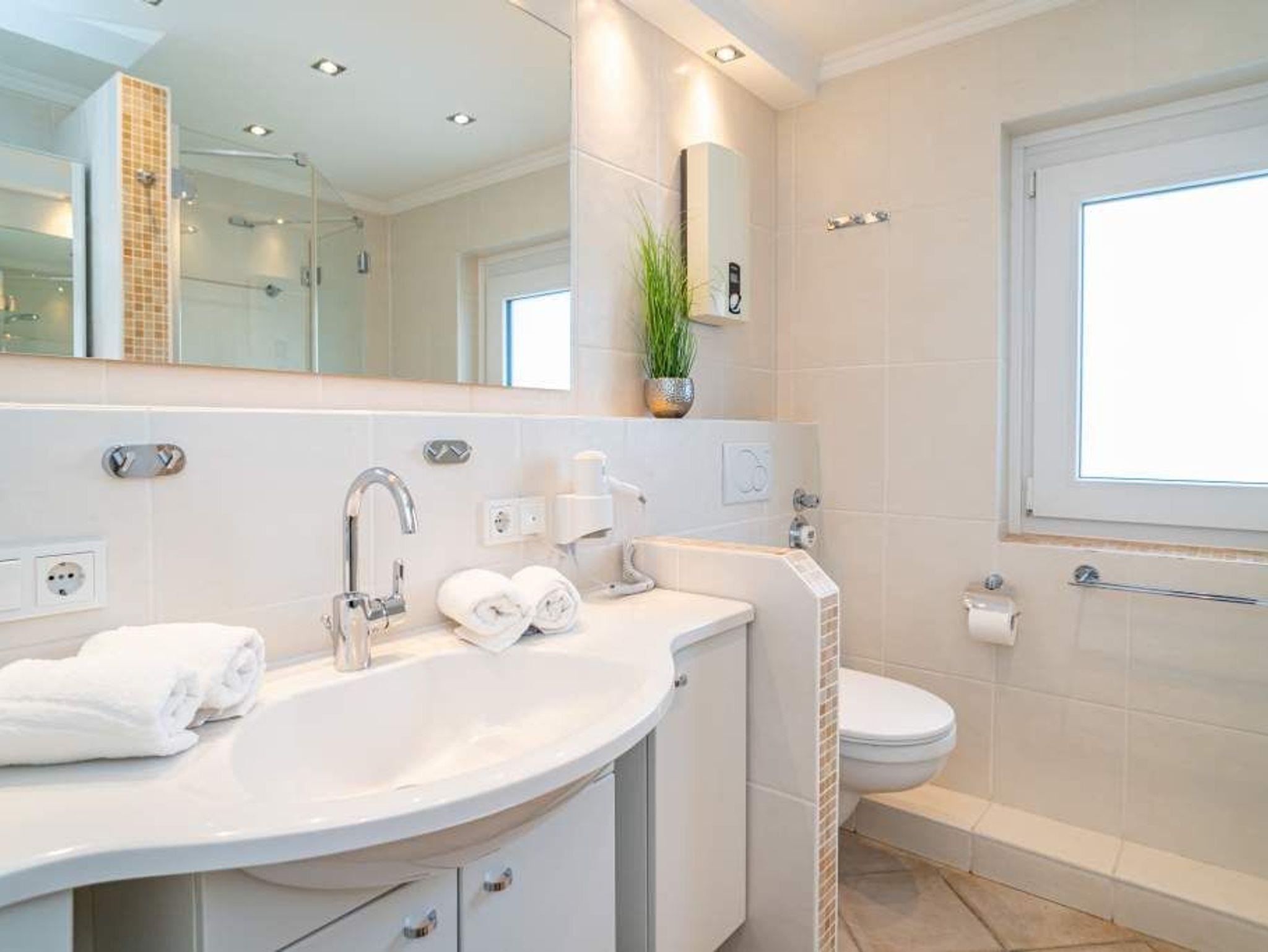 Das Badezimmer ist mit geräumiger Dusche, Waschtisch, Handtuchtrockner, Fön und Fenster ausgestattet.