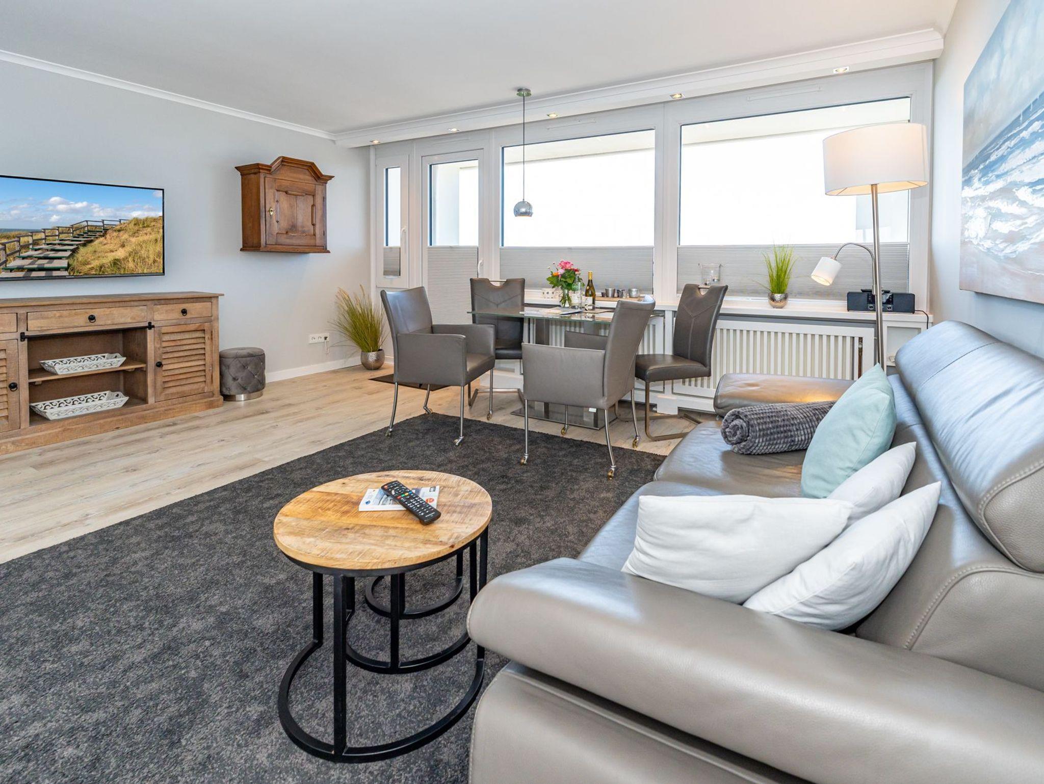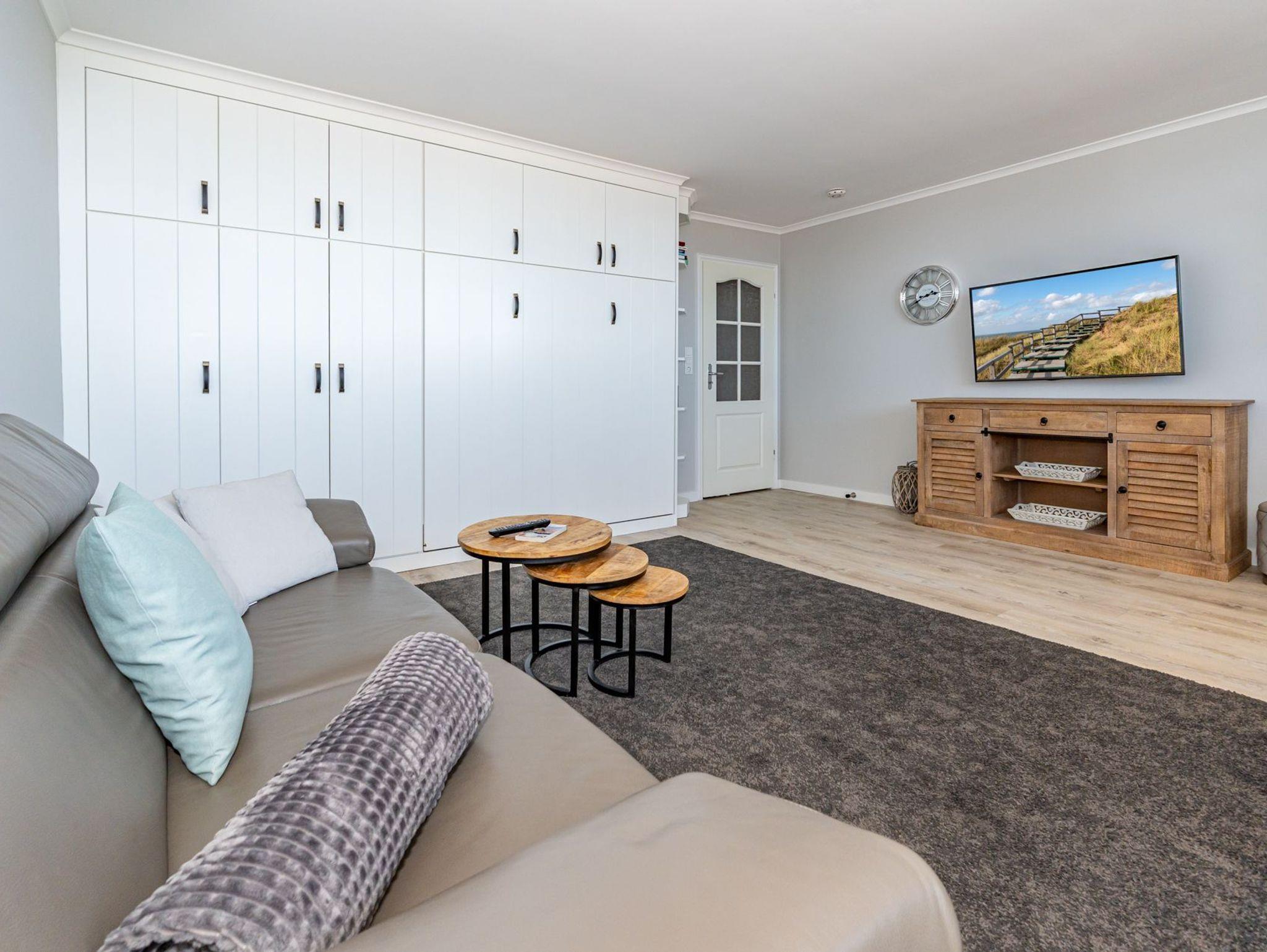 Der Wohnraum besteht aus einer Sitzgarnitur (mit 2-Sitzer-Couch und 2 Sesseln), einem Essplatz, einem Doppel-Wandschrankbett und einem großen Kabel-Flachbild-TV.