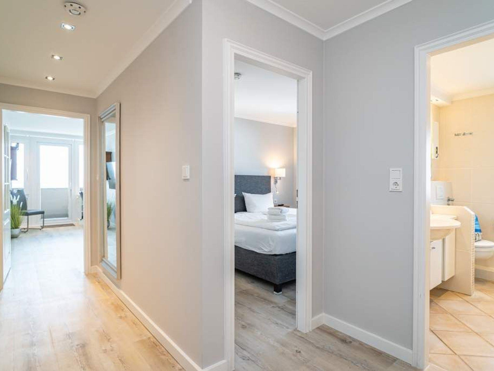 Gut eingerichtete, komplett mit Fliesen und Venyl-Laminat ausgestattete 2-Zimmer-Nichtraucher-Ferienwohnung, ca. 51 qm, in der 5. Etage zur Seeseite mit herrlichem Meerblick und Westloggia (Nachmittags- und Abendsonne mit Balkonmöbeln und Auflagen) für max. 4 Personen.