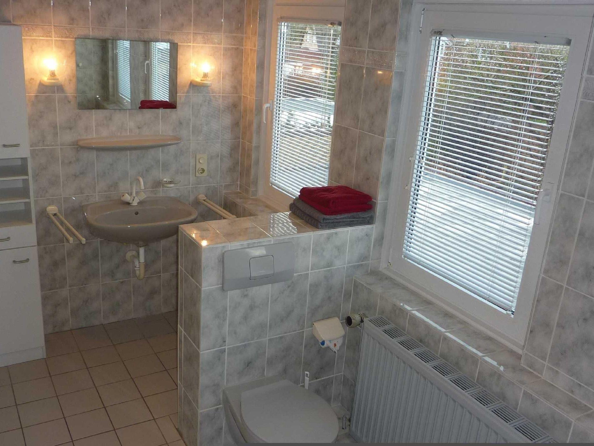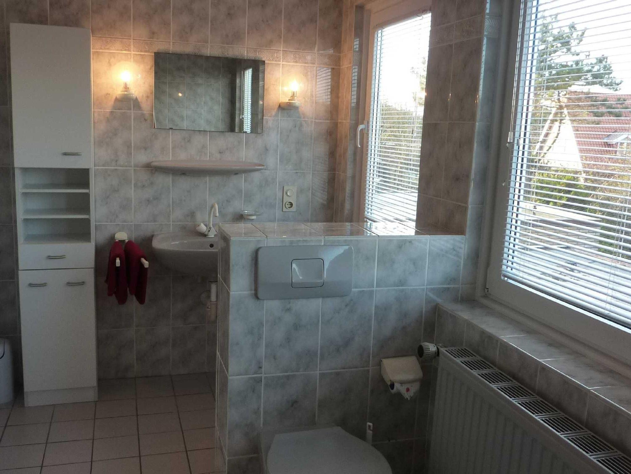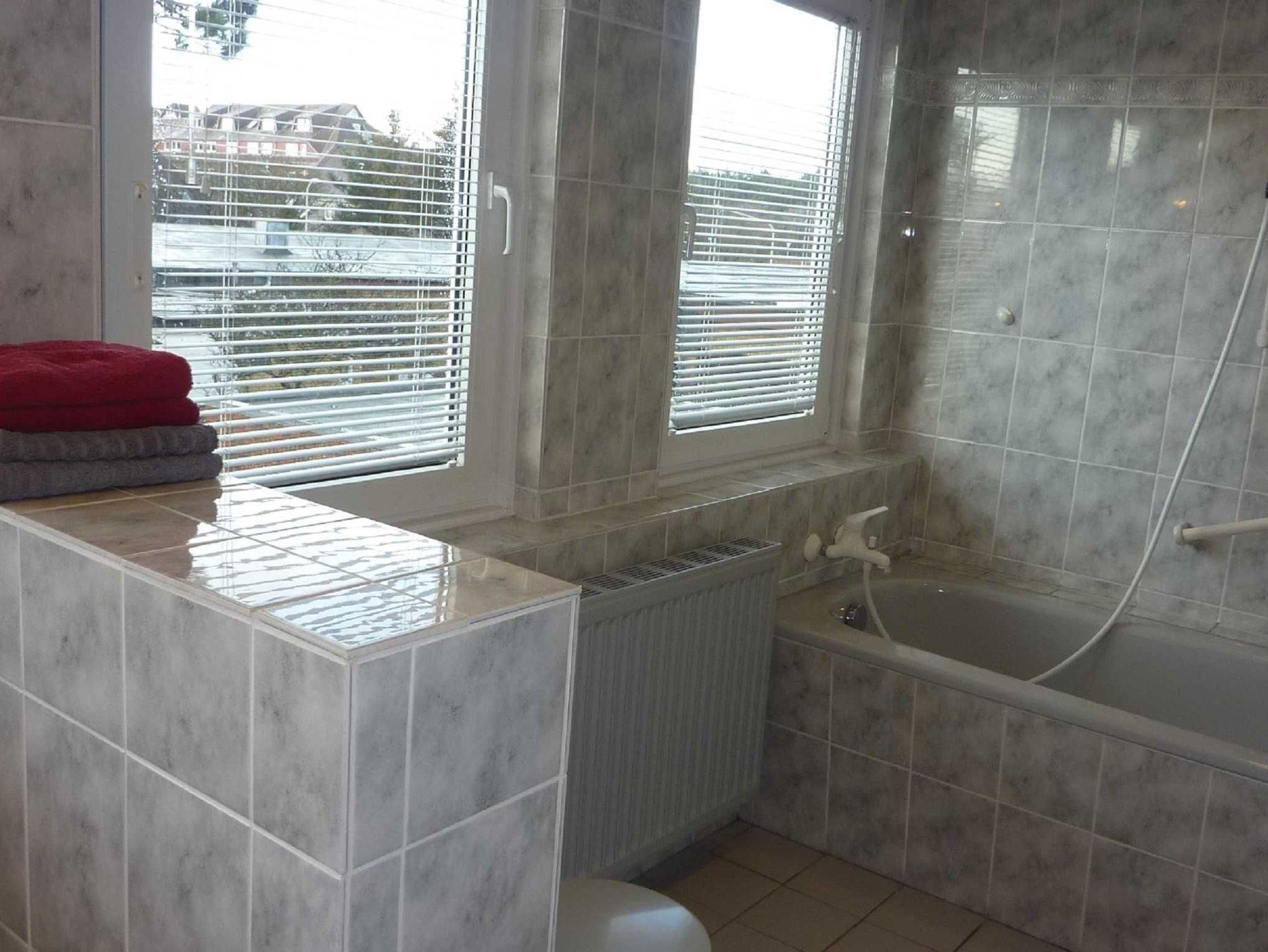 Ein helles, großes Bad mit Waschbecken, Badewanne mit Duschmöglichkeit, WC, Haartrockner und Außenfenster.