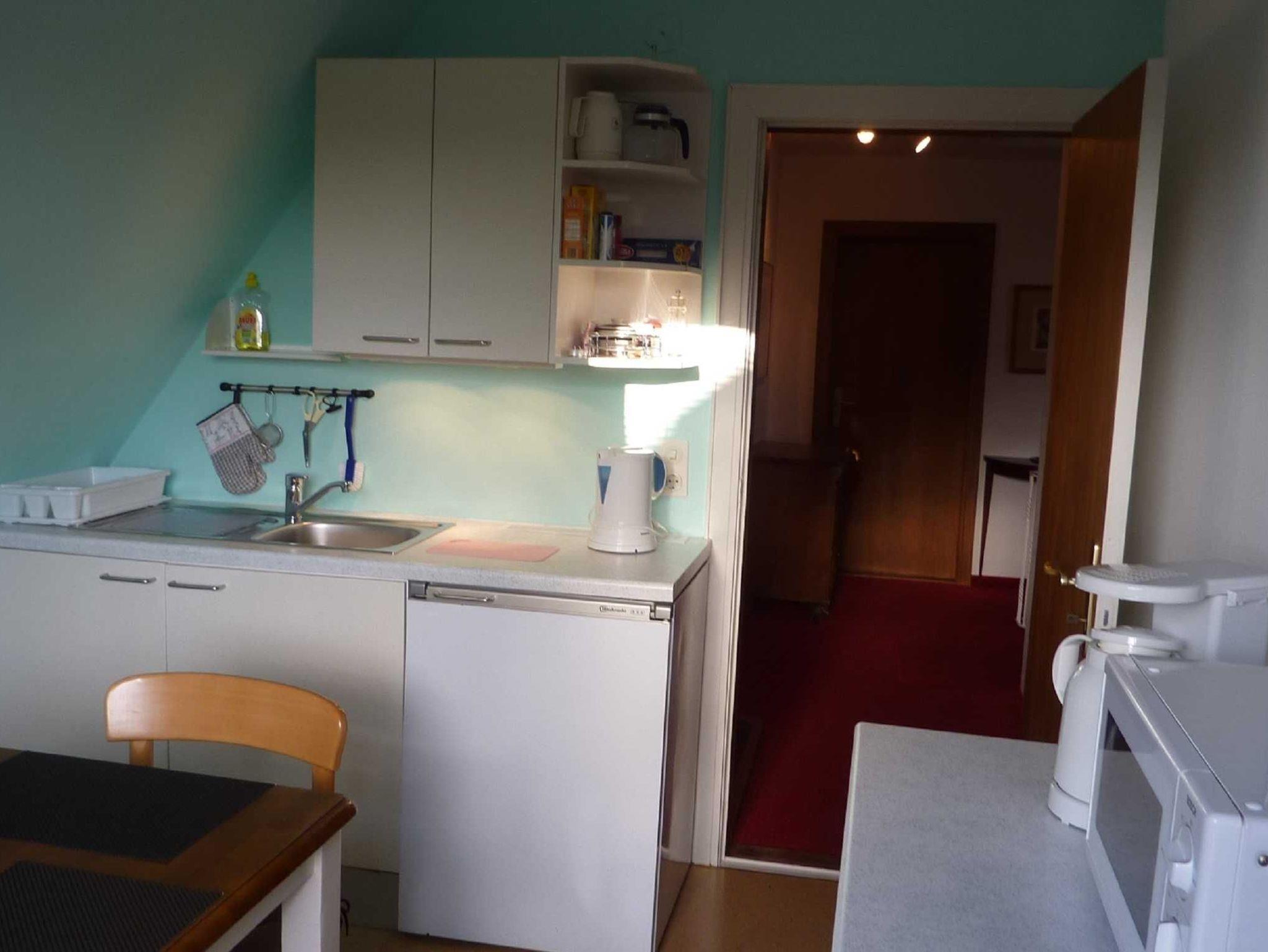 Die separate Küche ist ausgestattet mit einem Essbereich, 2-Plattenkochfeld, Mikrowelle, Kühlschrank mit Gefriermöglichkeit, Kaffeemaschine, Wasserkocher, Toaster auf Anfrage und Geschirr für den täglichen Gebrauch.