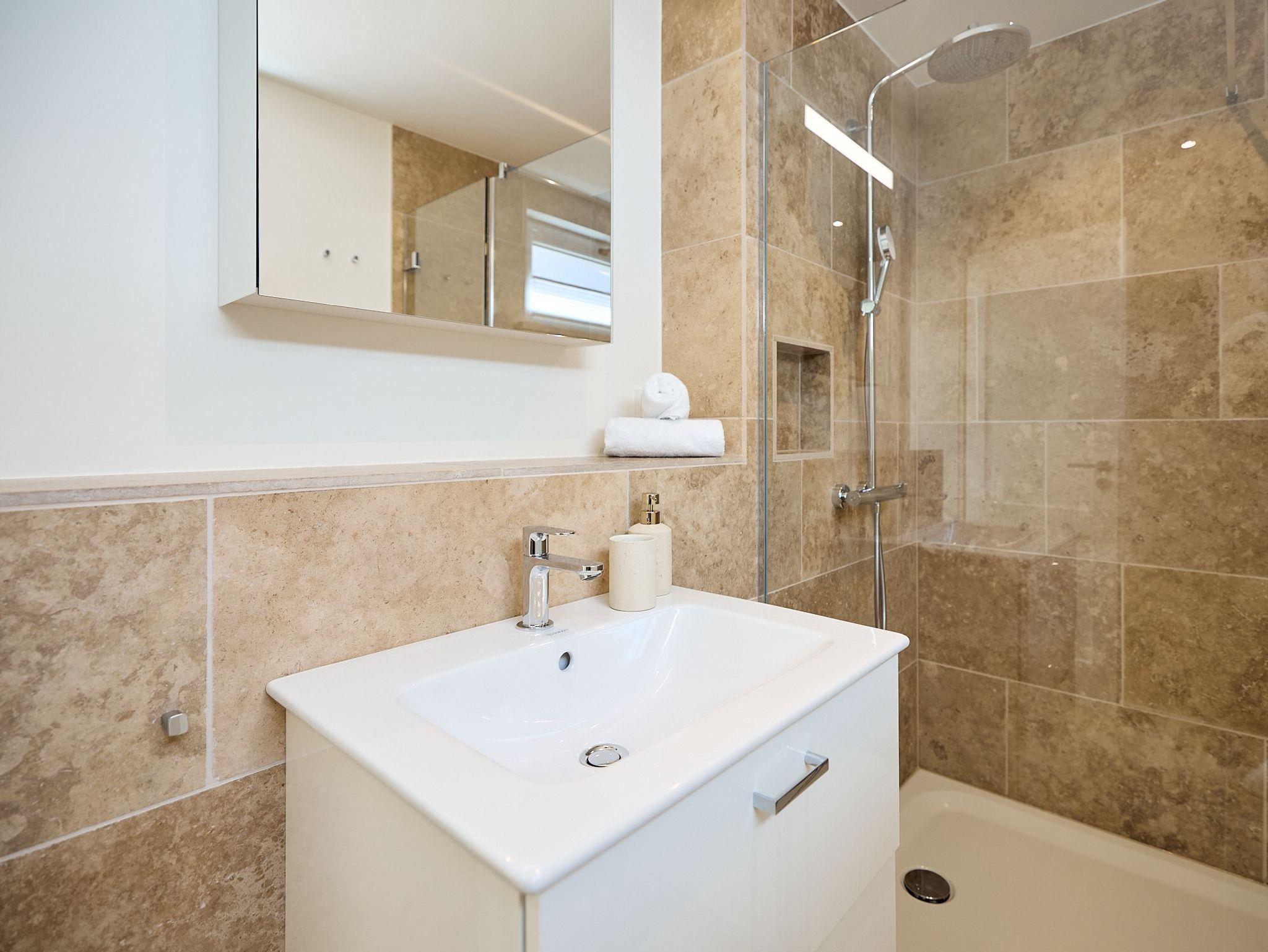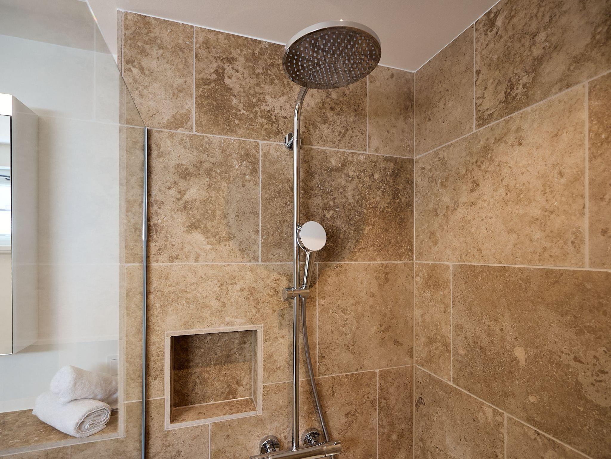 - Badezimmer: Großzügiges, modernes Bad mit hochwertigen Natursteinfliesen und einer großen Dusche - hier starten Sie erfrischt in den Tag.