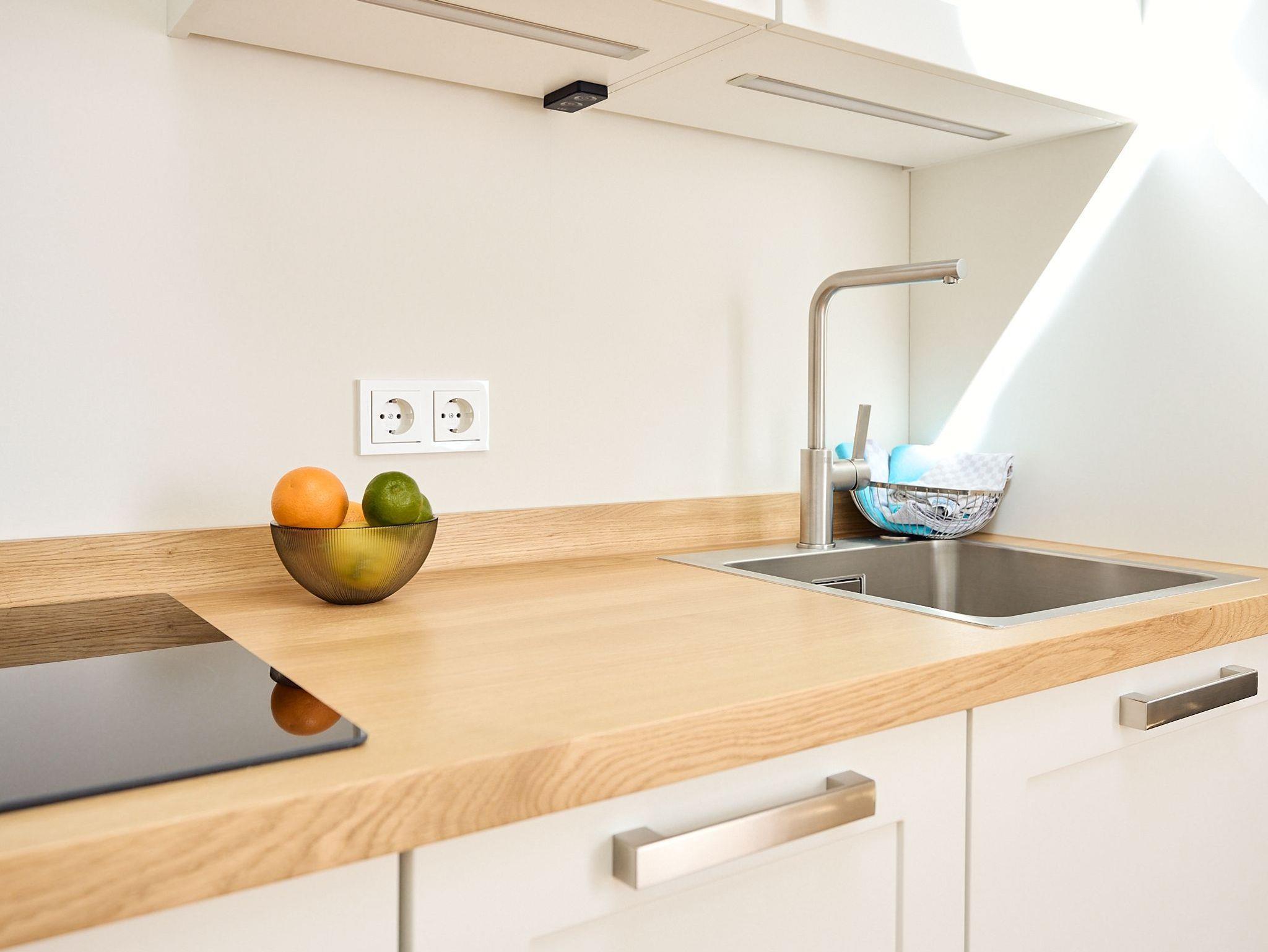 - Wohnbereich: Linkerhand erwartet Sie eine einladende Küchenzeile mit allem, was Sie zum Kochen brauchen, ein gemütlicher Essbereich sowie ein komfortables Sofa mit Smart-TV für entspannte Abende.