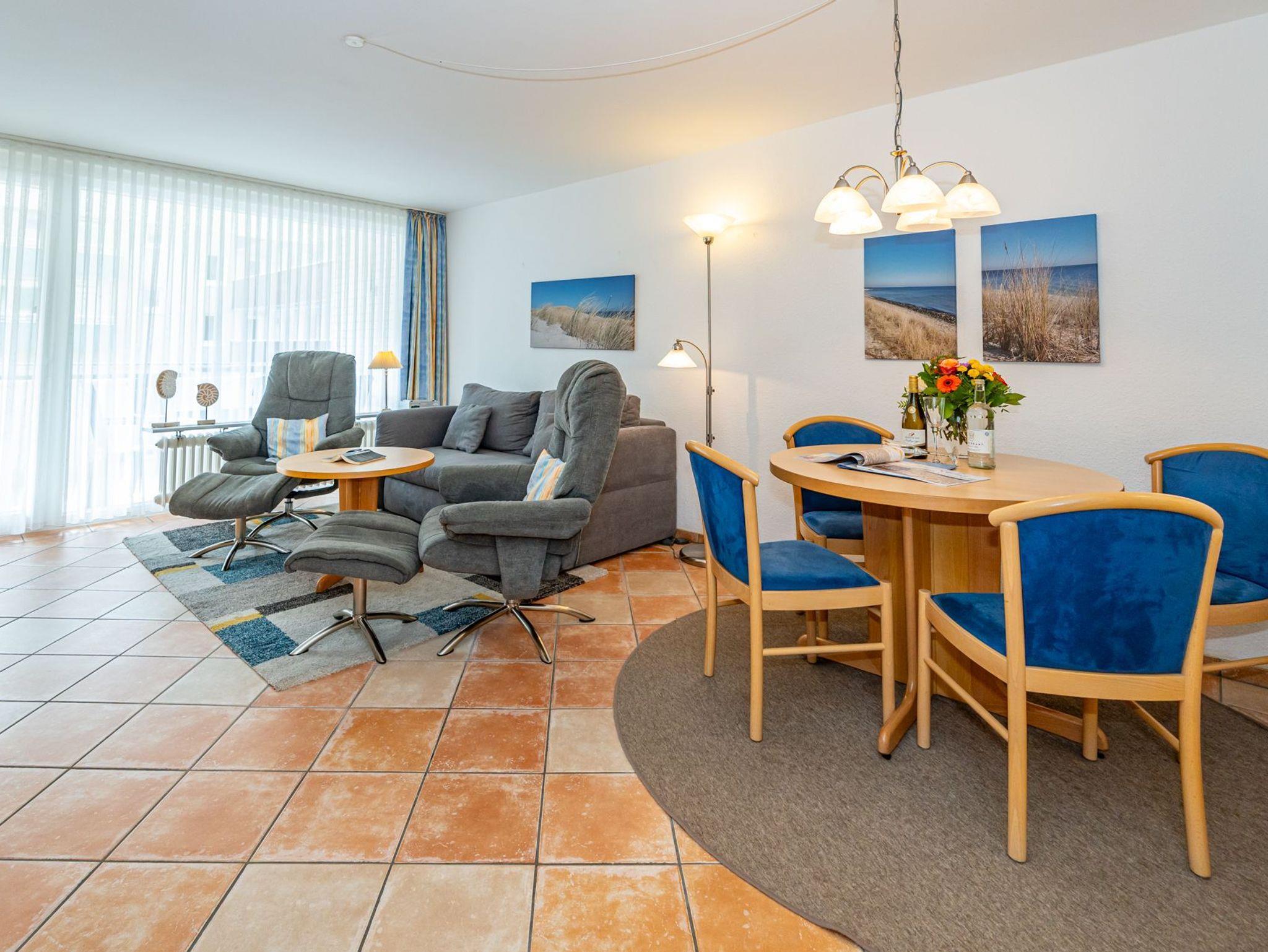 Der Wohnraum besteht aus einer bequemen Sitzgarnitur (2-Sitzer-Couch, 2 Sessel), einem Essplatz, einem Doppelschrankbett (einzeln ausklappbar), Flachbild-TV (HD-Ready mit digitalem Empfang mit ca. 60-100 Radio- und Fernsehprogrammen), DVD-Player, Radio/CD, kostenlose Flatrate ins deutsche Festnetz, W-Lan.