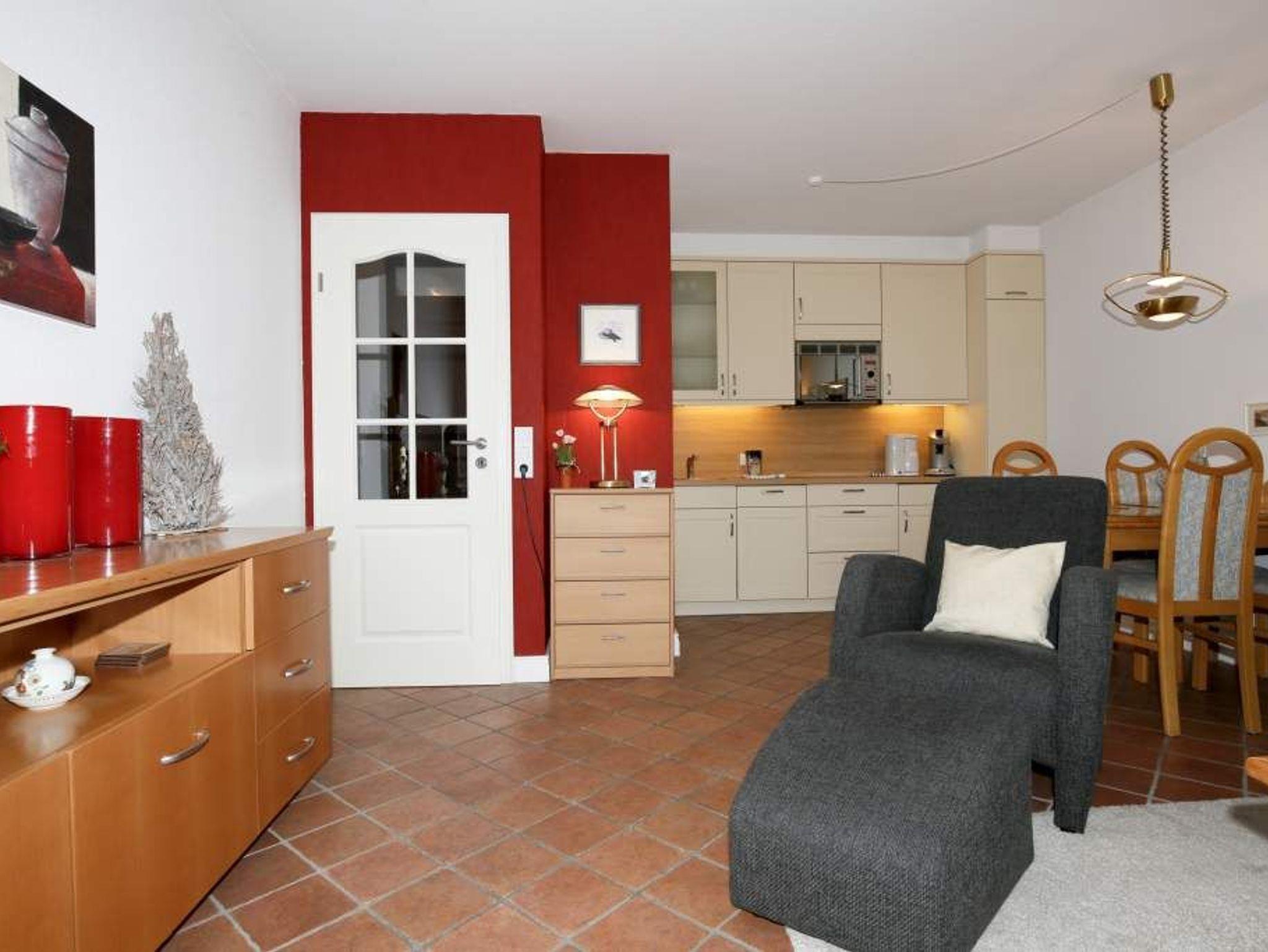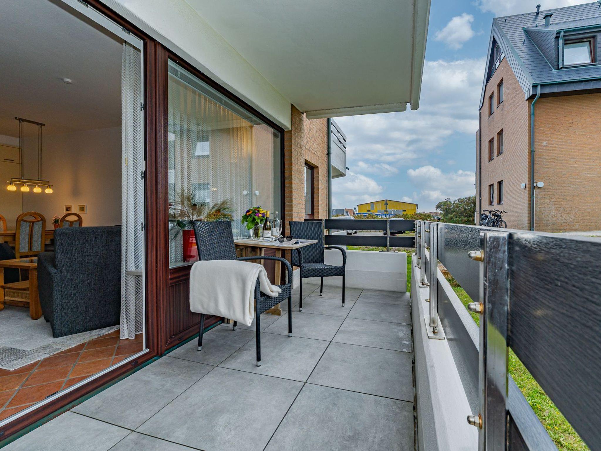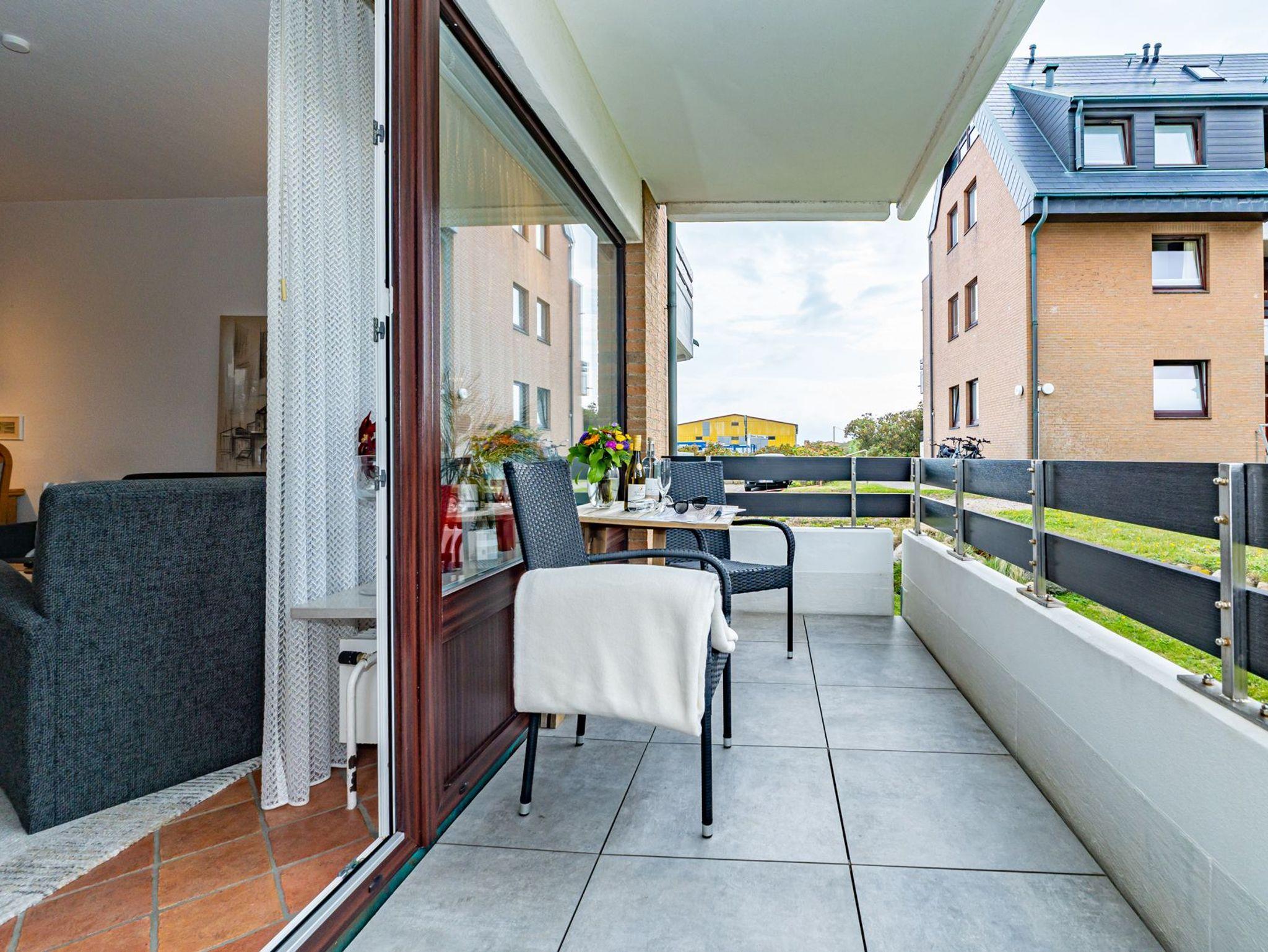 Erwartet Sie diese komplett geflieste 2-Zimmer-Nichtraucher-Ferienwohnung im Parterre zur Westseite. Mit ca. 45 m² Wohnfläche und einem Westbalkon, der in der Nachmittagssonne mit komfortablen Balkonmöbeln und Auflagen zum Entspannen einlädt, bietet die Wohnung Platz für maximal 4 Personen.
