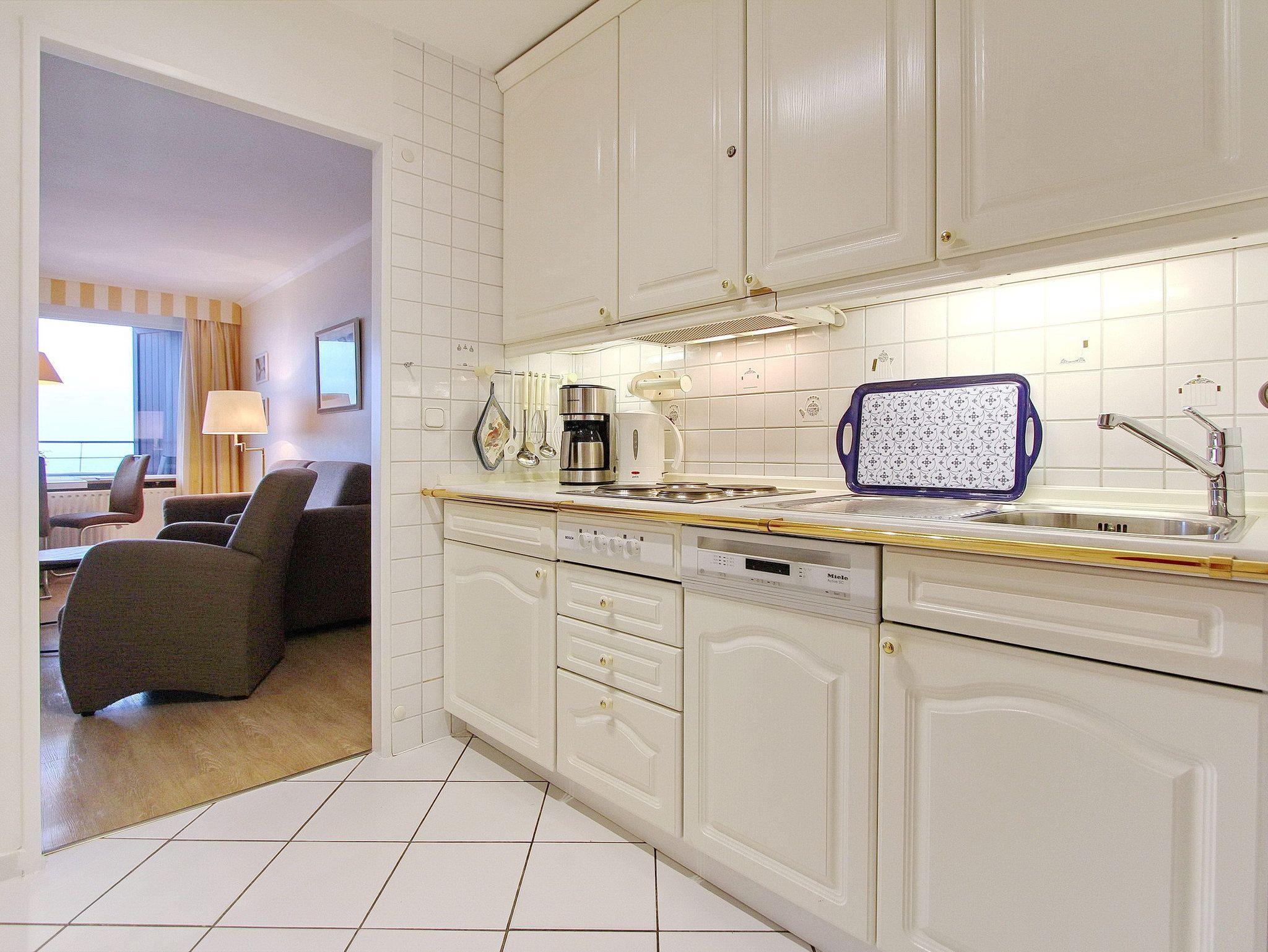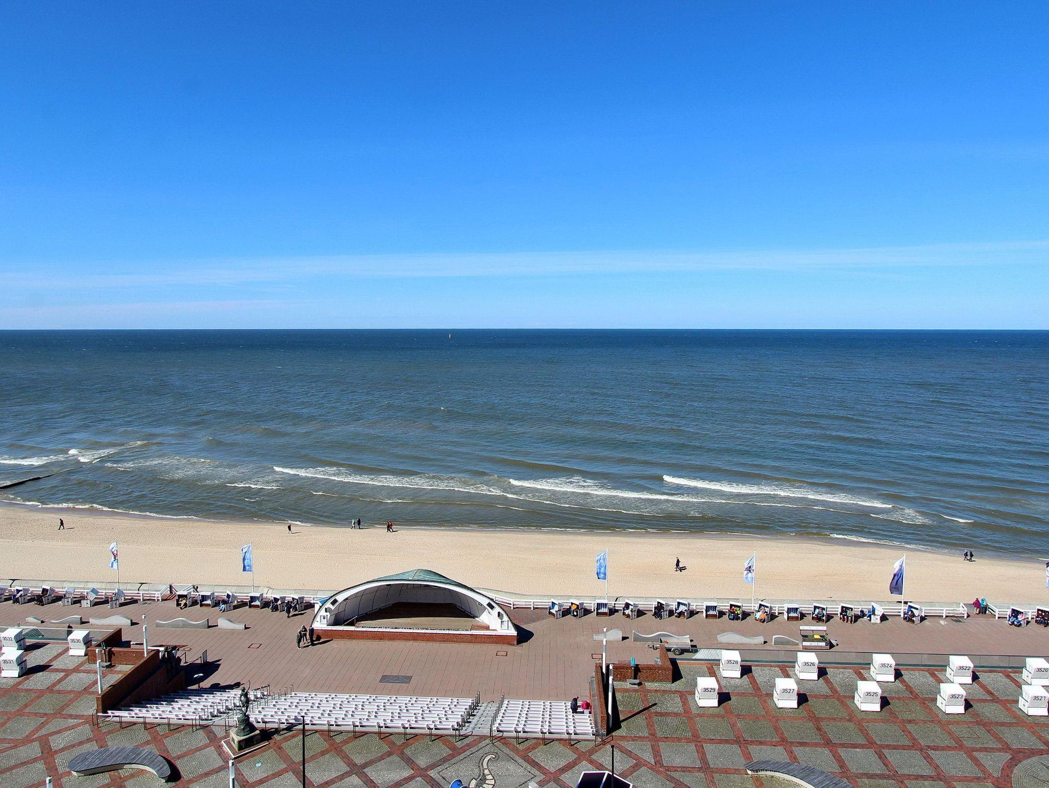 Hell und freundlich eingerichtete Ferienwohnung im Haus Metropol in der 7. Etage mit herrlichem Weitblick über den Strand und auf die Nordsee. Die 1-Zimmer-Wohnung mit vorgelagertem Westbalkon verfügt über zwei Einzelschrankbetten, einer Couchgarnitur mit Sessel und einem Essplatz am Fenster mit 2 Stühlen. Die Küchenzeile im Flur verfügt über einen Herd mit 4 Platten und einem Geschirrspüler. Das Badezimmer ist mit einer Halbrunddusche und einem Handtuchtrockner ausgestattet. Ein freies WLAN Netzwerk (WEG Haus Metropol - Passwortfrei - ohne Gewähr) steht ihnen kostenfrei zur Verfügung. Wohnungsgröße 34 m².
