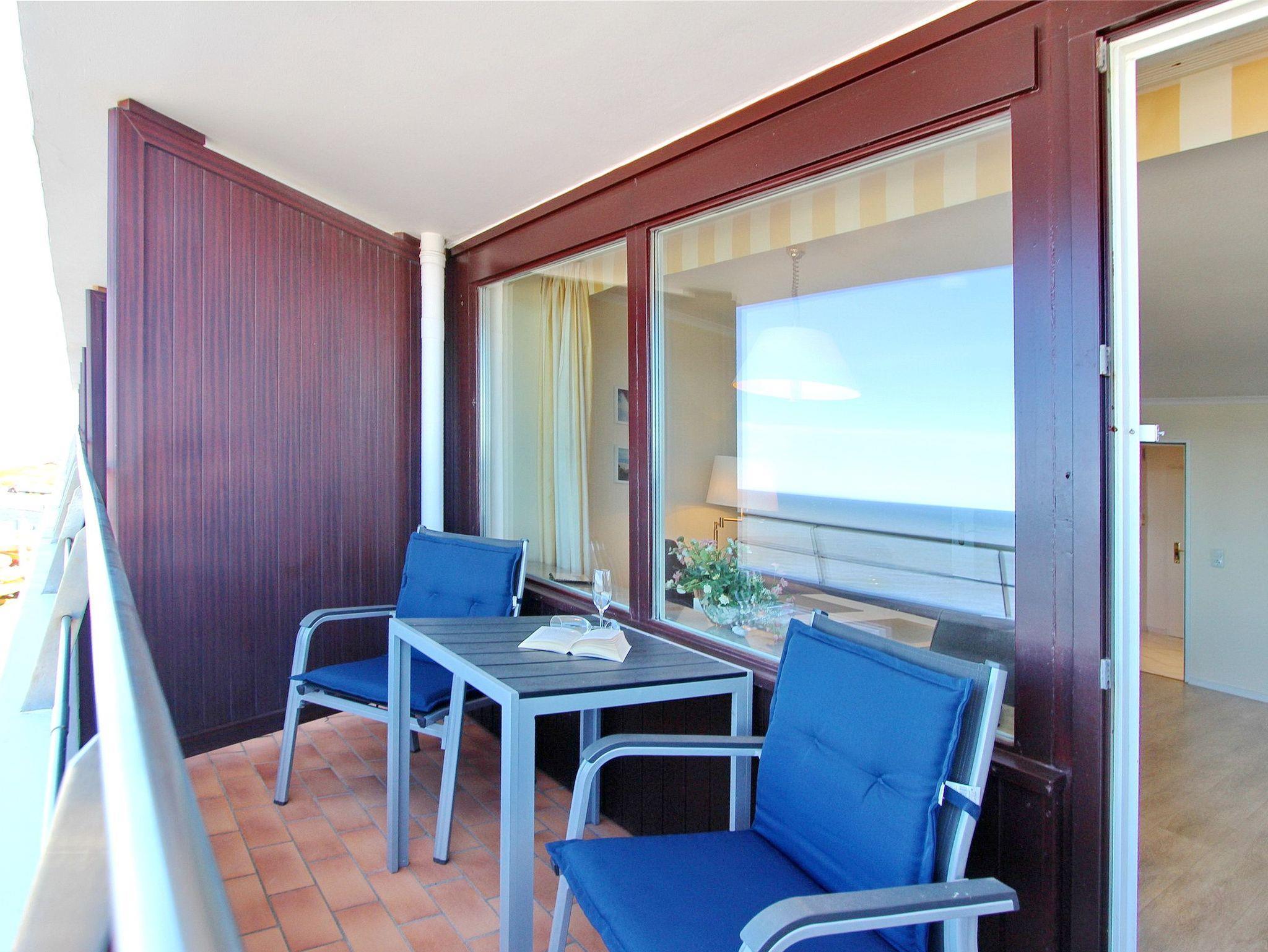 Helle Ferienwohnung mit Balkon und Meerblick im Haus Metropol auf Sylt, ideal für erholsame Tage am Strand.