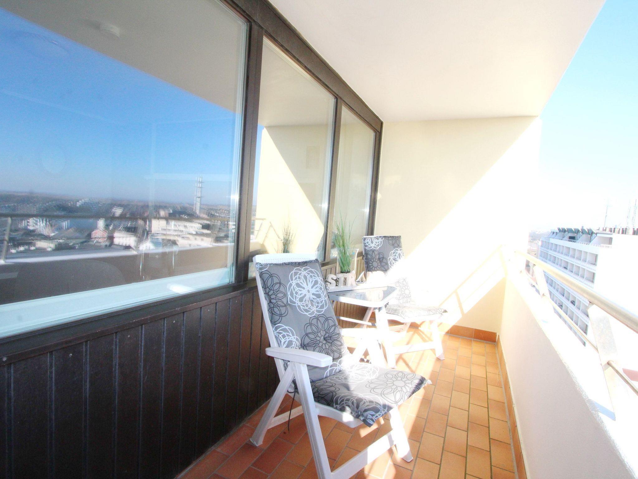 Einzimmerwohnung in der 9. Etage im Haus Metropol mit herrlichem Weitblick über die Insel und die Stadt Westerland. Bei klarem Wetter können sie bis zum nordfriesischen Wattenmeer und dem Festland schauen. Der kombinierte Wohn-/Schlafraum hat einen vorgelagerten großen Ostbalkon mit Balkonmöbeln und Auflagen. Ein Doppelschrankbett, ein Essplatz mit 2 Stühlen am Fenster, eine Couch und 2 Fernsehsessel mit Fusshockern und viel Schrankfläche, für Ihre persönlichen Dinge, steht ihnen zur Verfügung. Im Wohnraum wurde Designboden verlegt. Das Badezimmer hat eine Dusche, einen Duschhocker und einen Handtuchtrockner. In der separaten Küche mit Mikrowellen Backkombination, Ceranfeld mit 4 Herdplatten, Geschirrspüler und zusätzlicher Senseo Padmaschine können sie sich selbst verpflegen. Zur technischen Ausstattung dieser Wohnung gehört: ein Flachbildfernseher und ein Radio mit CD Player. Das freie WLAN Netzwerk Hotspot (WEG Haus Metropol - Passwortfrei - ohne Gewähr) steht ihnen kostenfrei zur Verfügung. Wohnungsgröße ca. 38 m².