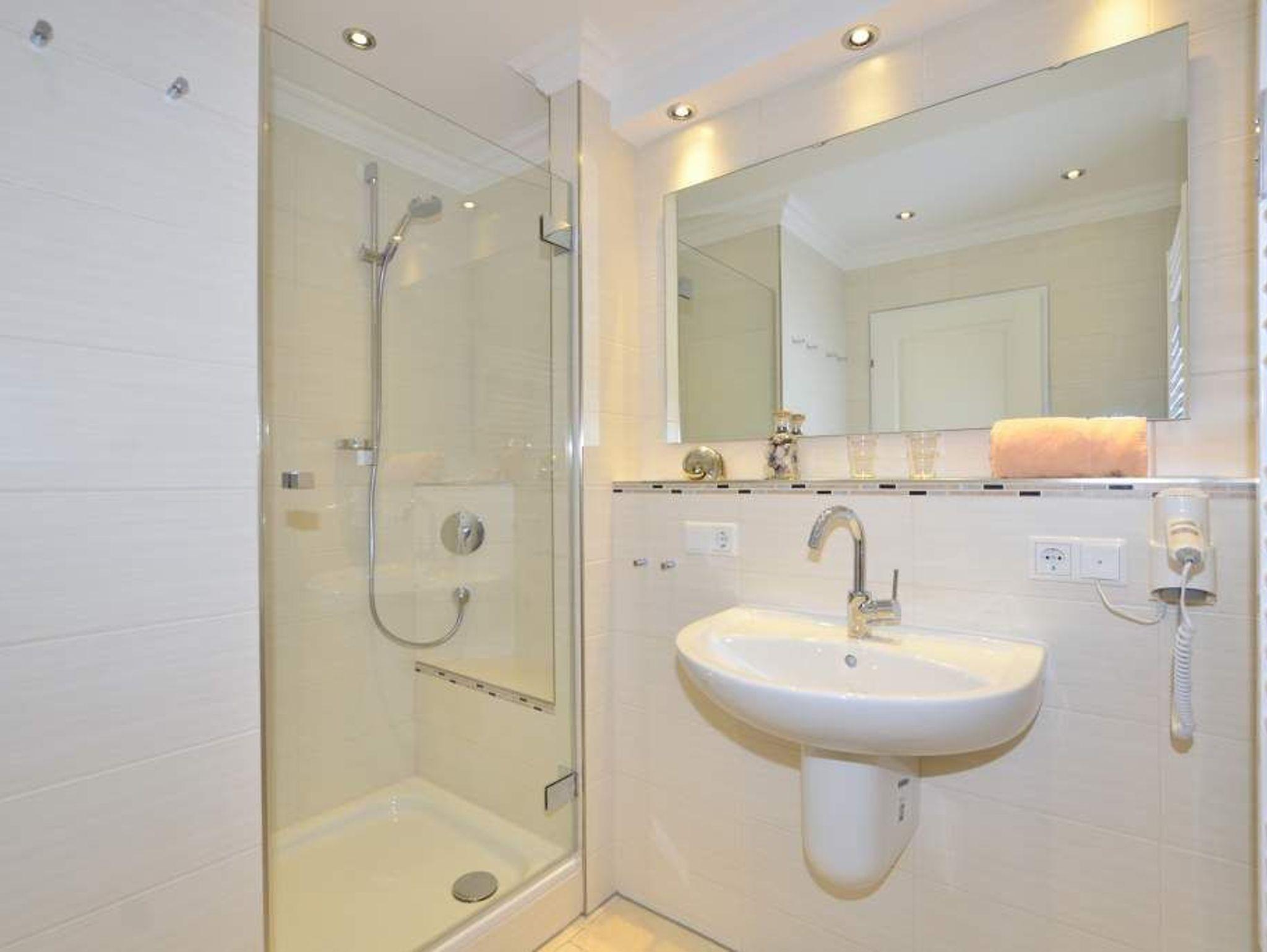 Das neue Badezimmer ist modern gestaltet und bietet eine Dusche mit kleiner Sitzbank, einen Waschtisch, ein WC, einen Handtuchtrockner und einen Fön.