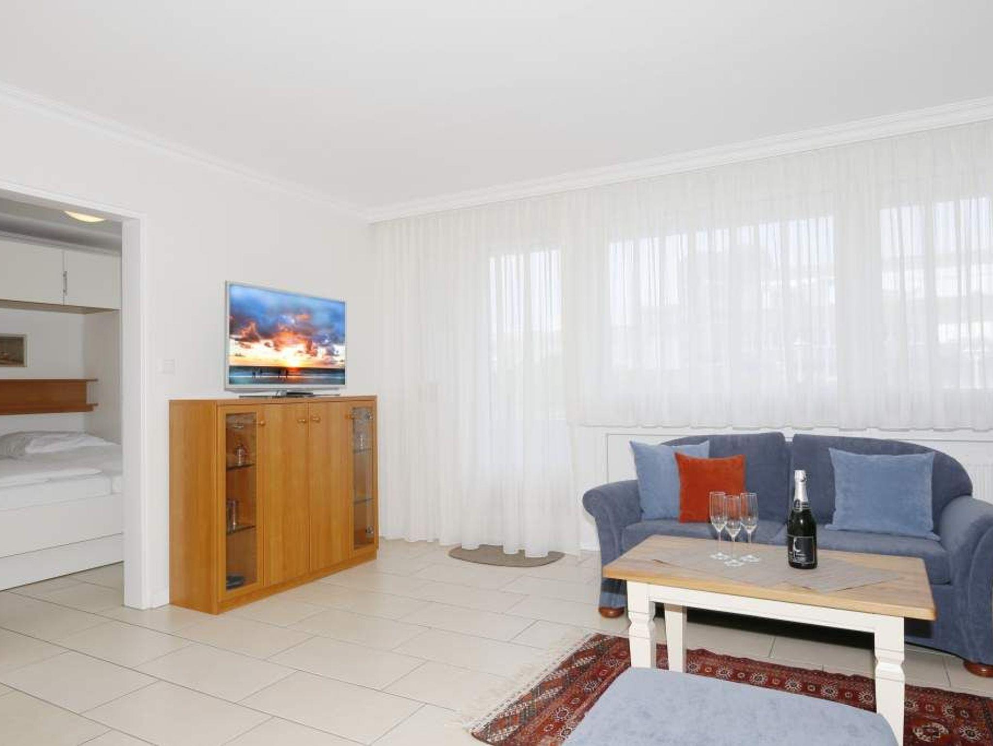 Vom Vorflur mit Garderobe gelangen Sie direkt in das helle Wohnzimmer mit Zugang zur Loggia, in die separate Küche sowie in das moderne, frisch renovierte Duschbad. Der Wohnraum ist mit zwei bequemen Zweisitzer-Sofas und einem Hocker ausgestattet, bietet einen gemütlichen Essplatz sowie ein komfortables Doppelschrankbett, das bei Bedarf zwei zusätzliche Schlafplätze schafft. Ein Kabel-Flachbild-TV mit digitalem Empfang sowie eine HiFi-Anlage sorgen für Unterhaltung. Vom Wohnzimmer aus erreichen Sie auch das separate Schlafzimmer.