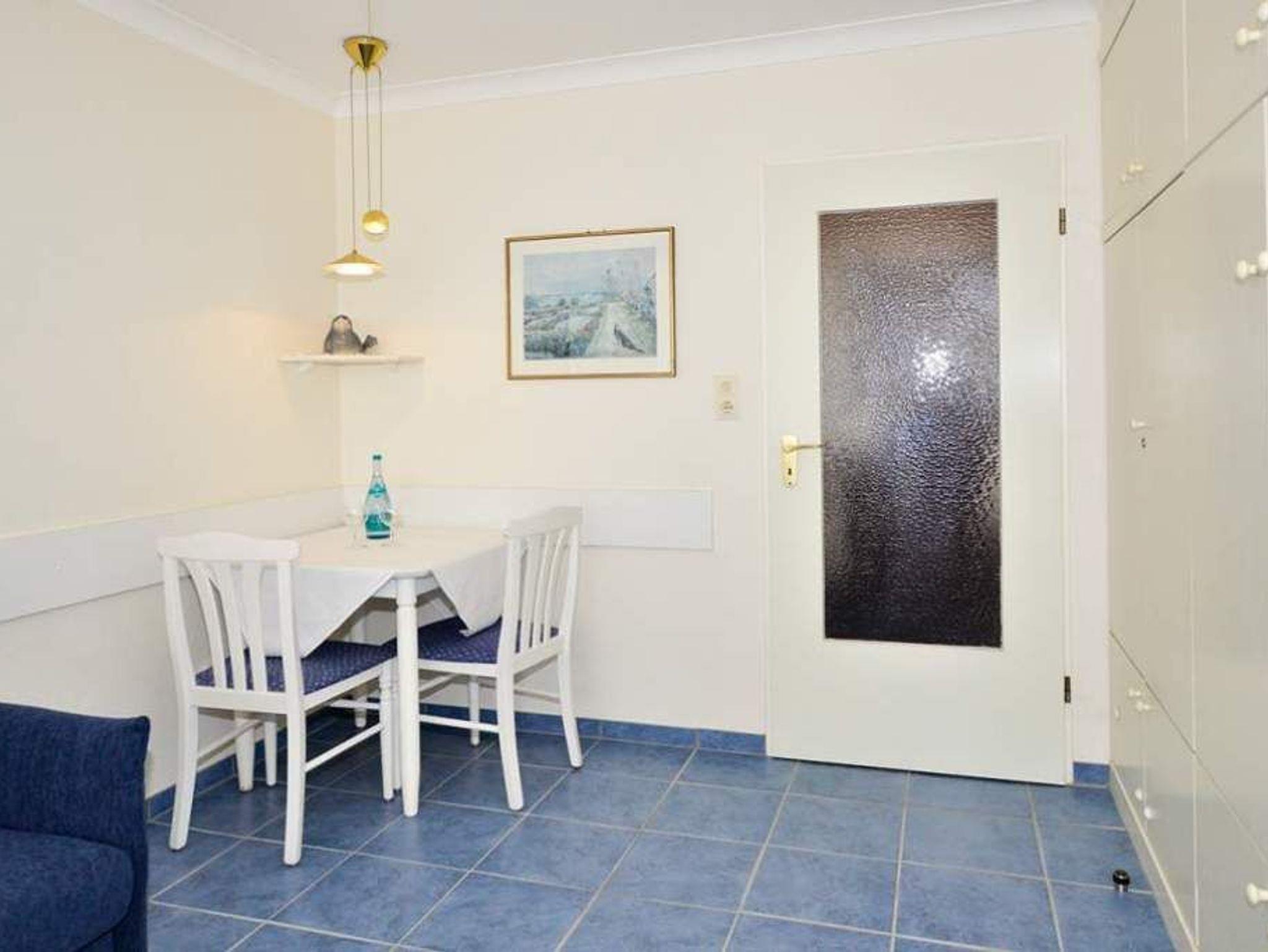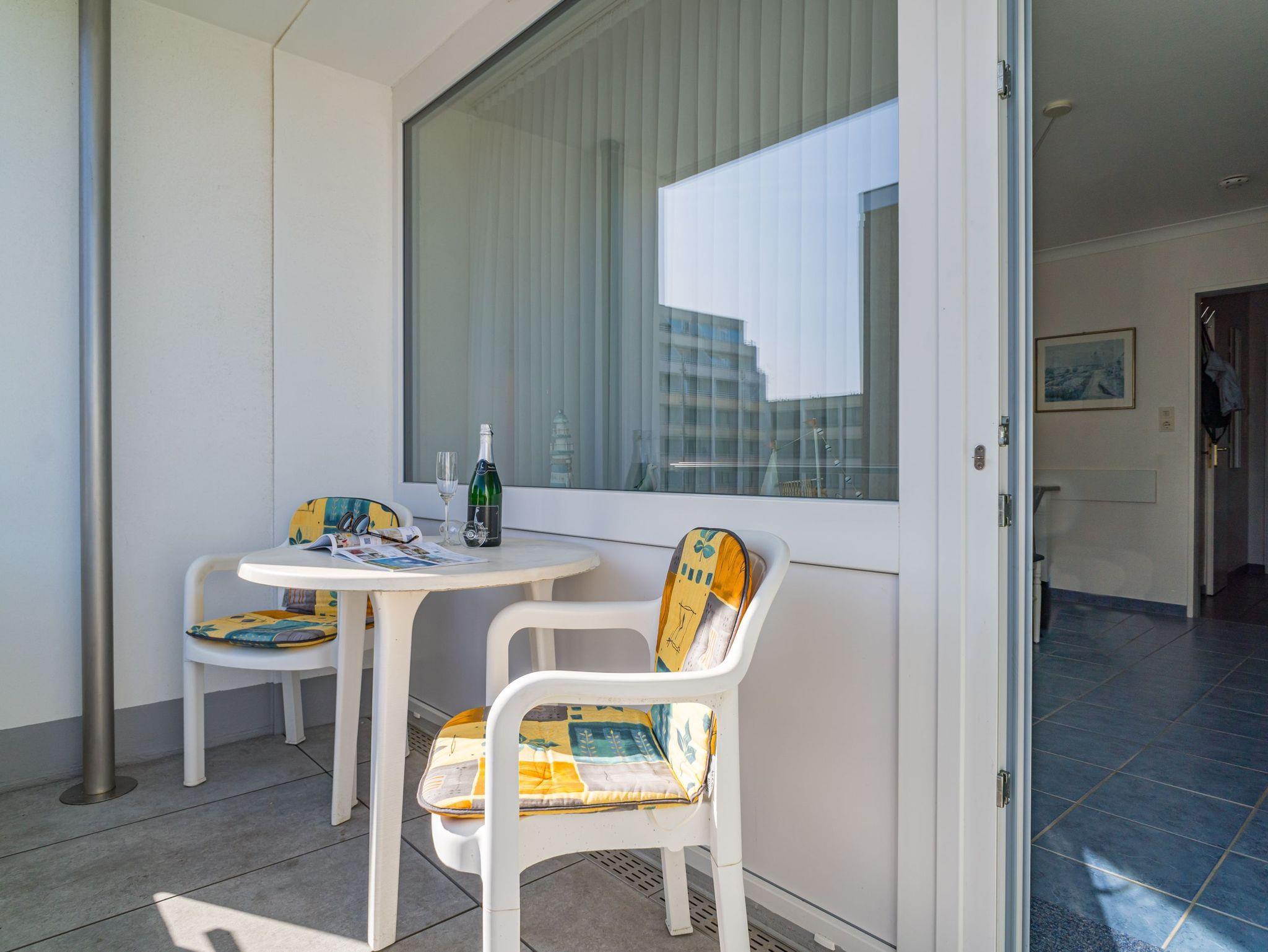 1-Zimmer-Nichtraucher-Ferienwohnung (ca. 23 qm) in der 2. Etage zur Landseite mit Ostloggia (Morgensonne, mit Balkonmöbeln und Auflagen) für max. 2 Personen.