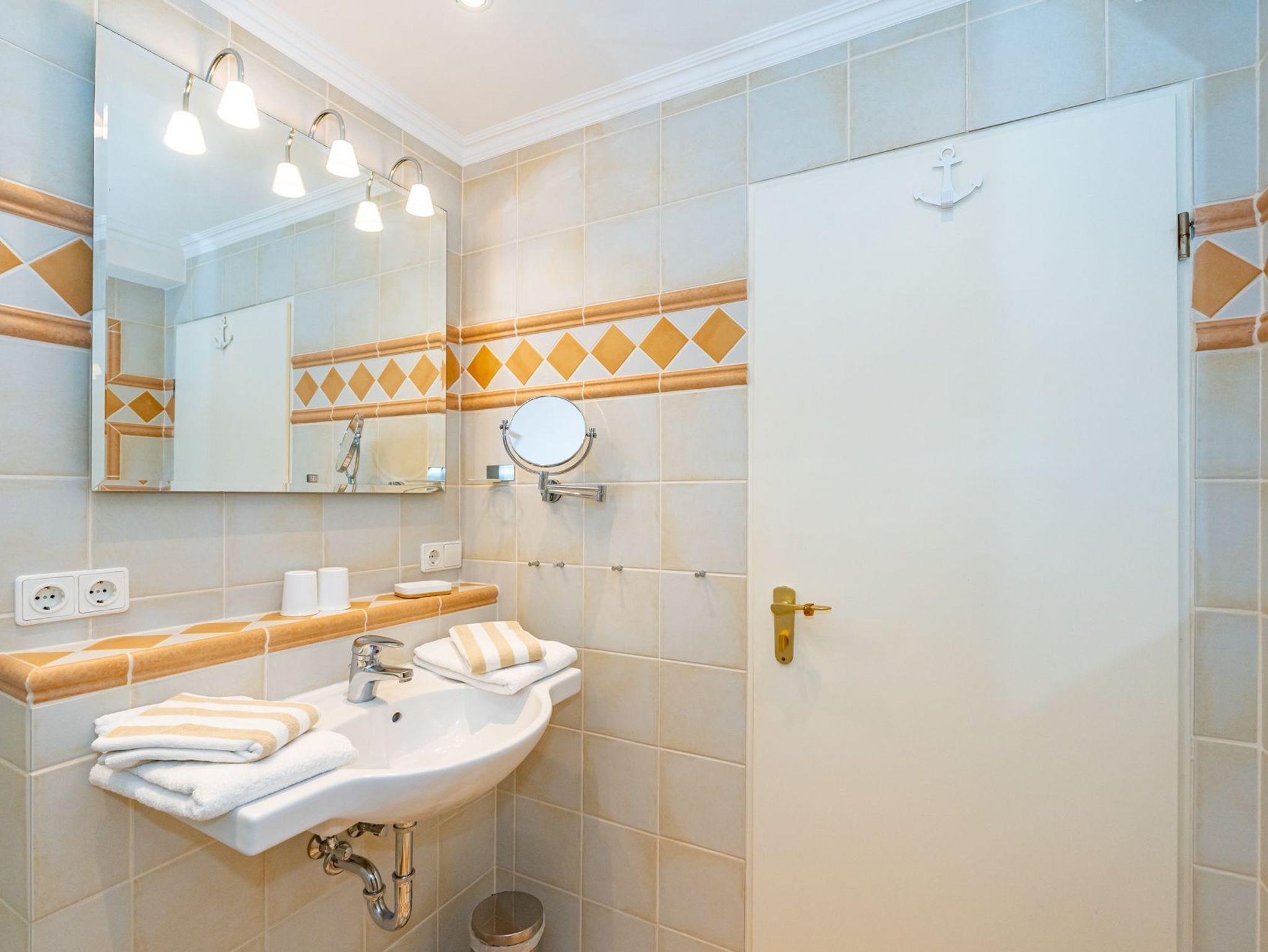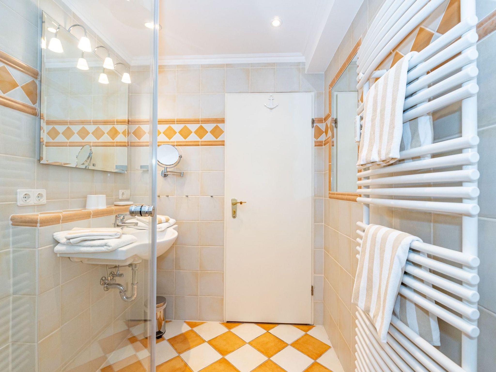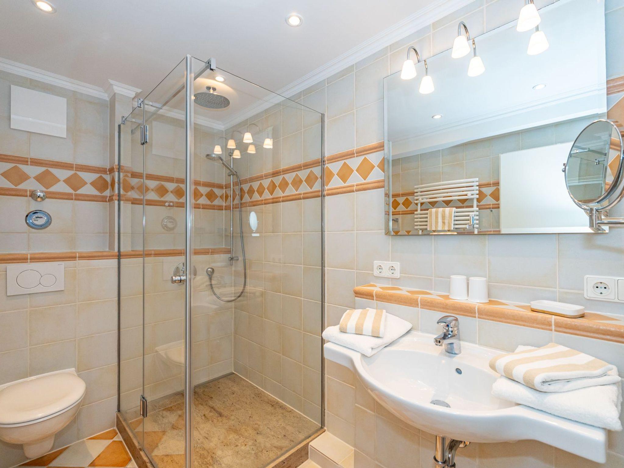 Im modernen Bad befinden sich eine Dusche mit niedrigem Einstieg, ein WC und ein Waschtisch.