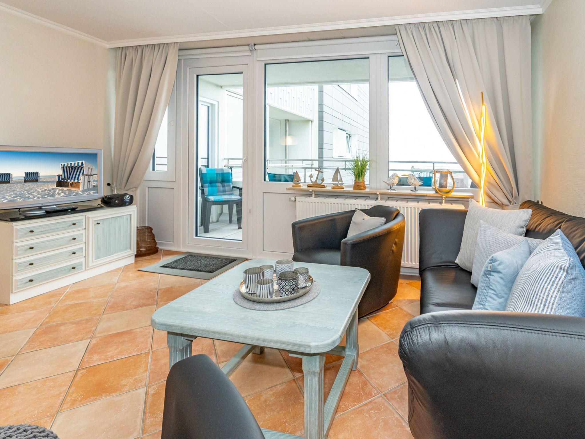 Gemütlich eingerichtete 2-Zimmer-Nichtraucher-Ferienwohnung, ca. 59 qm, in der 5. Etage zur Seeseite mit eingeschränktem Meerblick und Westloggia (Abendsonne mit Balkonmöbel und Auflagen) für 4 Personen.