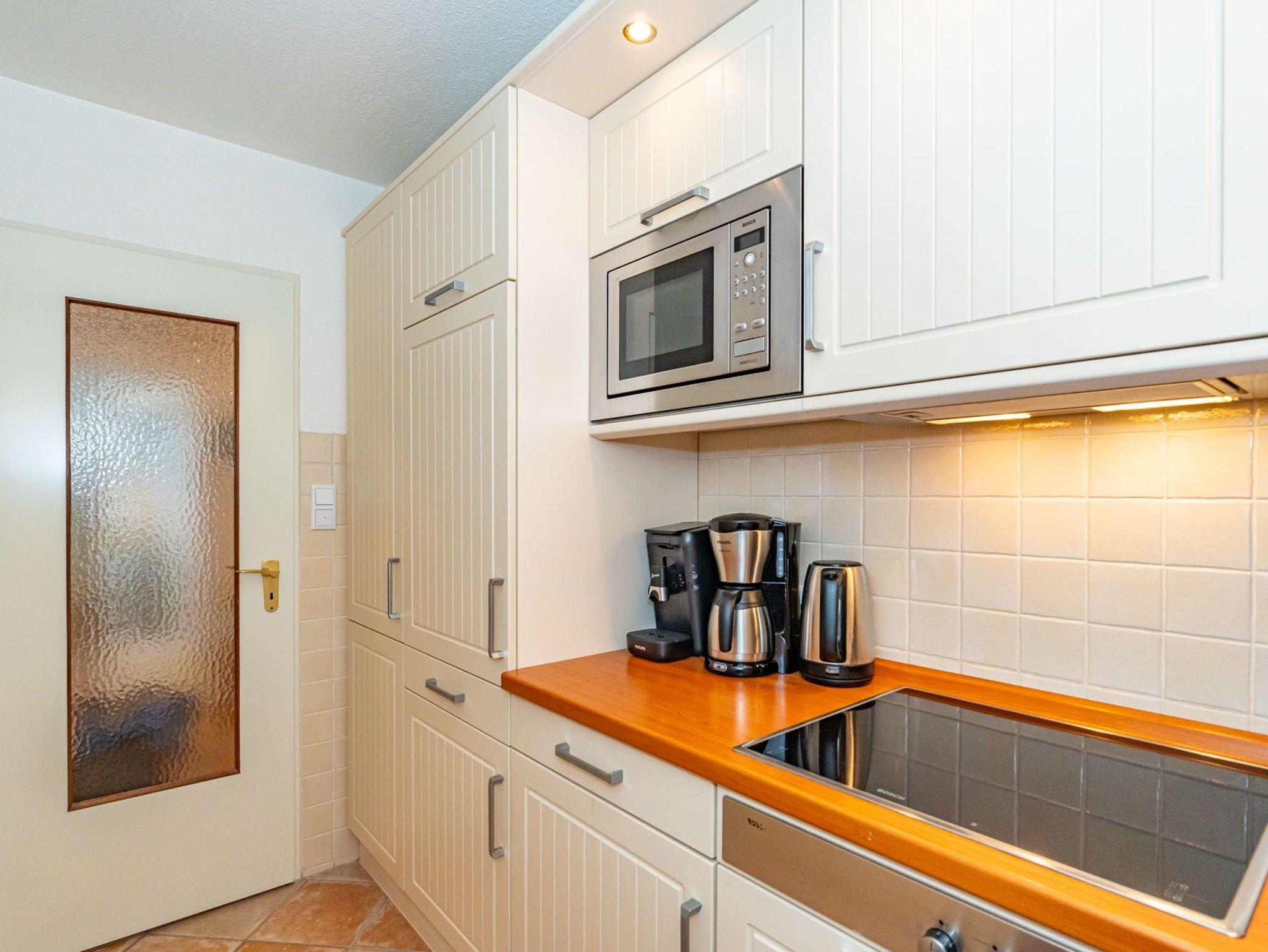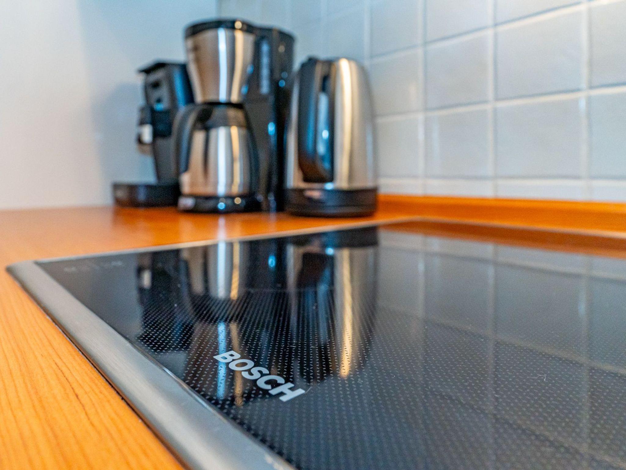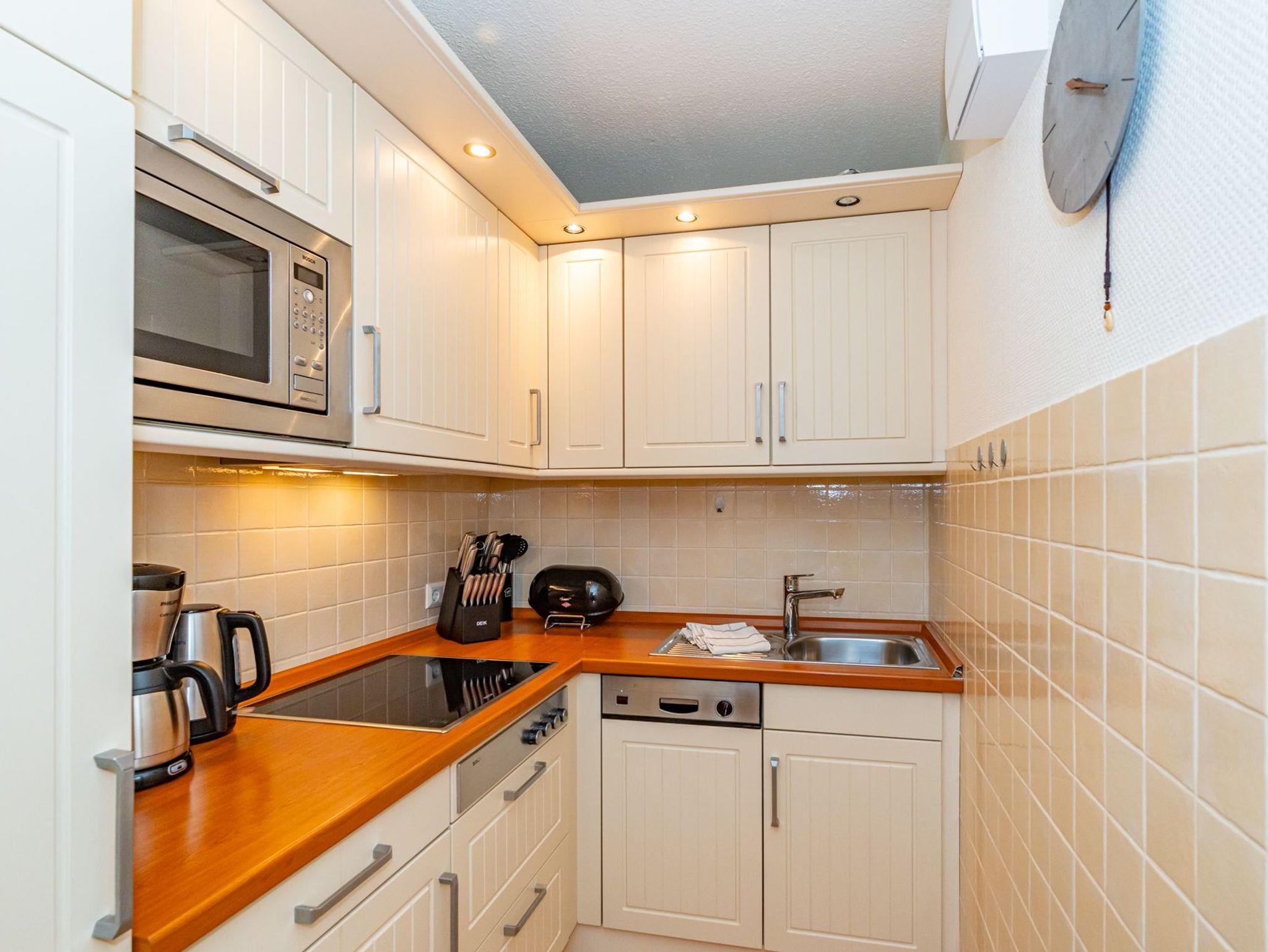 Die separate Küche hat einen Geschirrspüler, eine Mikrowelle, ein Ceranfeld. Kaffeemaschine, Senseomaschine, Wasserkocher und Toaster gehören zur Grundausstattung.
