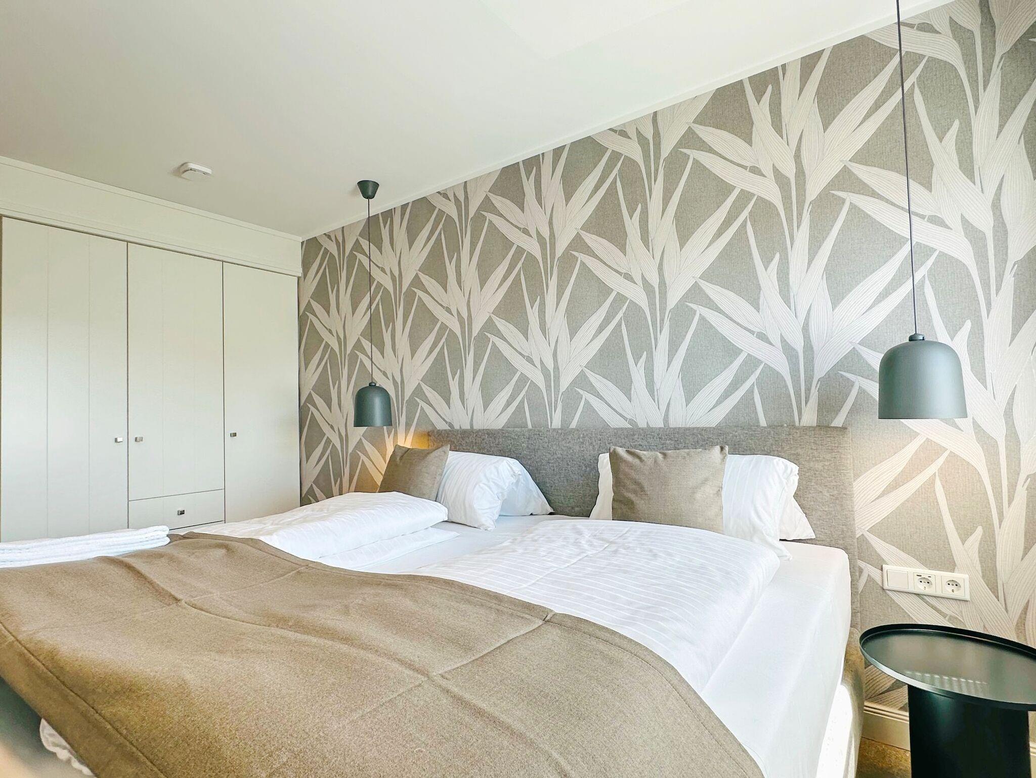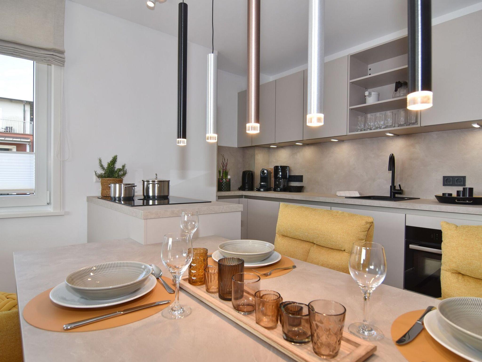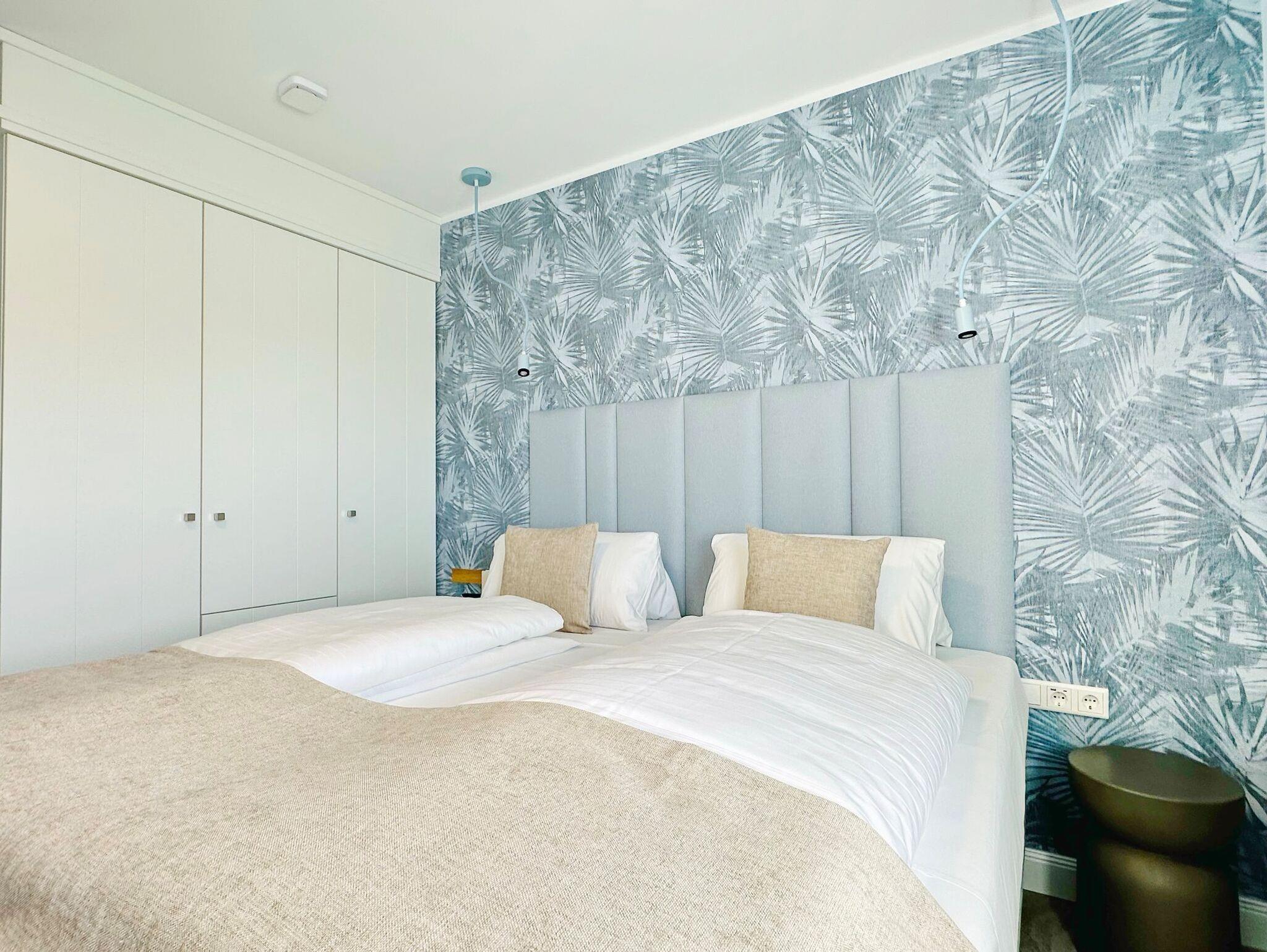Die hochwertige 3-Zimmer-Wohnung im 2. OG mit ca. 81 qm ist für maximal 4 Personen. Vom geräumigen Flur mit Garderobe gelangen Sie in das Wohnzimmer mit offener Küche und möblierten Südbalkon. Die hochwertige Küche bietet neben Bora Induktionsherd auch Geschirrspüler, Tiefkühlschrank und Backofen mit integrierter Mikrowelle. Beide Schlafräume bieten mit Boxspringbetten (180x200 und 200x200) der Marke FBF hochwertigen Schlafkomfort und verfügen über Einbauschrank und TV (1 Kinderbett ist in beiden Schlafzimmern zubuchbar). Die Wohnung verfügt über 2 moderne Duschbäder mit Haar- und Handtuchtrockner. Die Wohnung ist mit großformatigen Fliesen ausgelegt und verfügt über Fußbodenheizung. Lediglich die Schlafräume sind mit Teppichware versehen. Internet (ohne Gewähr) und Smart-TV sind vorhanden.