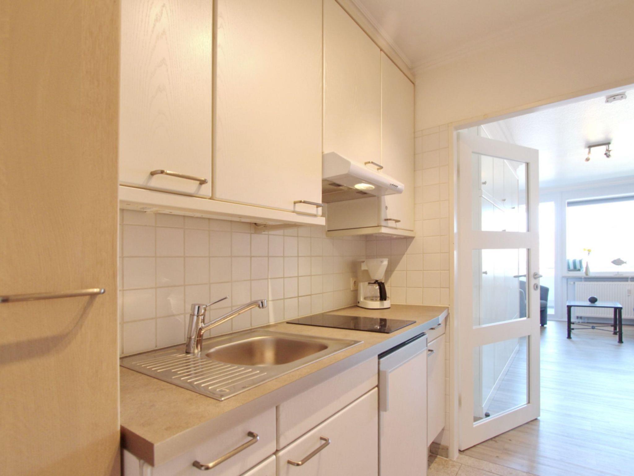 Hell und gemütlich eingerichtete Einzimmerwohnung in der 2. Etage im Haus Wiking mit vorgelagerter West-Loggia - auf der man ab Mittags die Sonne genießen kann. Der kombinierte Wohn-/Schlafraum ist mit einem Doppelschrankbett einer Couchgarnitur mit Sessel und einem Essplatz ausgestattet. Durch den Designfussboden in Holzoptik eignet sich die Wohnung hervorragend für Hausstauballergiker. Um sich selbst zu verpflegen gibt es im Vorflur eine Einbauküche mit[nbsp] einem Induktionsherd, eine Mikrowelle und eine Nespressomaschine. Das modernisierte Badezimmer ist mit einer Dusche mit niedrigem Einstieg, Waschbecken, Handtuchheizkörper, Schminkspiegel und Fön ausgestattet. Zur technischen Ausstattung der Wohnung gehört ein Flachbild-TV, ein Safe, ein Radio mit Ipod-Dockingstation. Der freie WLAN Hotspot der WEG Haus Wiking (LAN1 - Passwortfrei - ohne Gewähr) steht ihnen kostenfrei zur Verfügung. Nichtraucherwohnung. Die Wohnung wurde vom DTV mit 3 Sternen klassifiziert. Wohnungsgröße ca. 27 m².