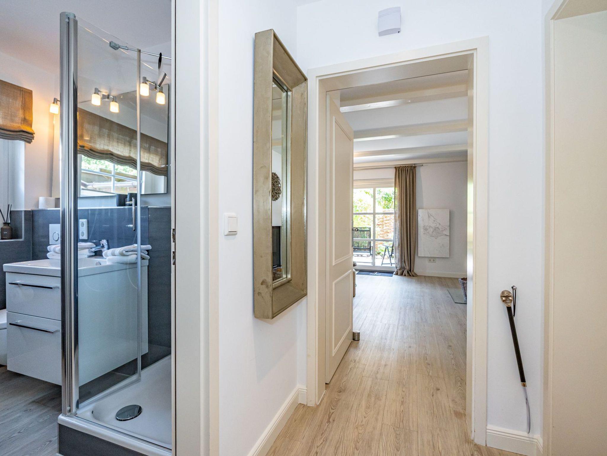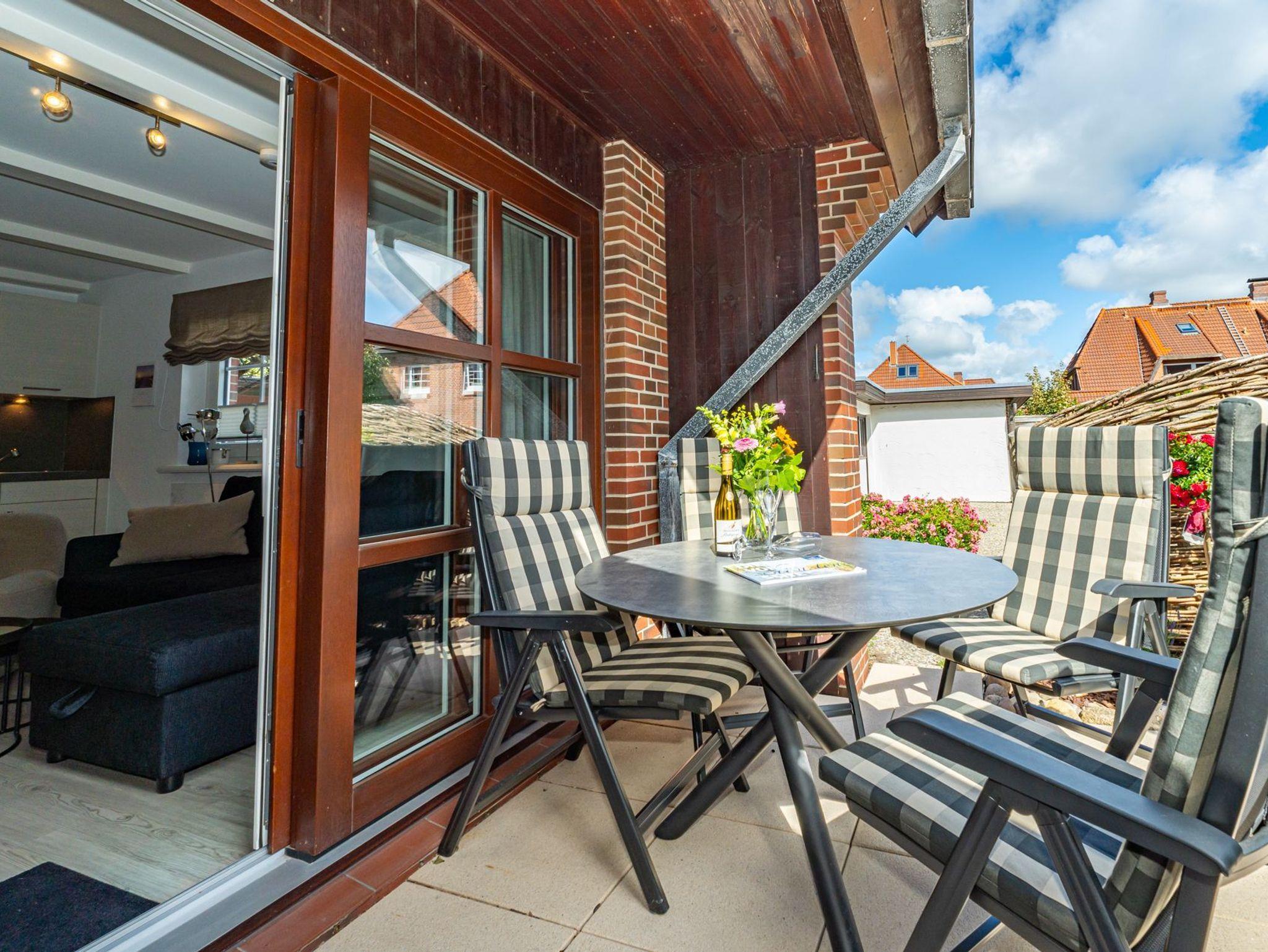 Hochwertig ausgestattete und exklusive 2-Zimmer-Nichtraucher-Ferienwohnung, ca. 45 qm im Parterre zur Südseite mit Südterrasse (mit Balkonmöbeln, Armlehnstühlen + Auflagen, Terrassentisch, Sonnenschirm + Ständer ) und Abstellraum auf der Terrasse für max. 2 Personen.