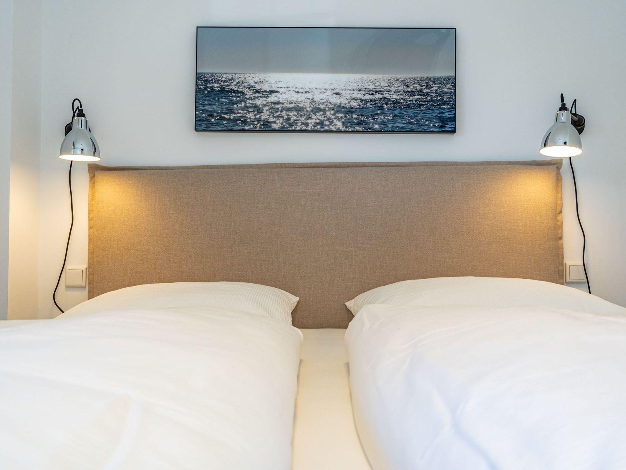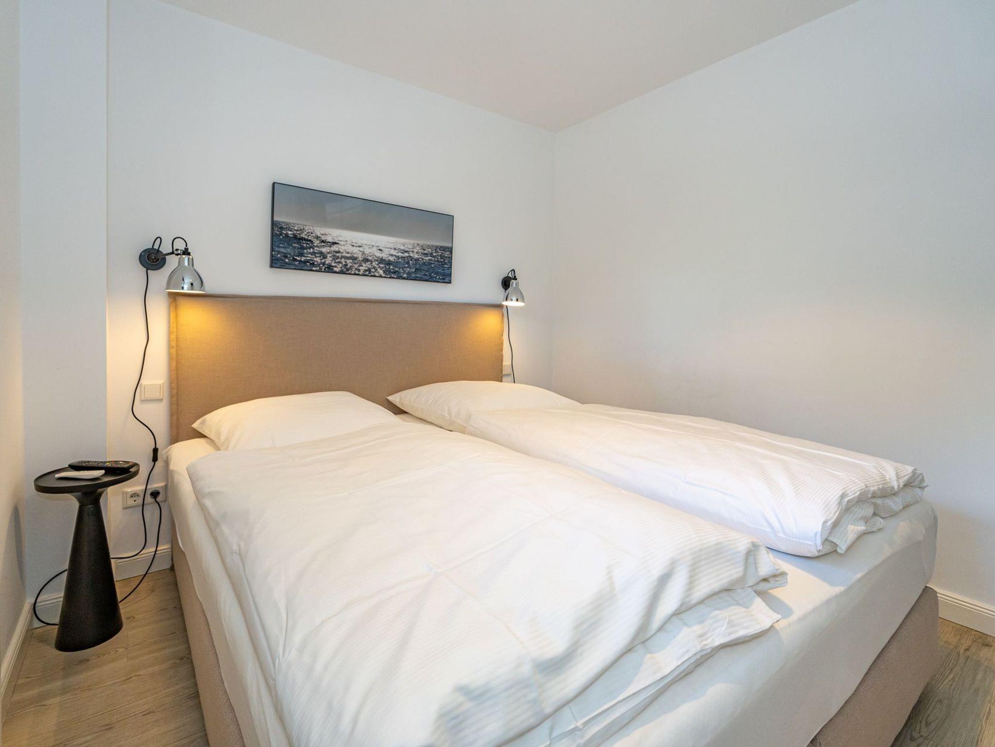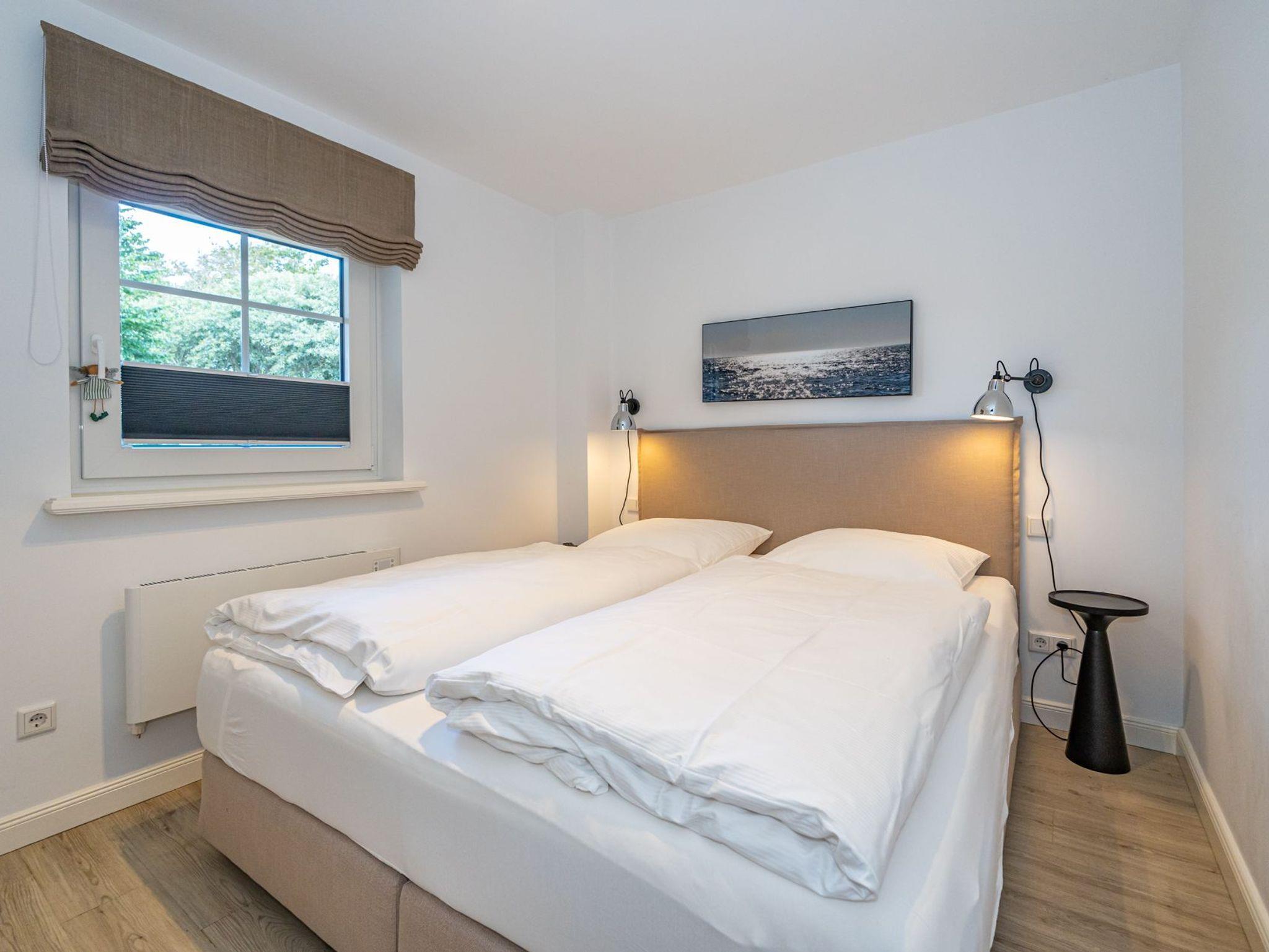 Das Schlafzimmer ist mit einem guten Boxspring-Doppelbett (Überlänge, zwei Einzelmatratzen je 0,90 x 2,10 m, mit durchgehendem Topper), Kleiderschrank und weiterem Flachbild-TV eingerichtet.
