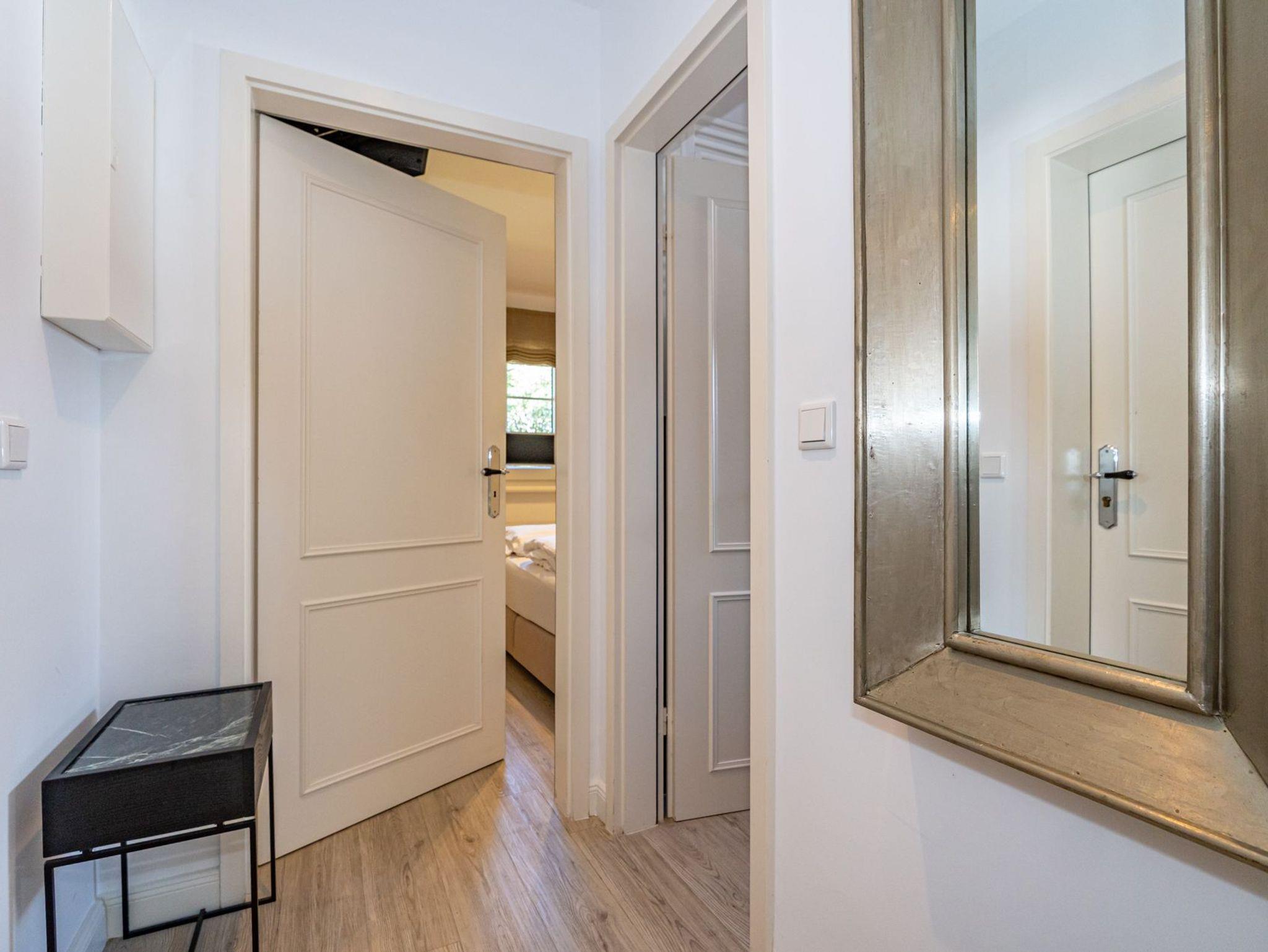 Vom Vorflur mit Garderobe gelangt man in das Wohnzimmer (mit Austritt zu der Südterrasse), das Schlafzimmer und das Duschbad/WC.