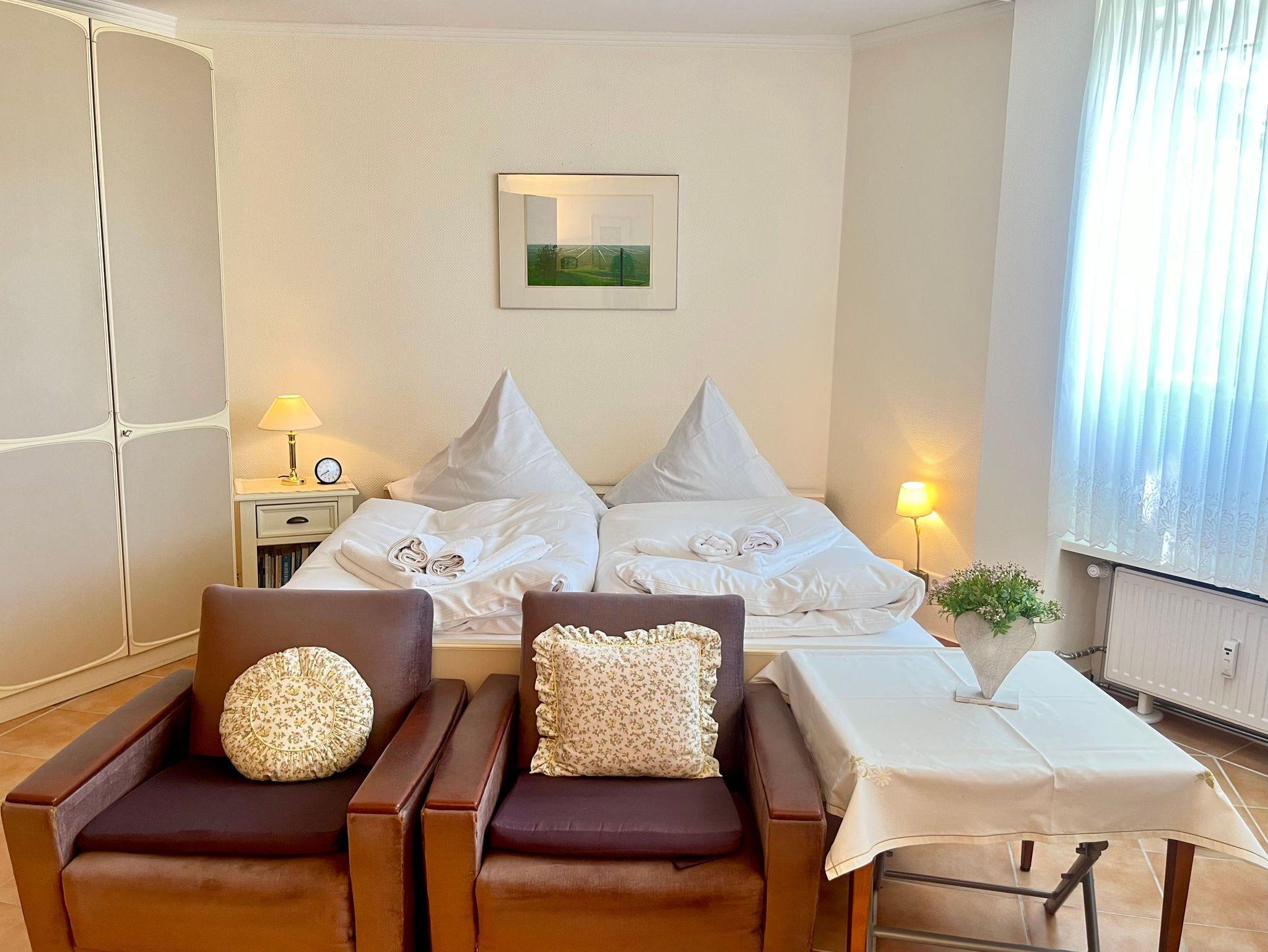 Ein kombinierter Wohn-Schlafraum mit Essecke, 2 Sesseln, Flachbild-TV, Doppelbett, Nachttischen, Leselampen, Kleiderschrank und Sideboard dienen zu Ihrem allgemeinen Wohlbefinden. Bettwäsche und Handtücher sind für Sie bereitgestellt.