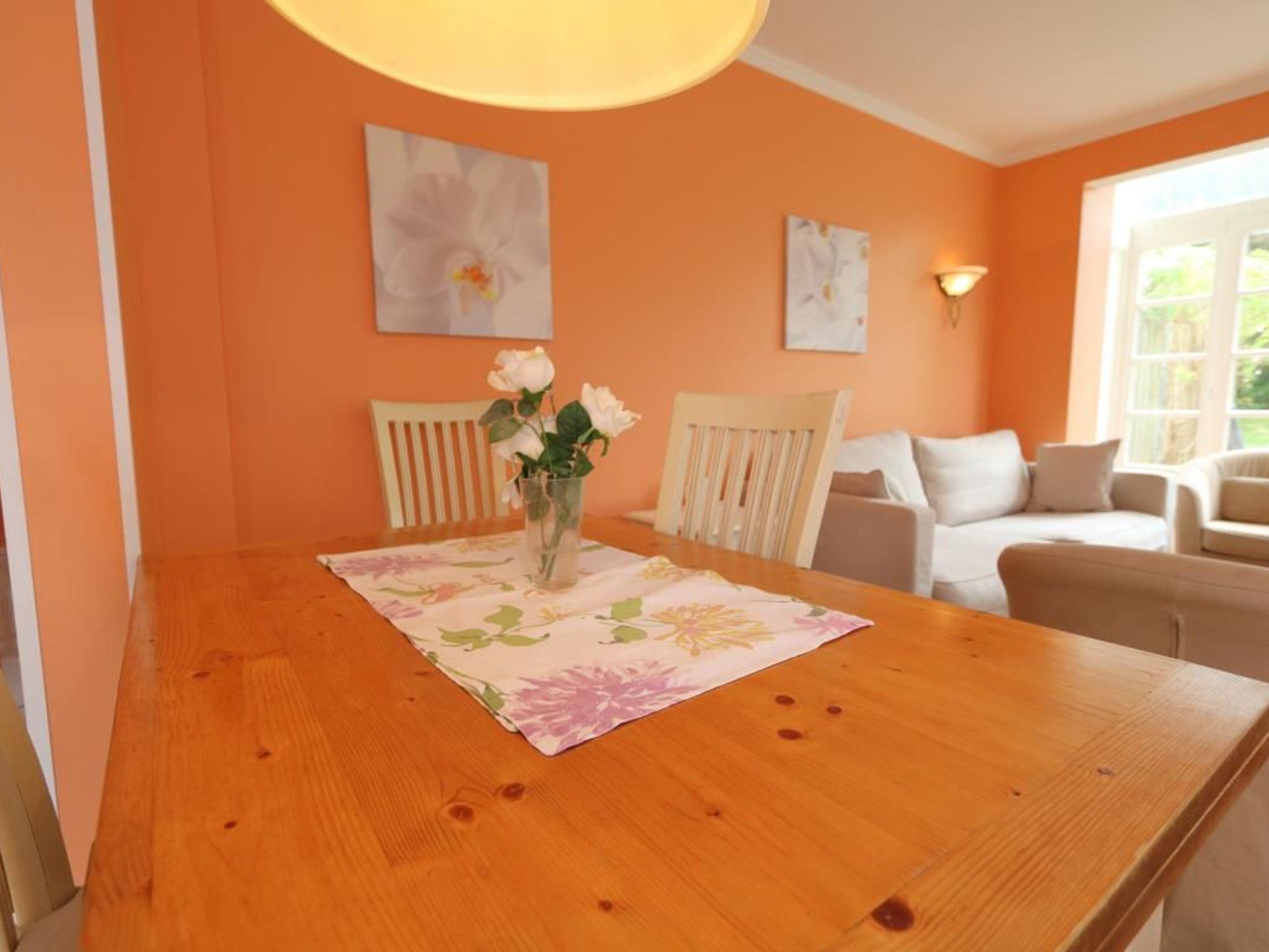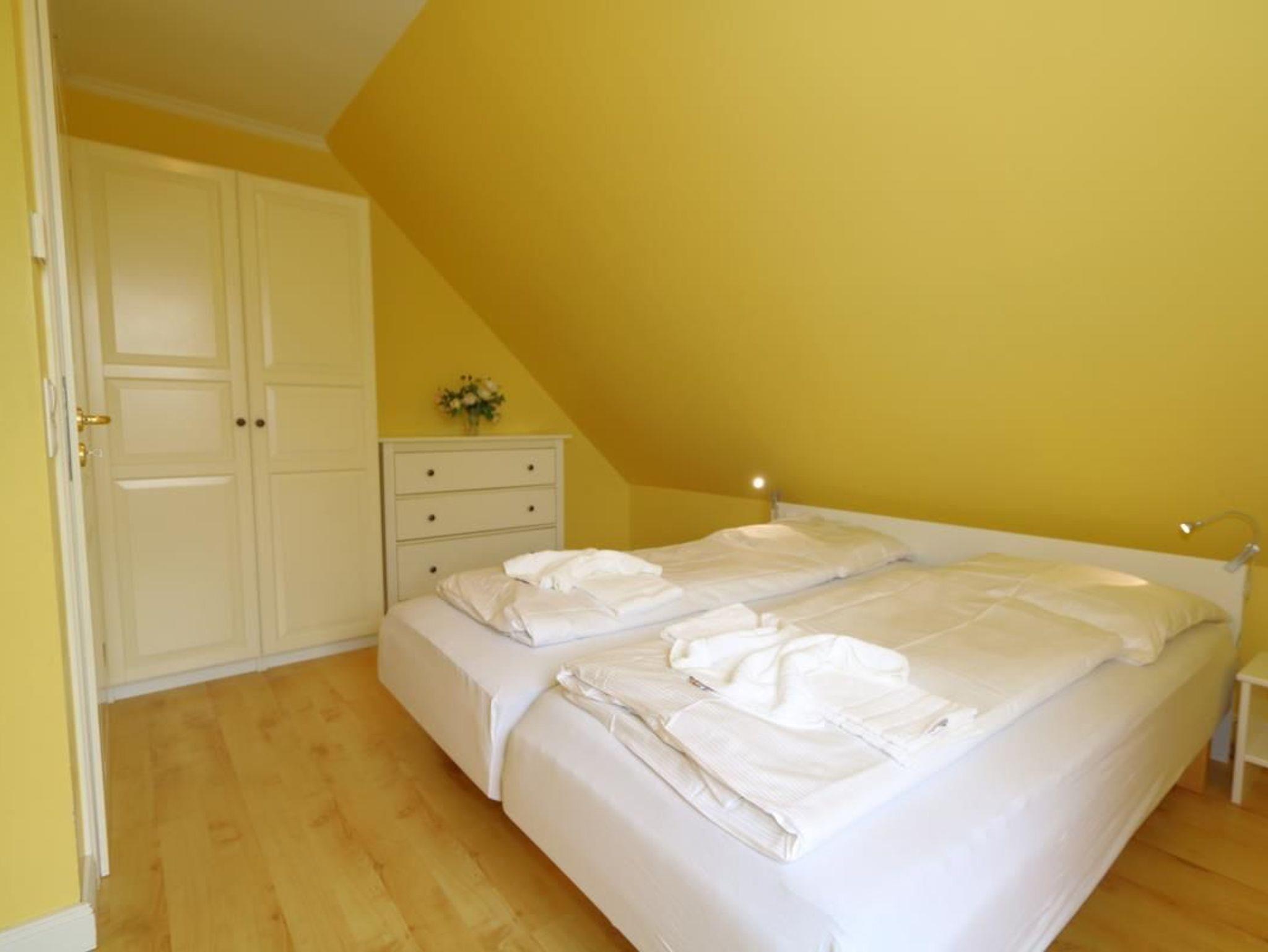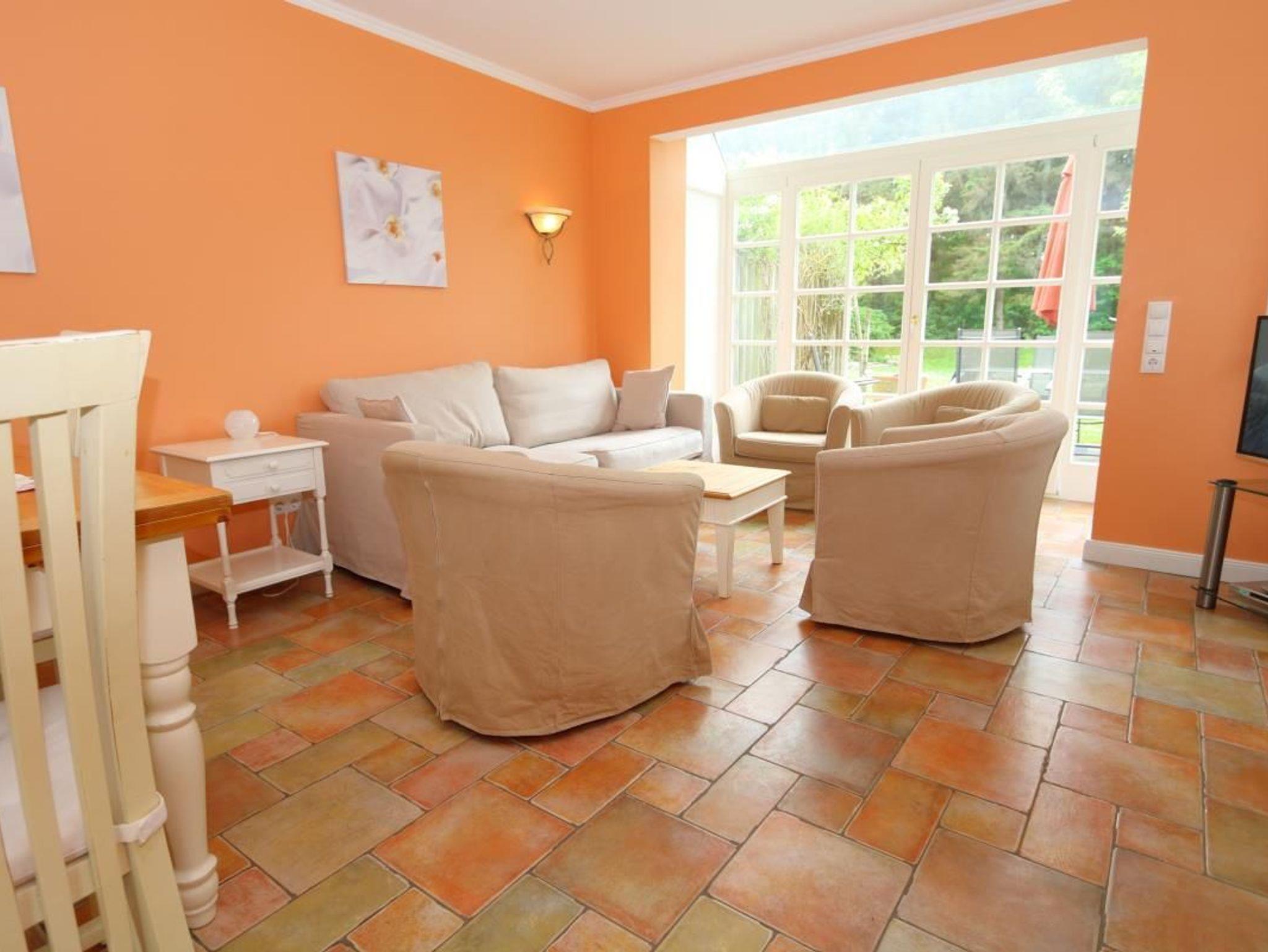 Die schöne Ferienwohnung Thomas Mann liegt direkt am Wald Friedrichshain und verfügt über eine große Terrasse für 6 Personen. Die harmonischen Farbnuancen im Wohnzimmer passen wunderbar zur hellen Einrichtung. Das Appartement verfügt über eine gut ausgestattete separate Küche, einen Soutterrain-Bereich und ein Obergeschoss mit modernem Badezimmer mit Duschwanne und zwei Waschbecken und über ein helles Schlafzimmer. Im Soutterain-Bereich befindet sich ebenfalls ein großes Badezimmer mit zwei Waschbecken und einer Dusche.