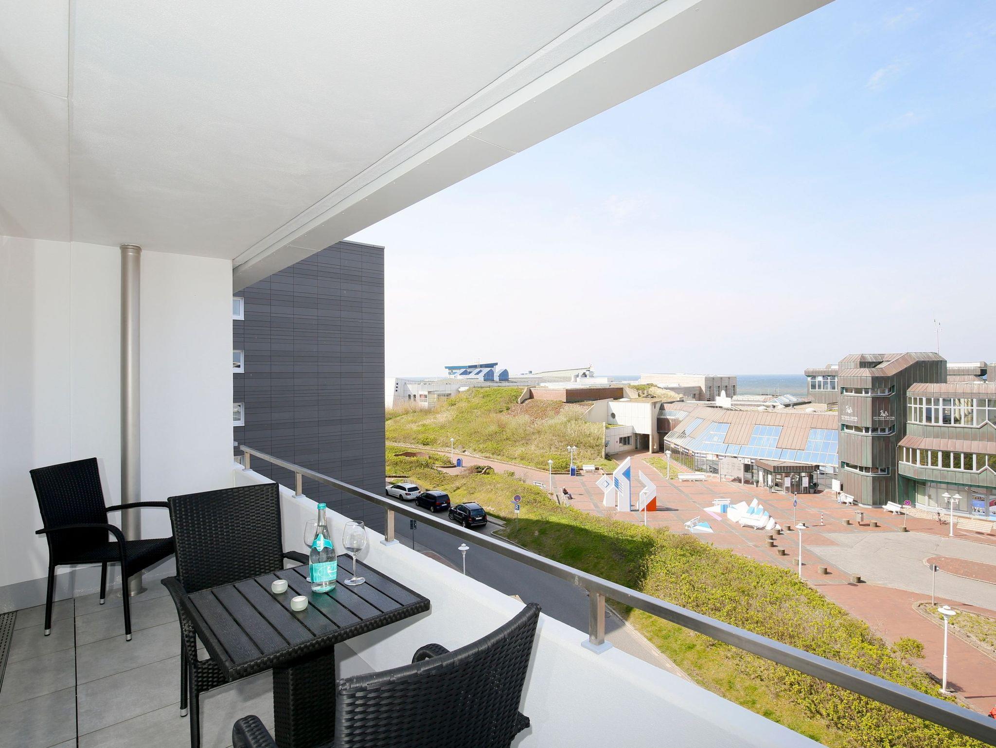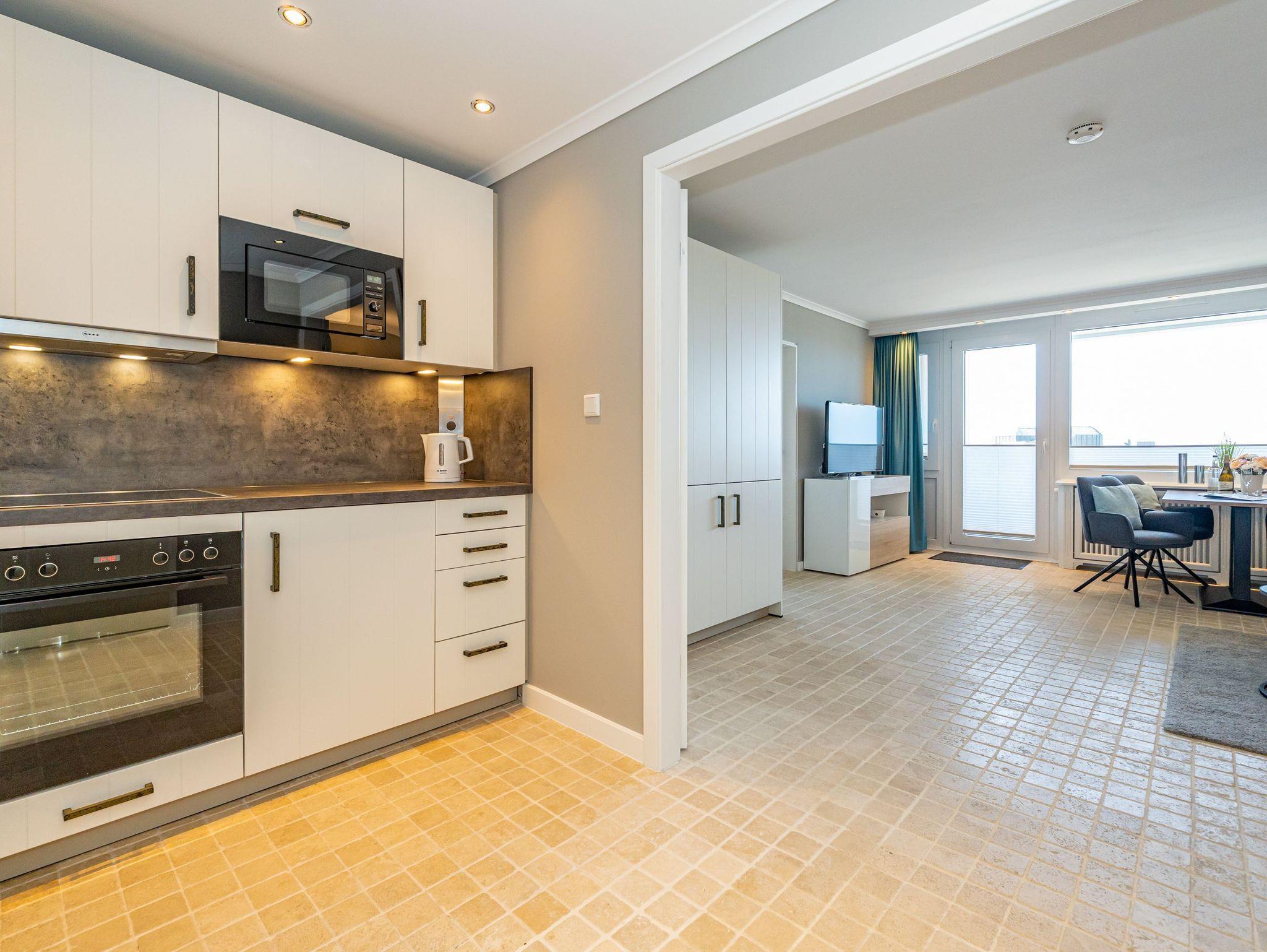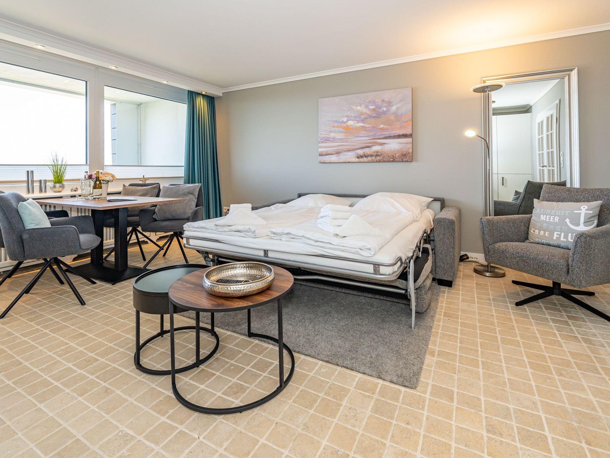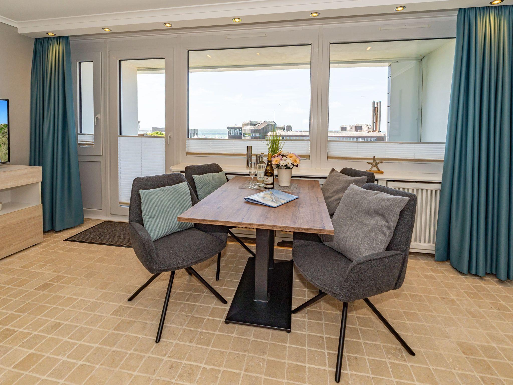 2025 renovierte, stilvolle 2-Zimmer-Nichtraucher-Ferienwohnung mit schönem Meerblick (ca. 51 qm) in der 4. Etage zur Seeseite mit 2 Westloggien (Nachmittagssonne, mit Balkonmöbeln und Auflagen) für max. 4 Personen.
