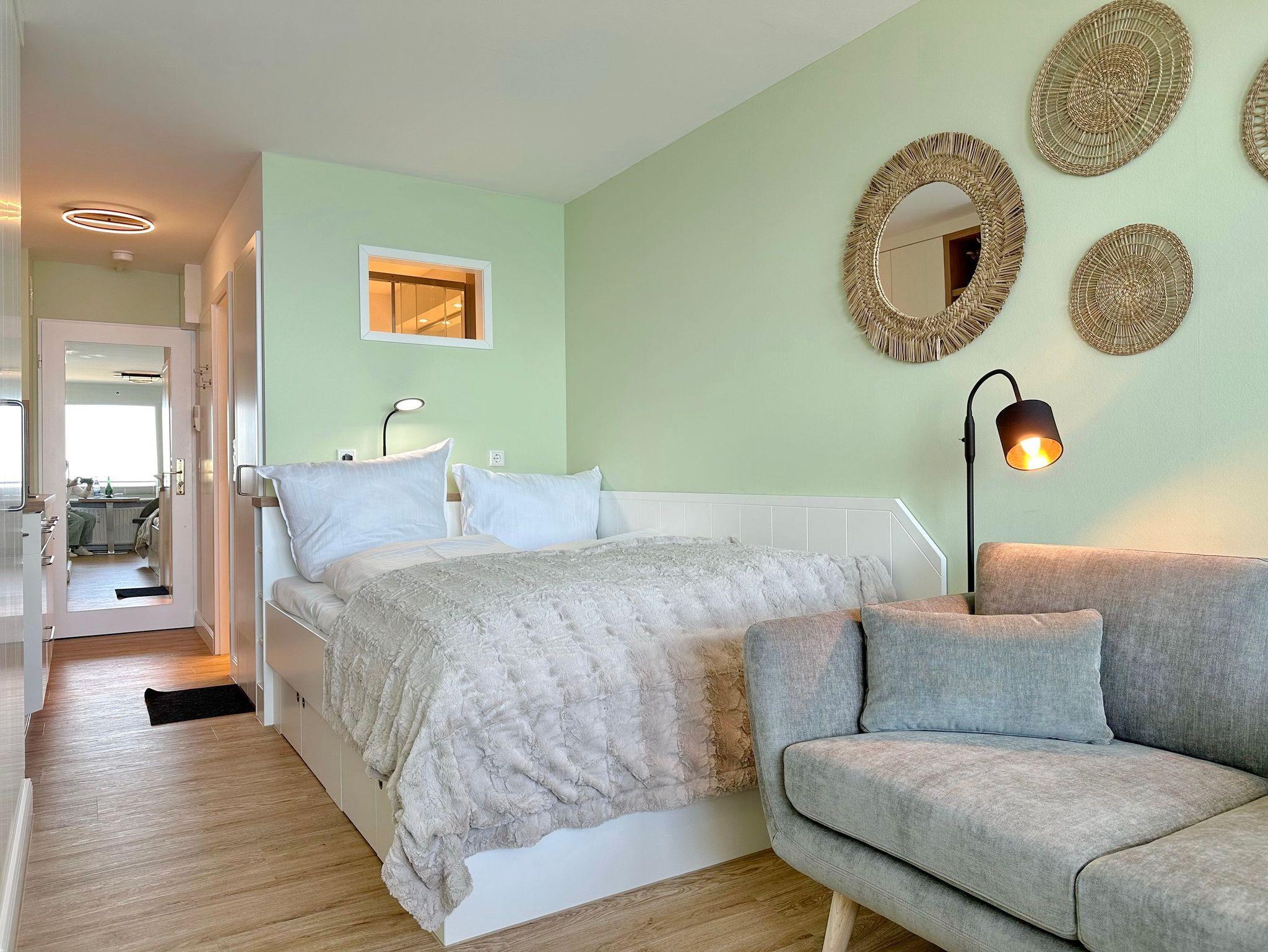 Moderne 1-Zimmer-Ferienwohnung mit freiem Seeblick und möbliertem Balkon im Haus Metropol auf Sylt.