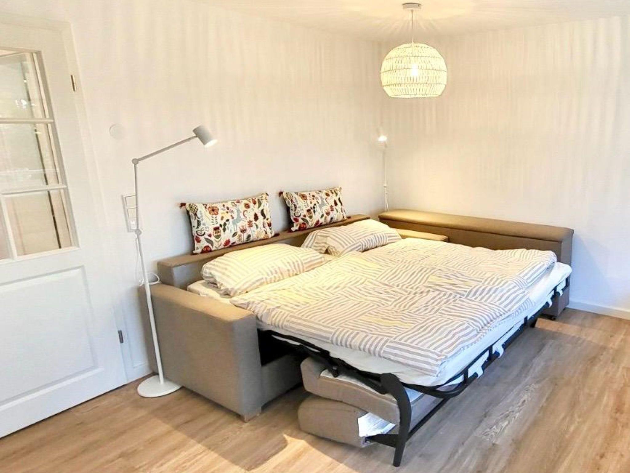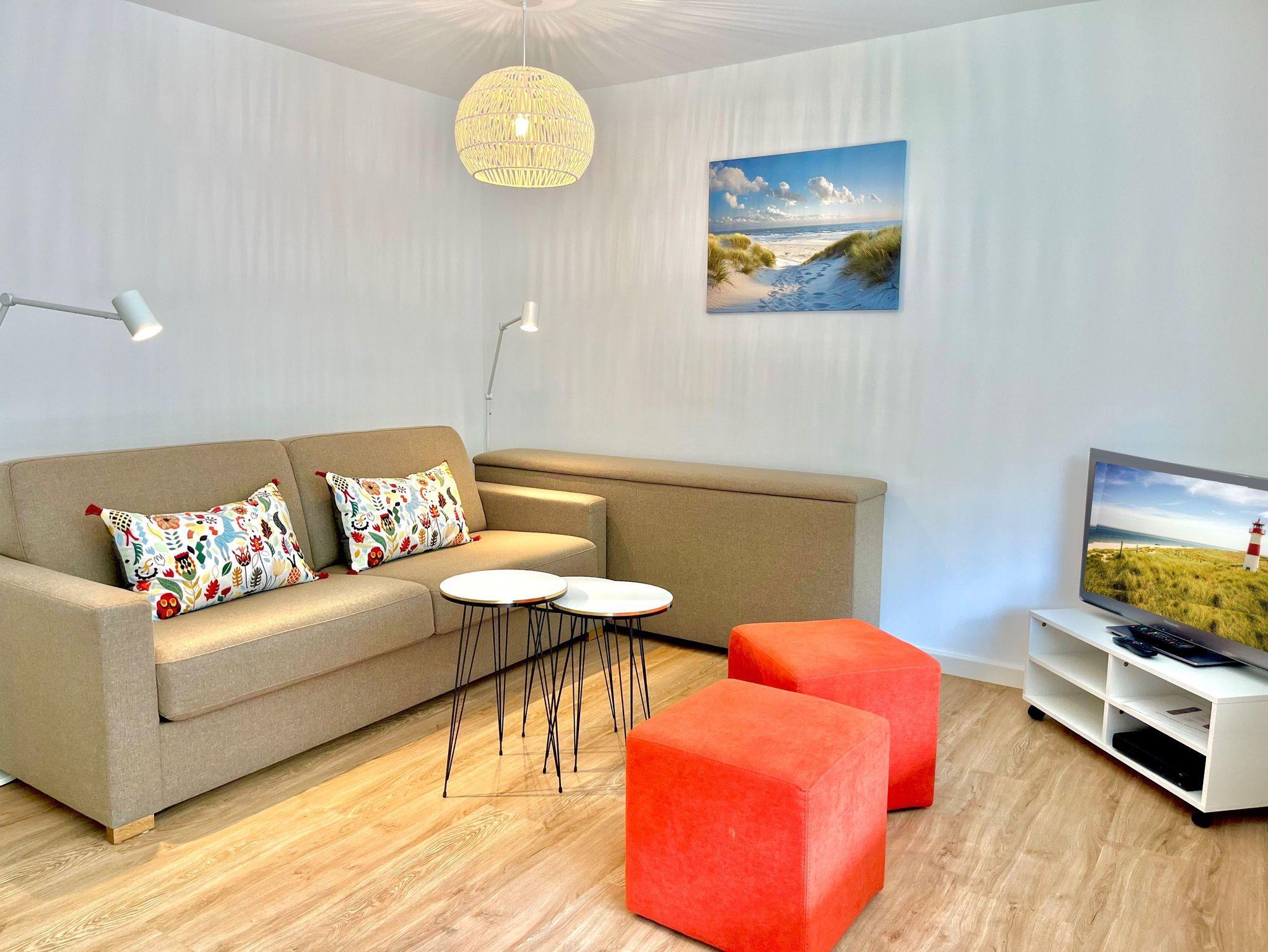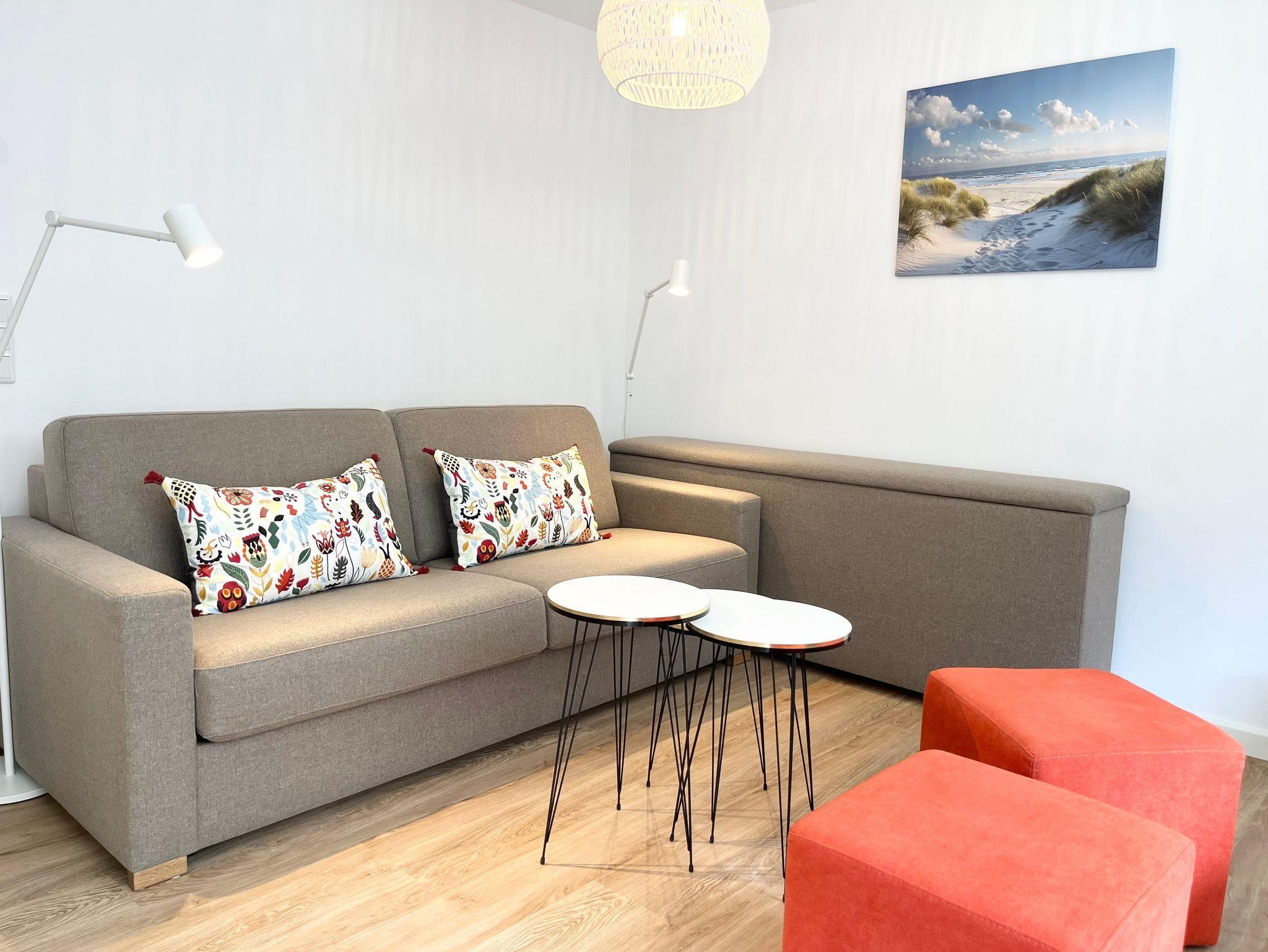 - Wohnraum: Der Wohnbereich ist mit einer Schlafcouch (170 x 200 cm) ausgestattet, die Platz für 2 weitere Personen bietet.