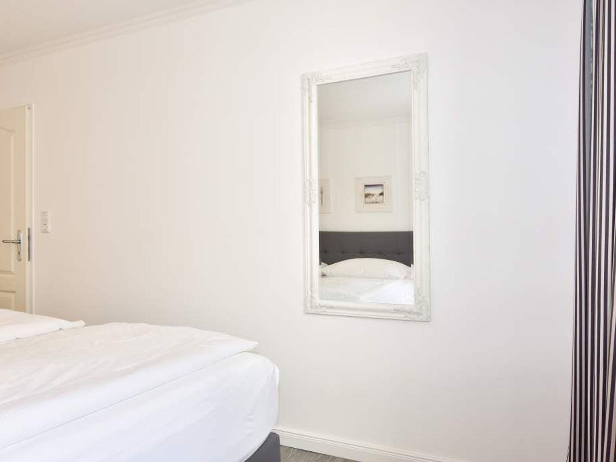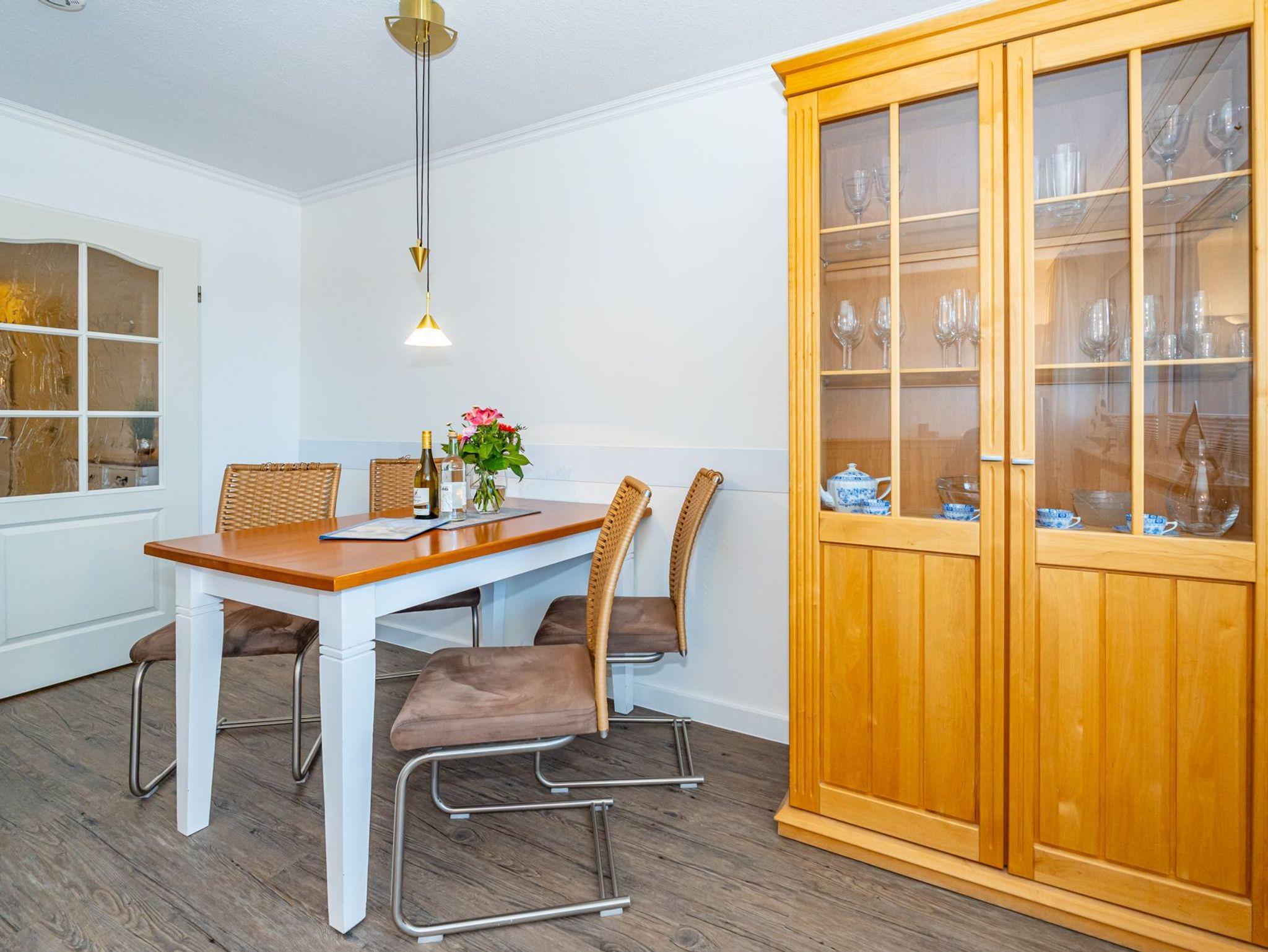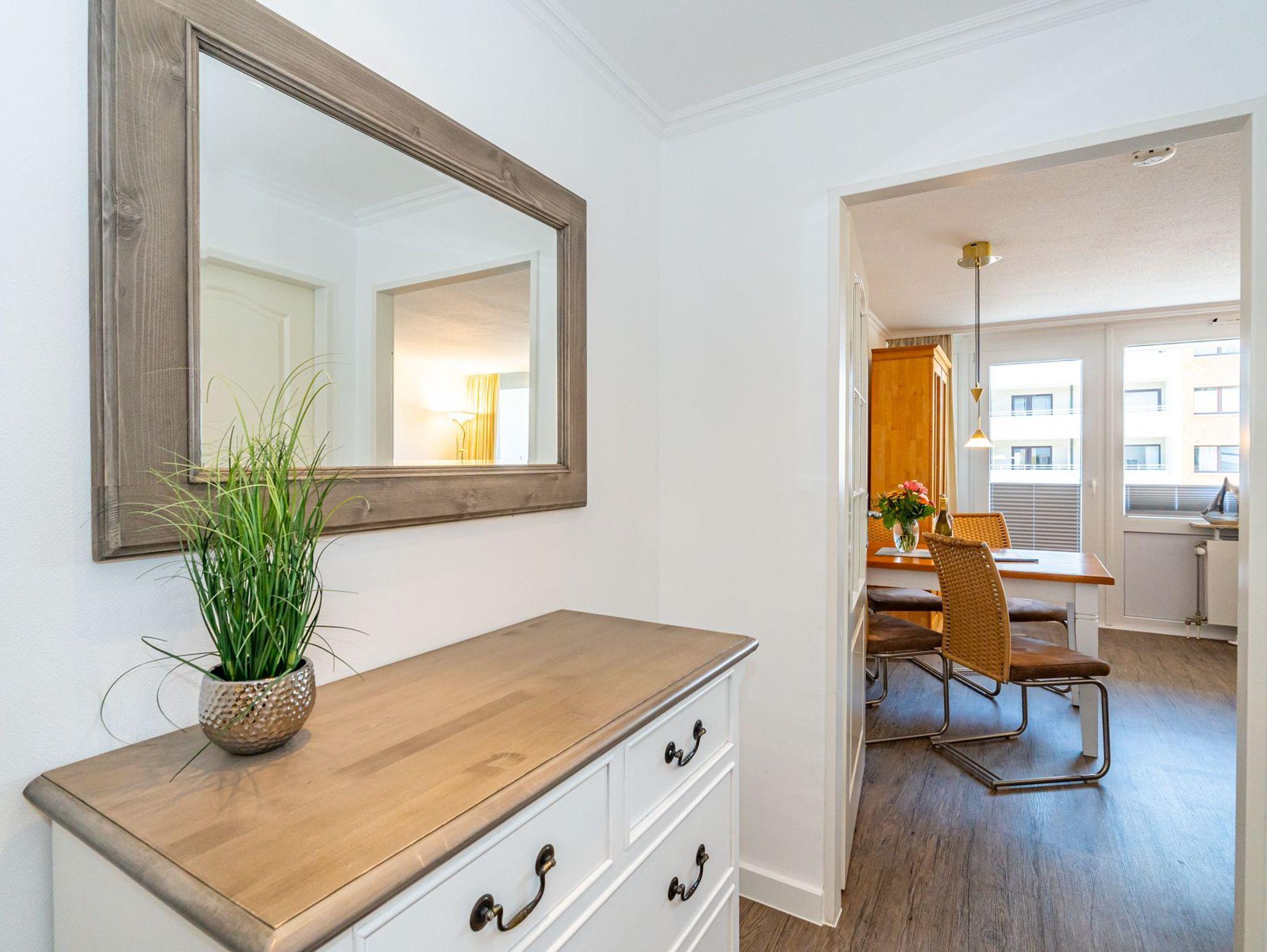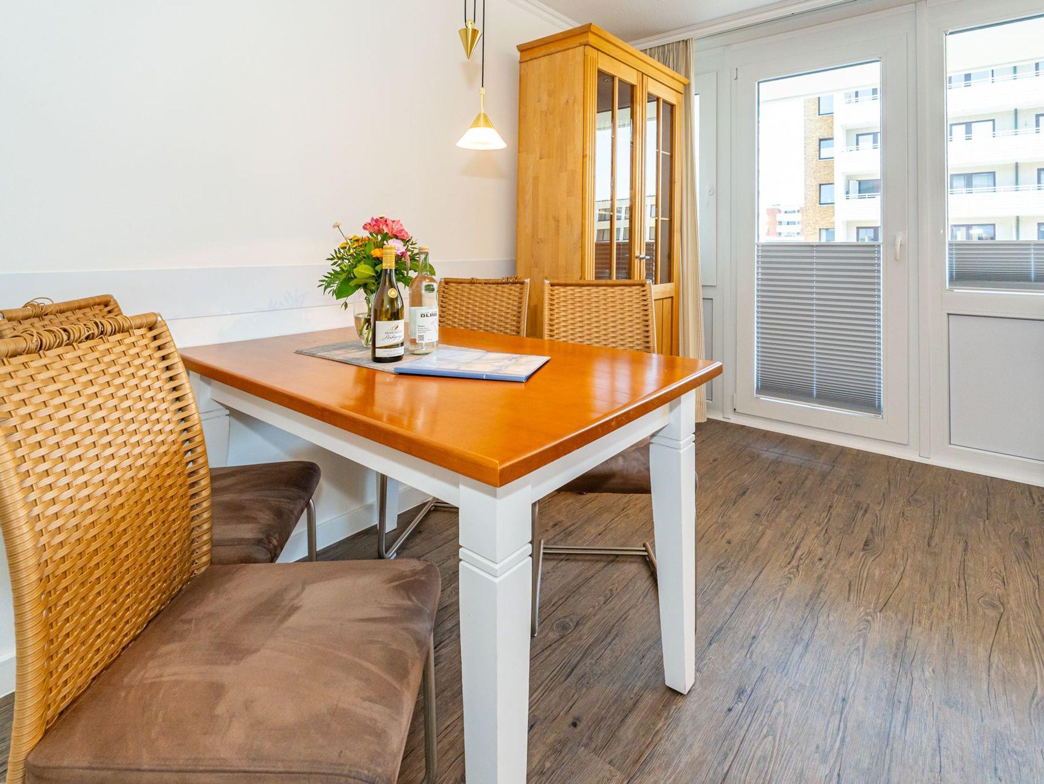 Schick renovierte 3-Zimmer-Nichtraucher-Ferienwohnung, ca. 63 qm, in der 2. Etage zur Landseite mit Ostloggia (Morgensonne, mit Balkonmöbeln und Auflagen) für max. 4 Personen (stufenfrei erreichbar).