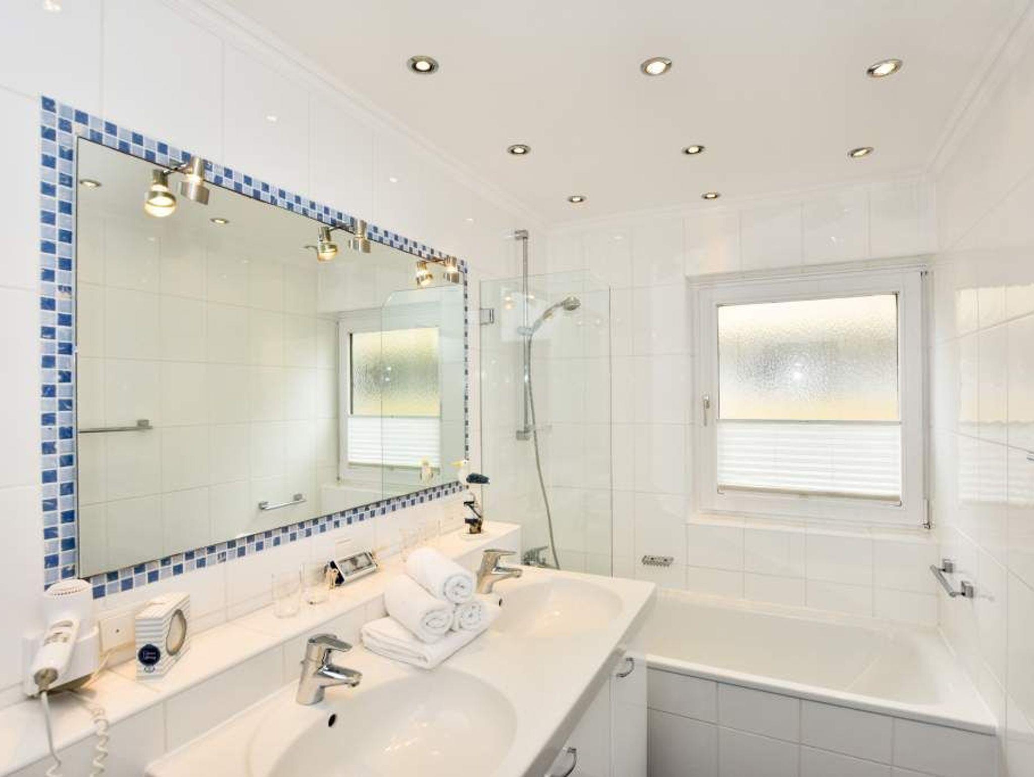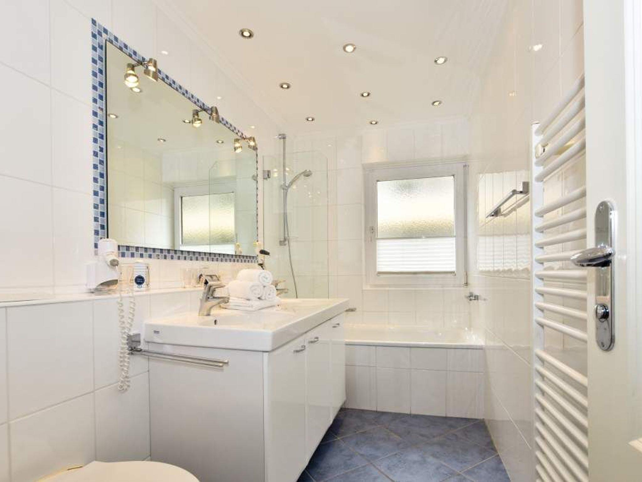 Das neue großzügige Bad hat eine Badewanne mit Duschmöglichkeit und Glastrennwand, einen Doppelwaschtisch, einen Handtuchtrockner, ein WC und einen Fön.