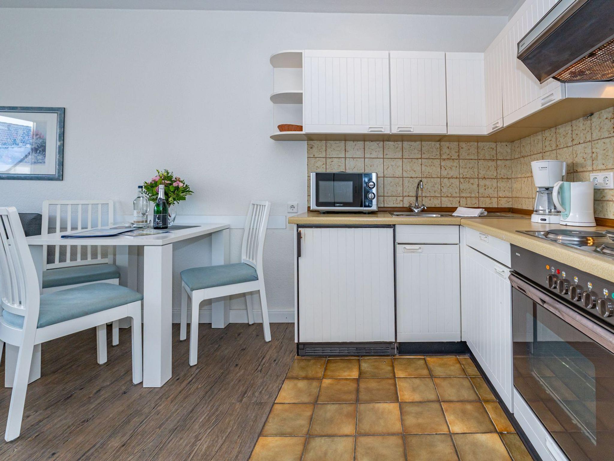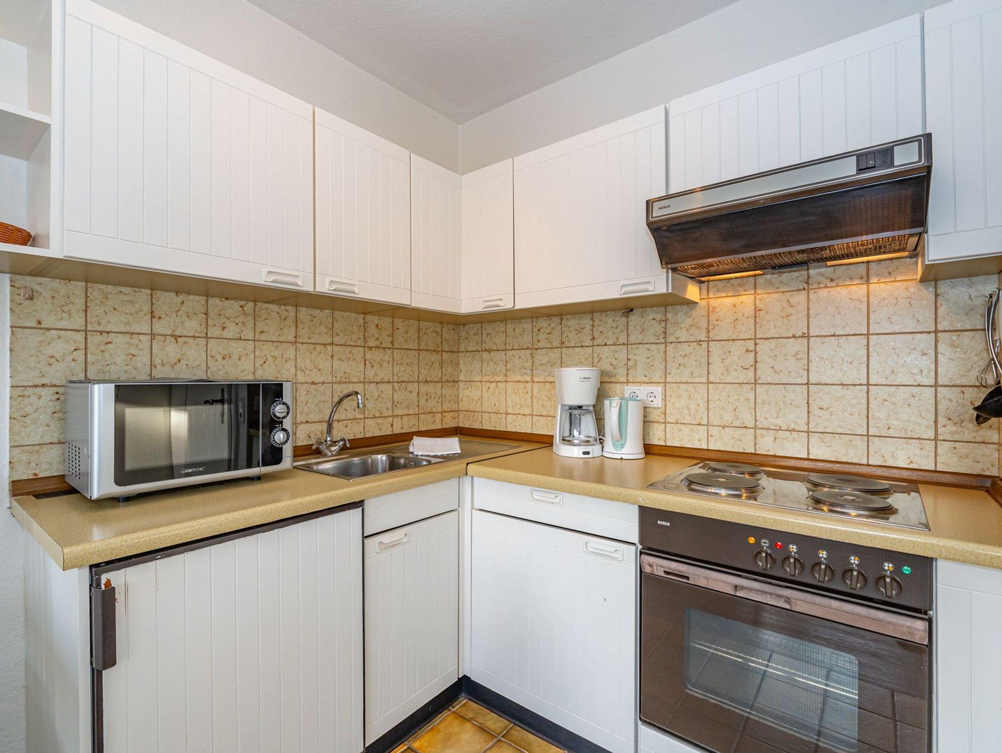 Die Küchenzeile hat einen 4-Platten-Herd mit Backofen, eine Mikrowelle, einen Kühlschrank. Kaffeemaschine, Wasserkocher und Toaster gehören zur Grundausstattung.