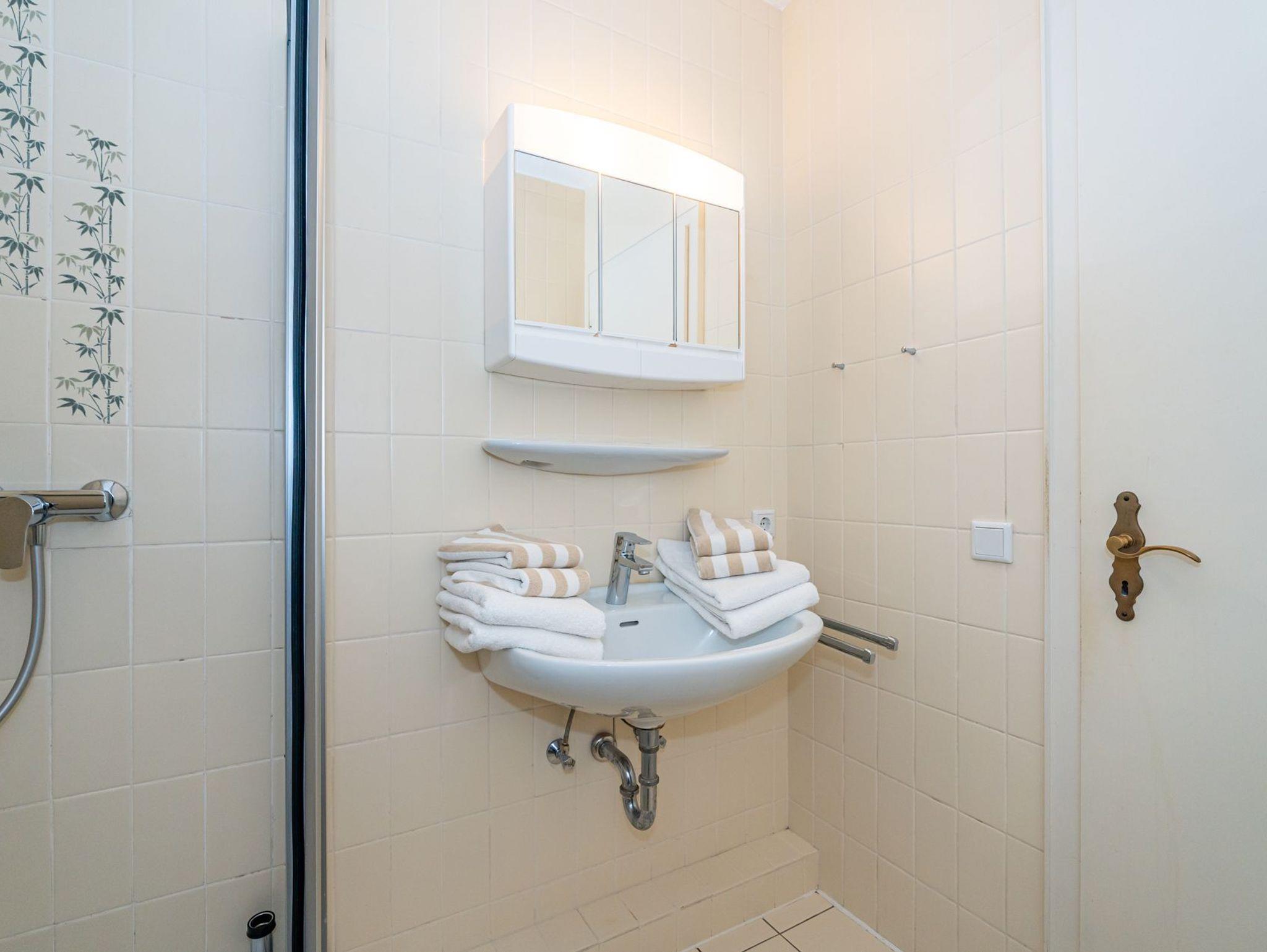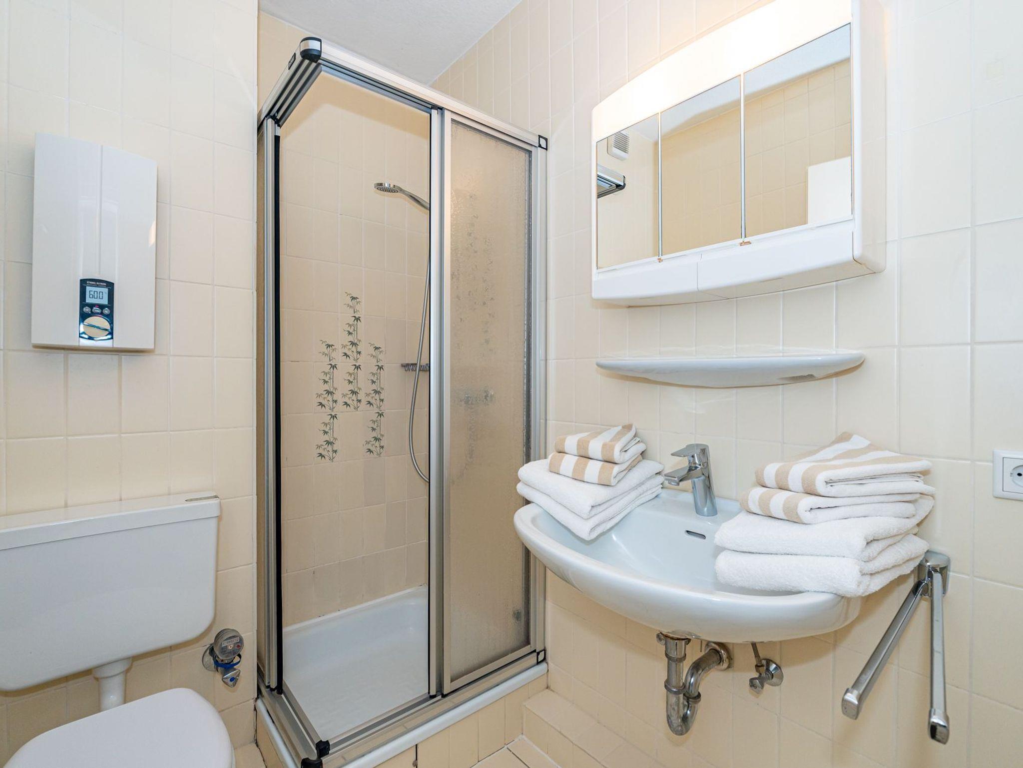 Das Badezimmer ist mit einer Dusche, einem Waschtisch und einem WC ausgestattet.