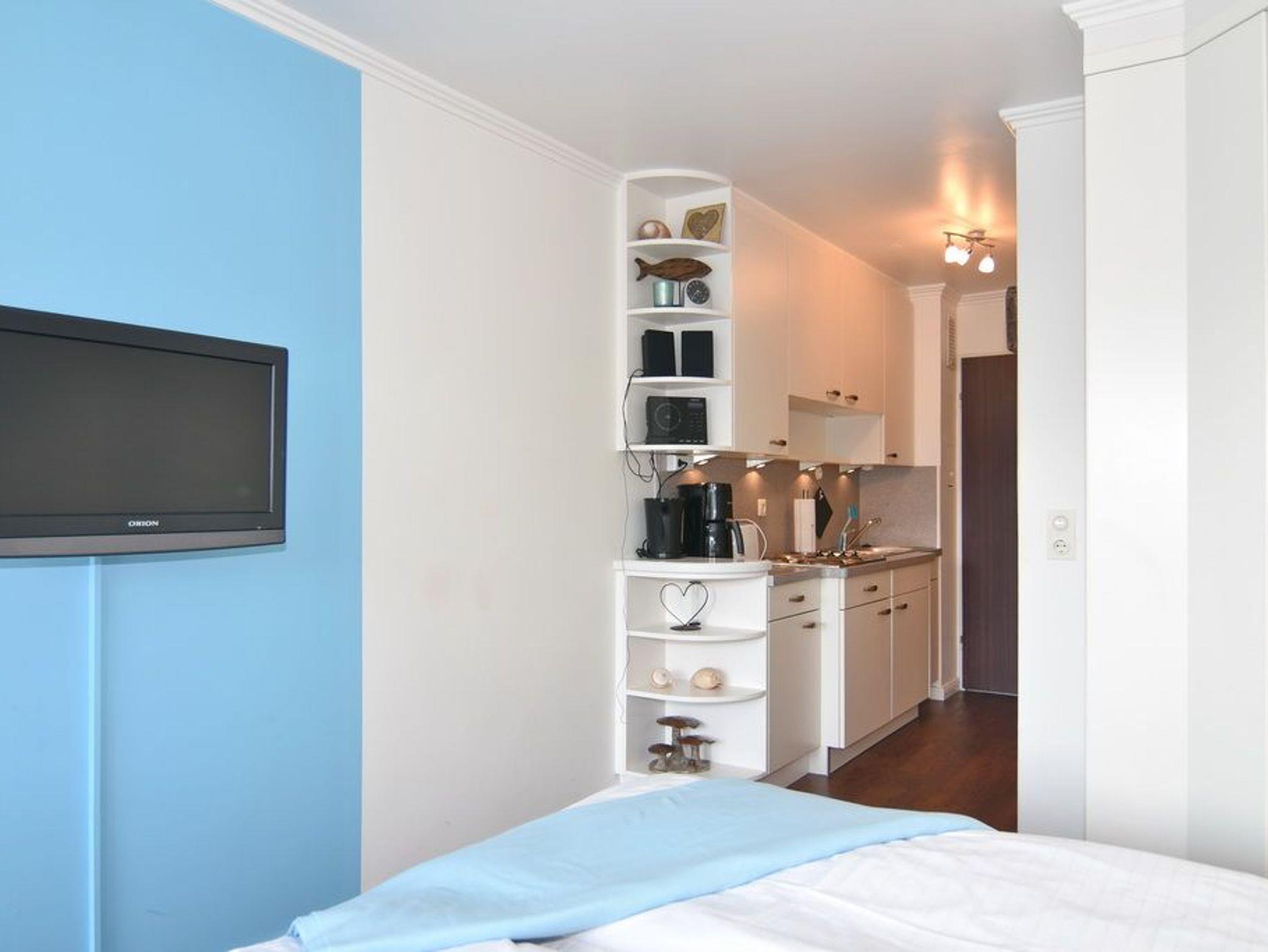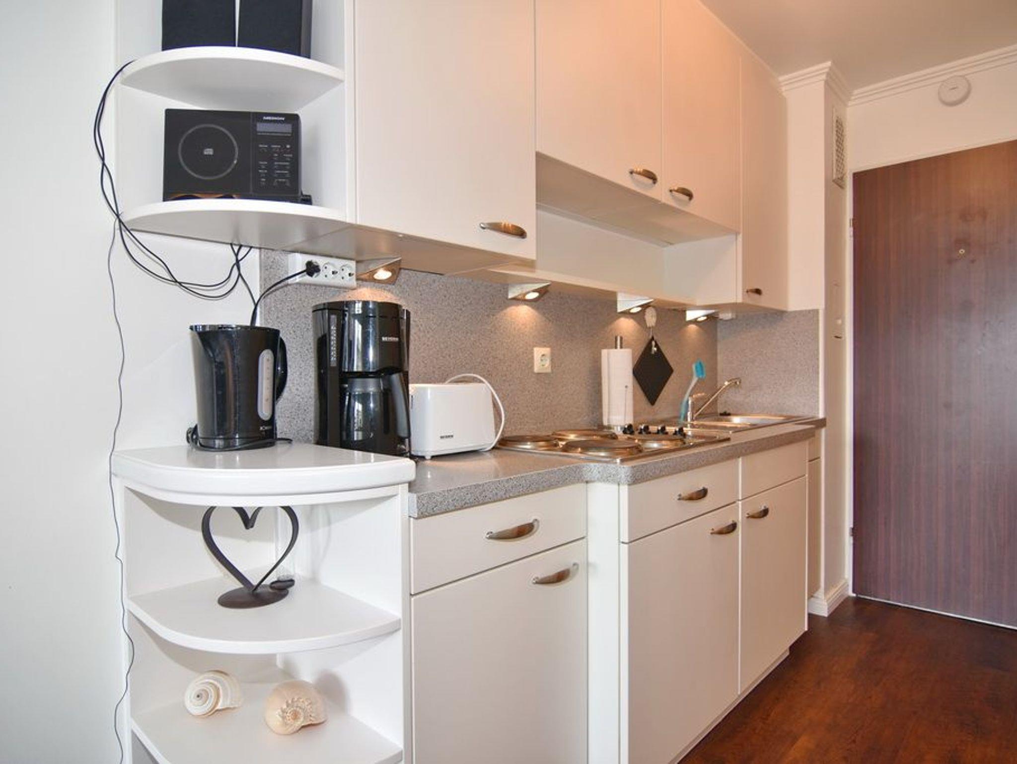 Modernes 1- Zimmer- Apartment ca. 23 m² im 1. OG, im Haus Metropol ,[nbsp][nbsp]Nichtraucher. Wohn-/ Schlafraum mit Doppelschrankbett, 2 Sessel und Esstisch am Fenster, TV, Radio, W-Lan (ohne Gewähr), Ostbalkon mit Balkonmöbeln, Küchenzeile im Flurbereich, Duschbad/ WC. Rauchen ist nicht gestattet. Bettwäsche und Handtücher sind zur Anreise aufgezogen. Ein PKW-Stellplatz kann kostenpflichtig zugebucht werden.