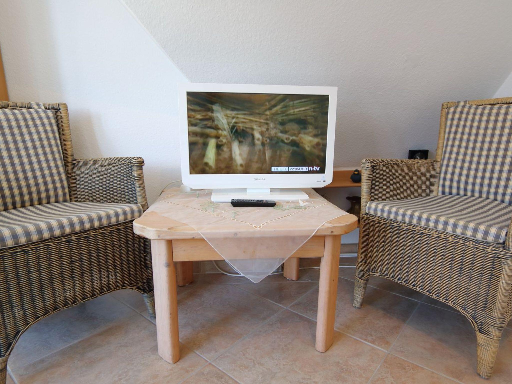 Ein helles Wohnzimmer mit großer Fensterfront zum möblierten Balkon und Dünen mit Sitzecke und Strandkorb. Großer Smart-Tv mit Sat-Anschluß, Eßecke und Couchgarnitur, W'Lan, DVD-Player und Telefon mit Flatrate für das deutsche Festnetz.