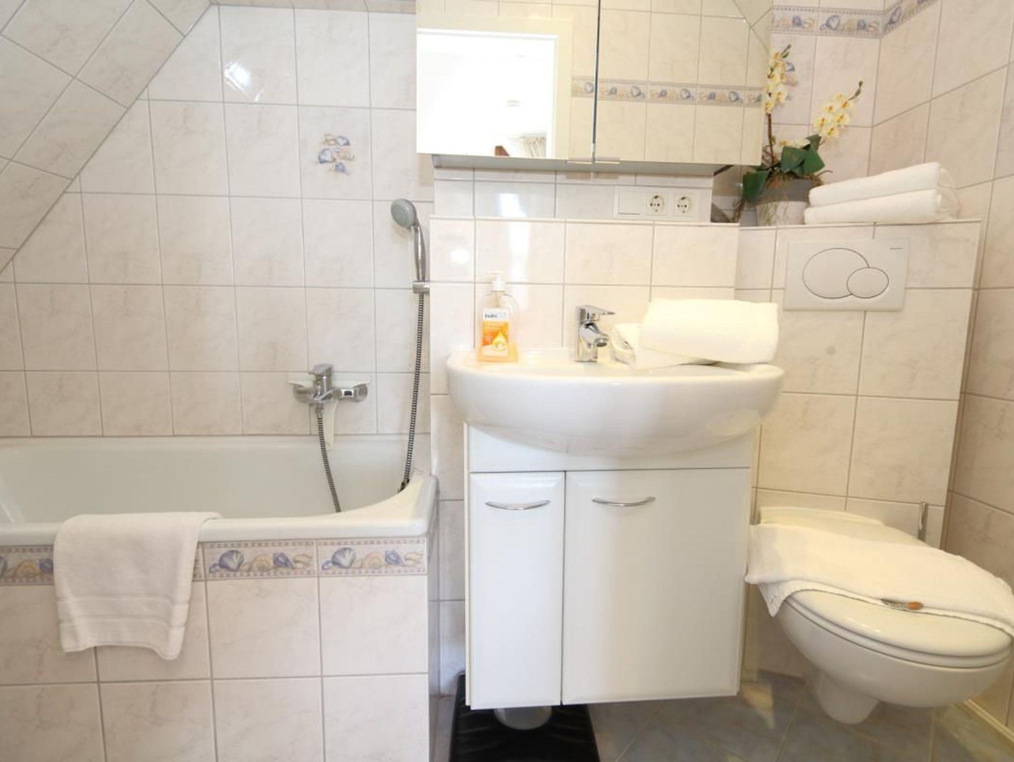 Badezimmer mit Dusche, WC, Waschtisch. Ausreichend Handtücher und Vorleger.